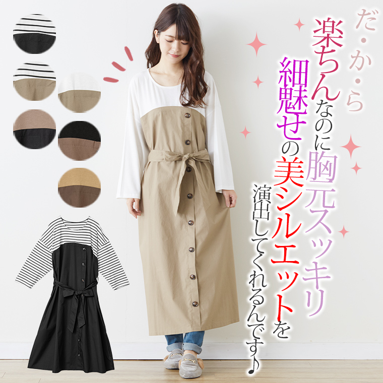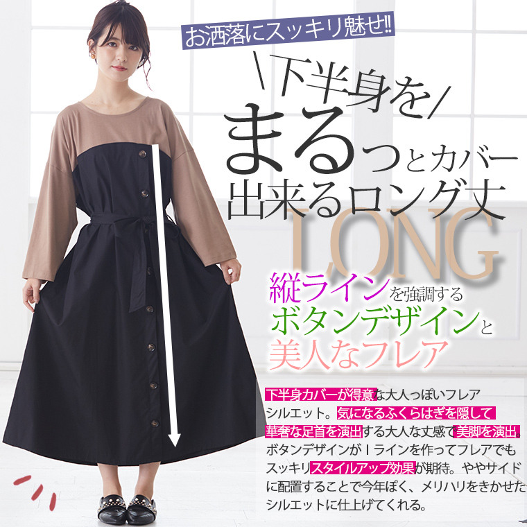 大きいサイズ 楽ちん 美人な 大人の 細魅せ ボタンデザイン 長袖 ドッキングワンピ