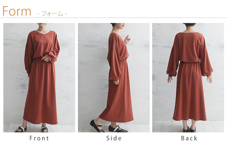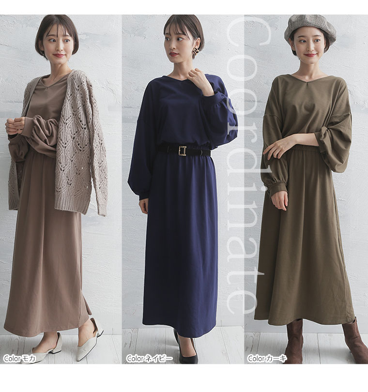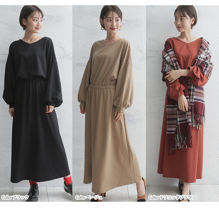 ゆるっと楽ちん!着ぶくれ回避の美人シルエットウエストゴムミニ裏毛ロングワンピース