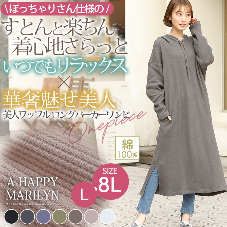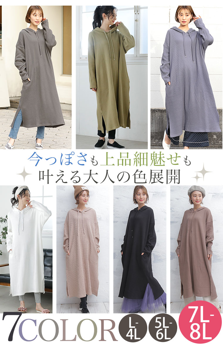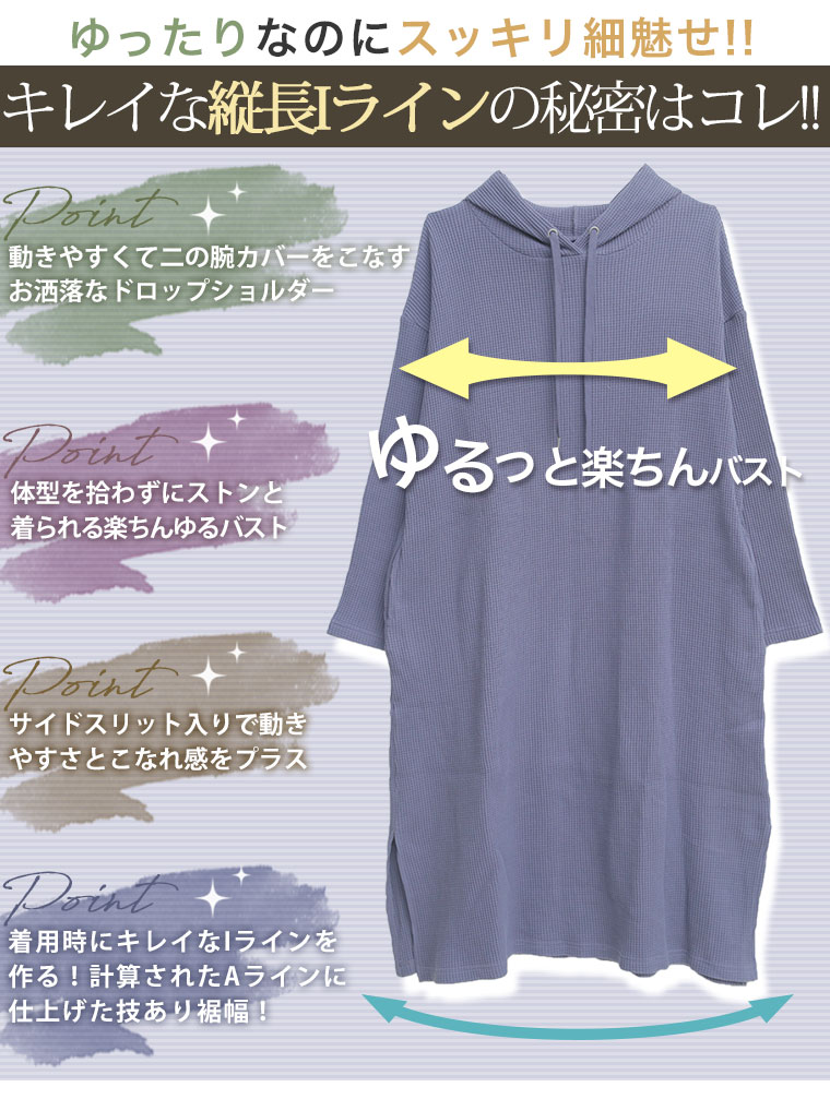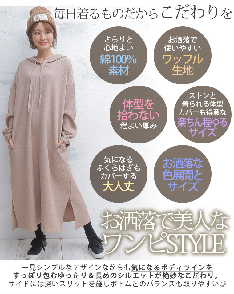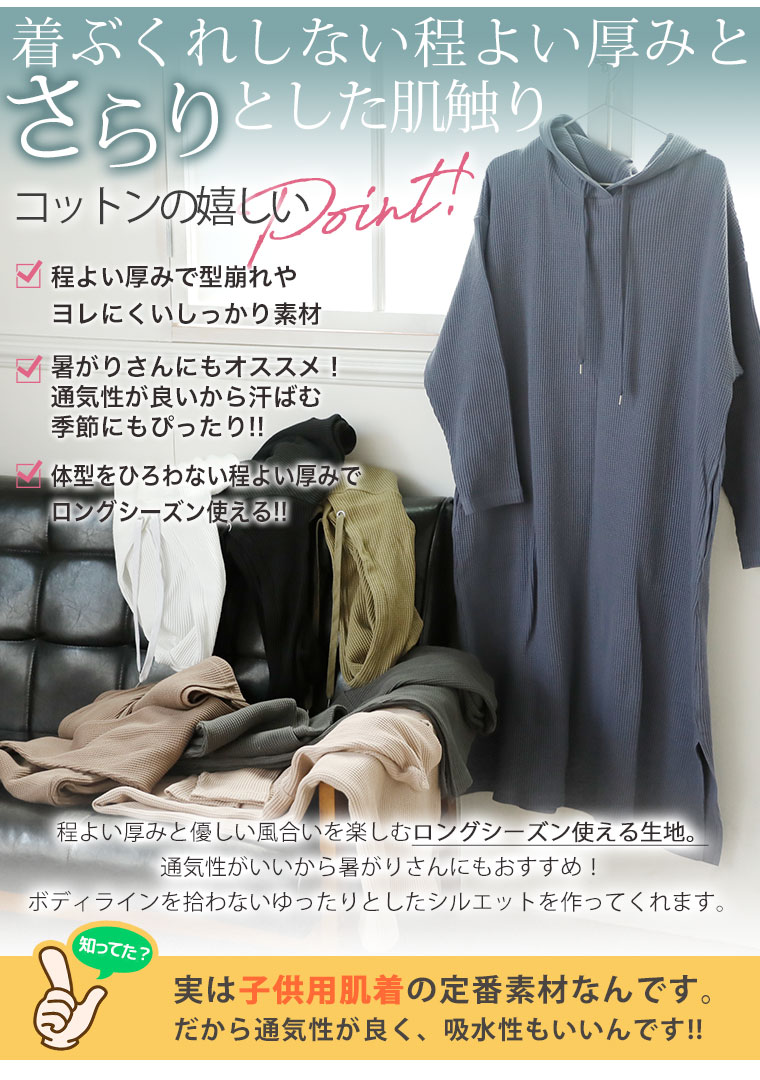 綿100% すとんと楽ちん 華奢魅せ美人USAワッフルロングパーカーワンピース
