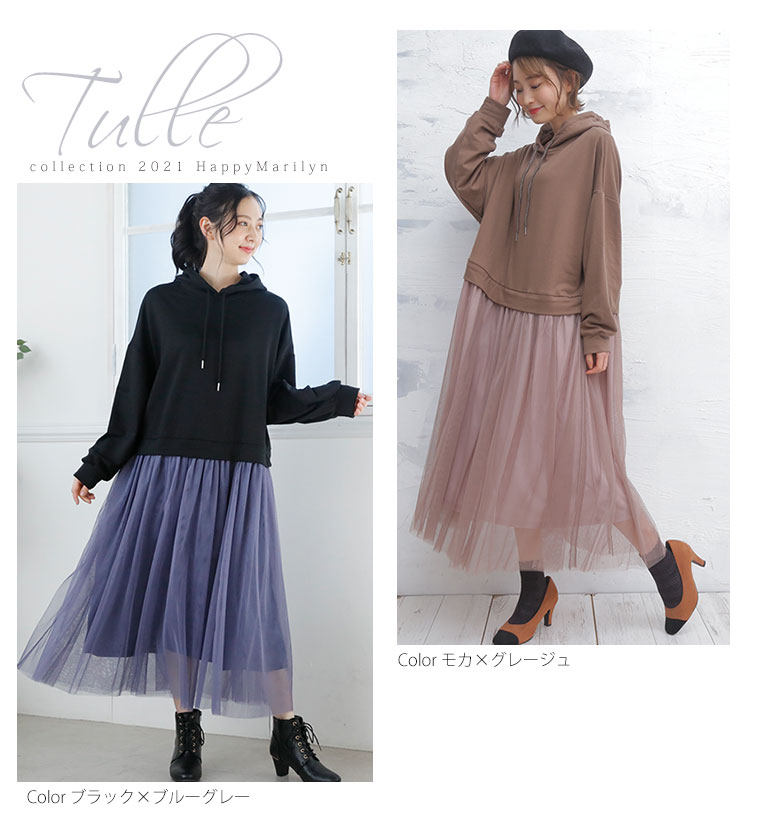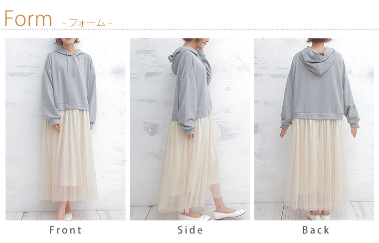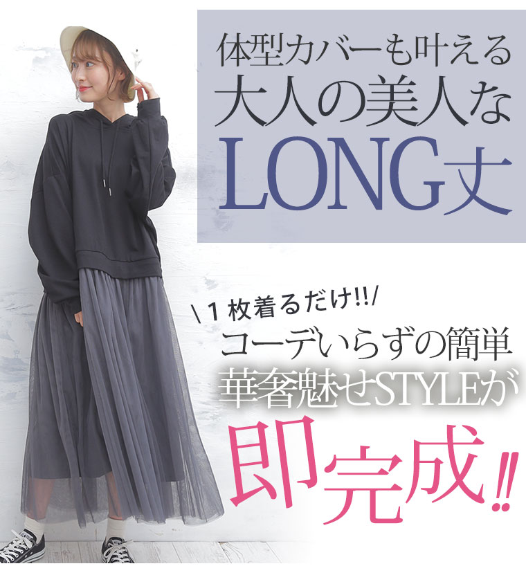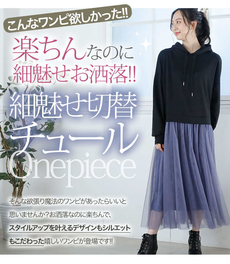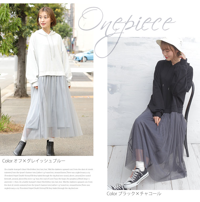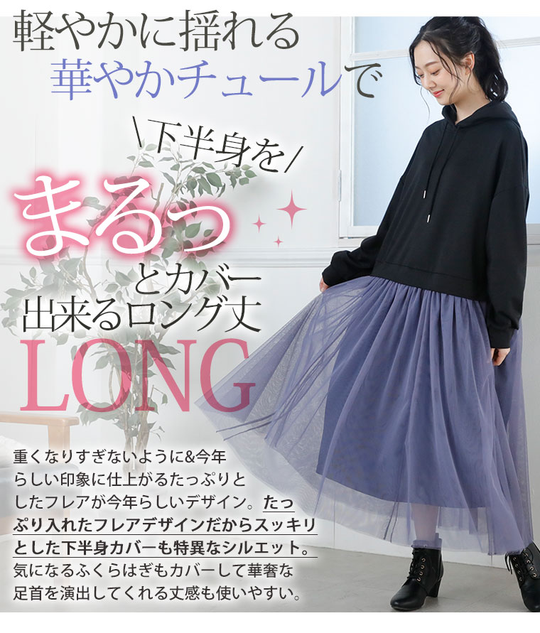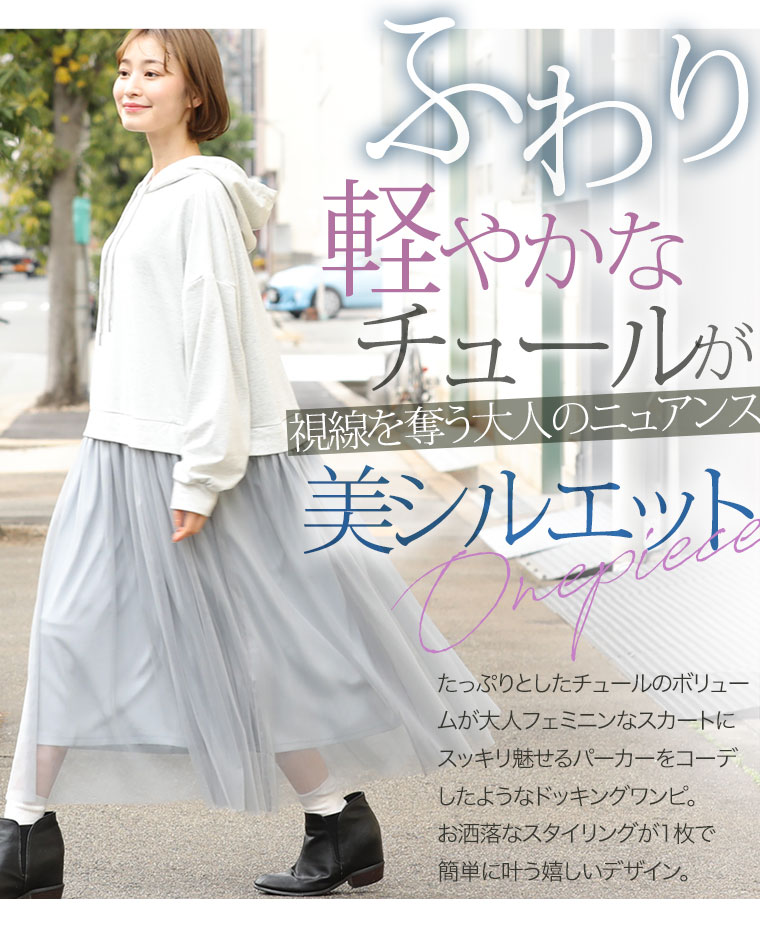 1枚着るだけ!ふわりと軽やかなチュールが美シルエットのドッキングパーカーワンピース