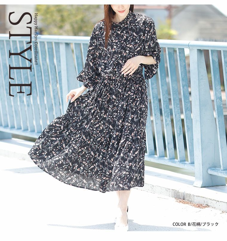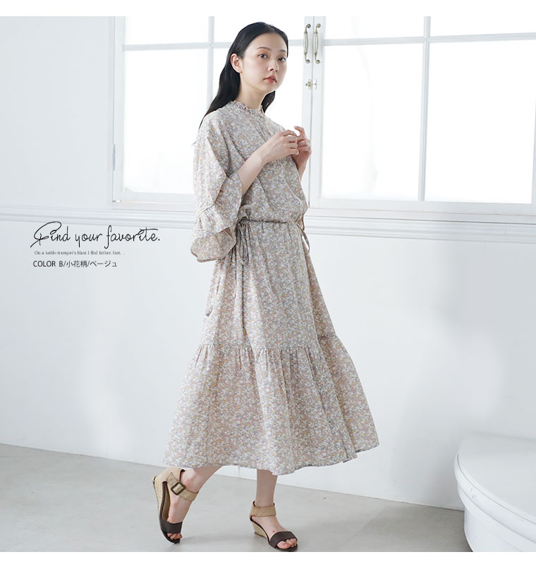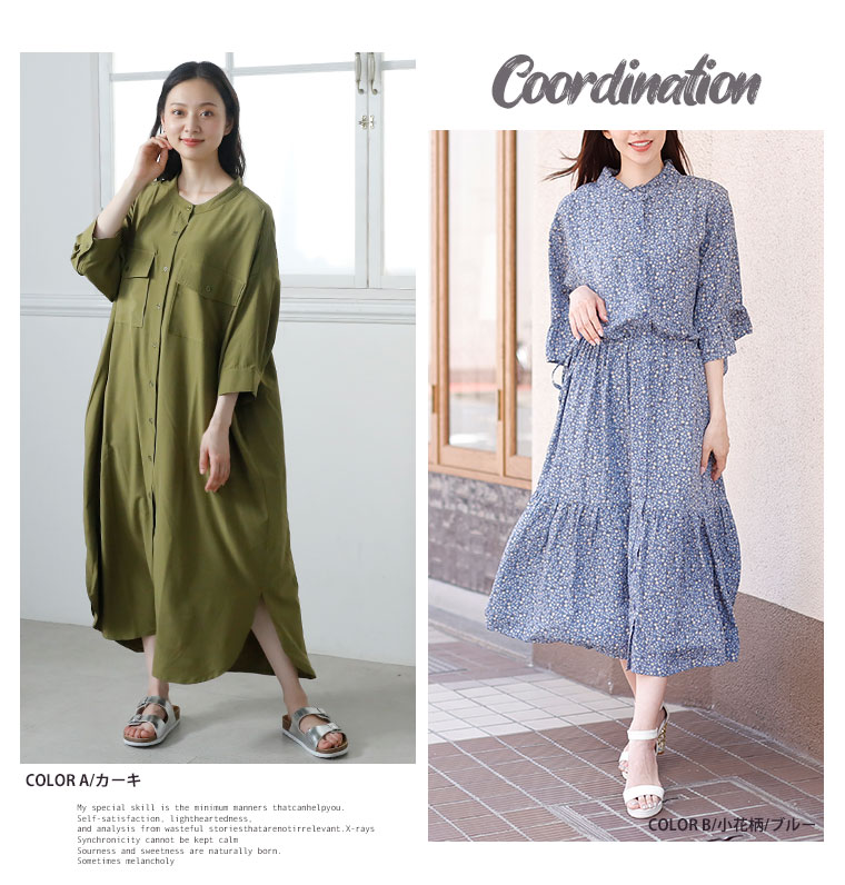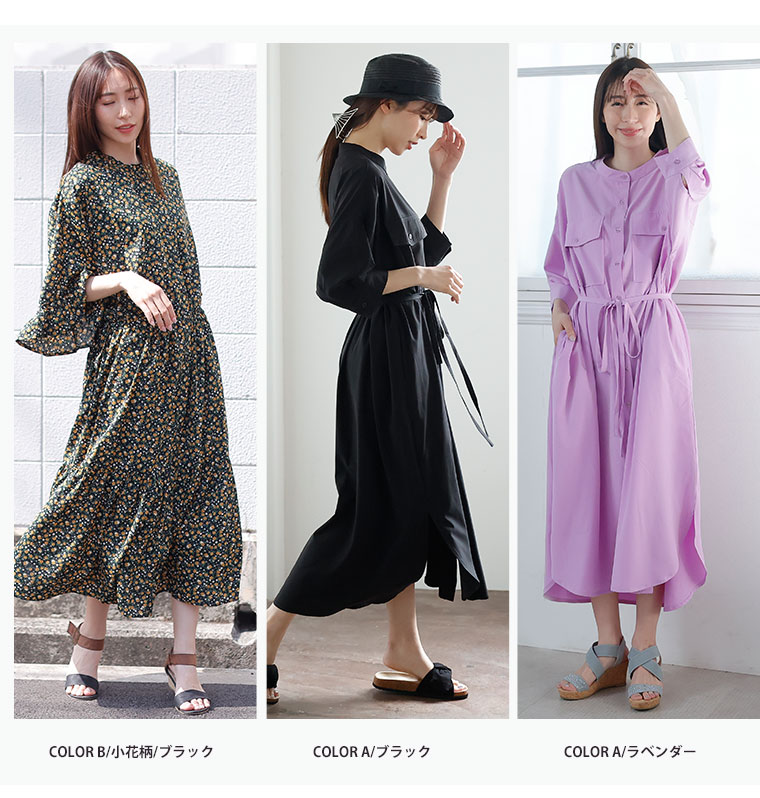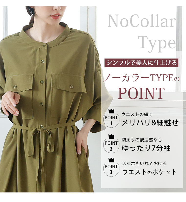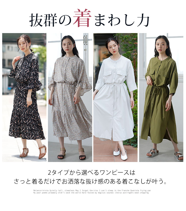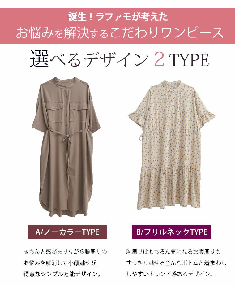 ノーカラー、フリルネックの2種類から選べるワンピース