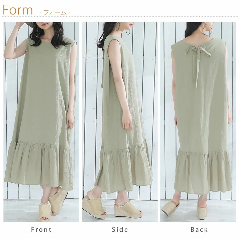 4. 大きいサイズ 涼しげ素材 の 細魅せ 切替 ギャザー ノースリ バックリボン ワンピ