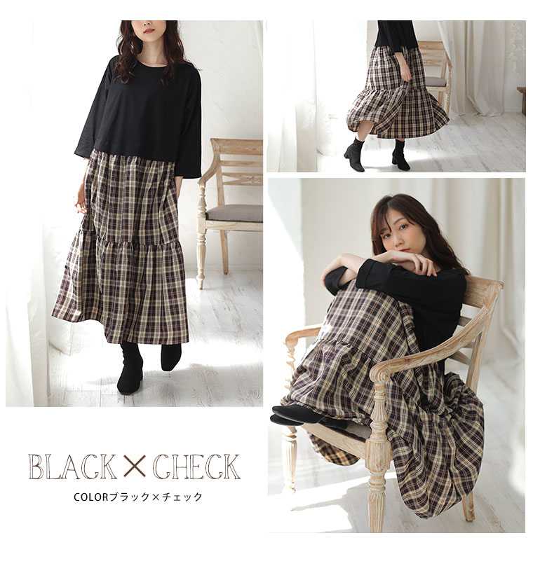 オリジナル ワンピ LL 3L 4L 5L 6L 7L 8L 秋 七分袖 お腹 太もも 新色追加!! すとんと楽ちん美人!綿100% トップス × ティアード の着心地美人な ドッキングワンピース