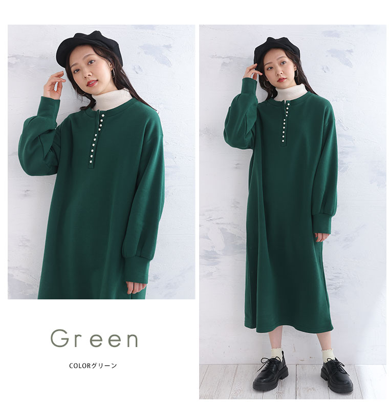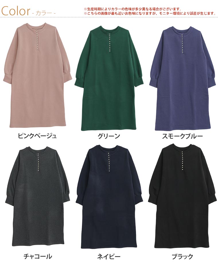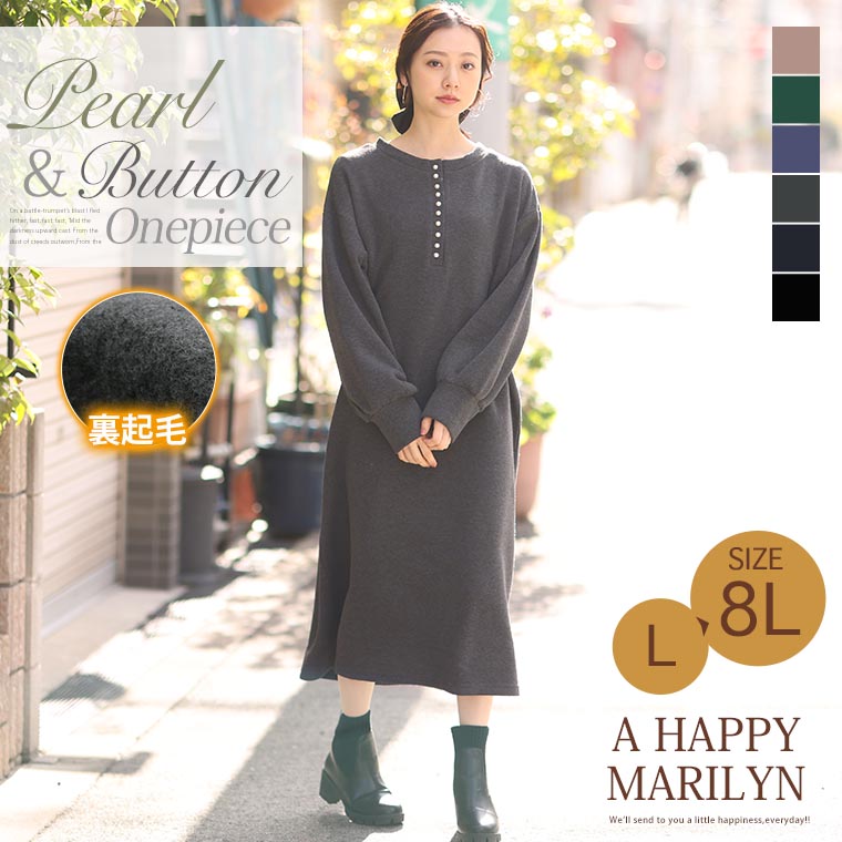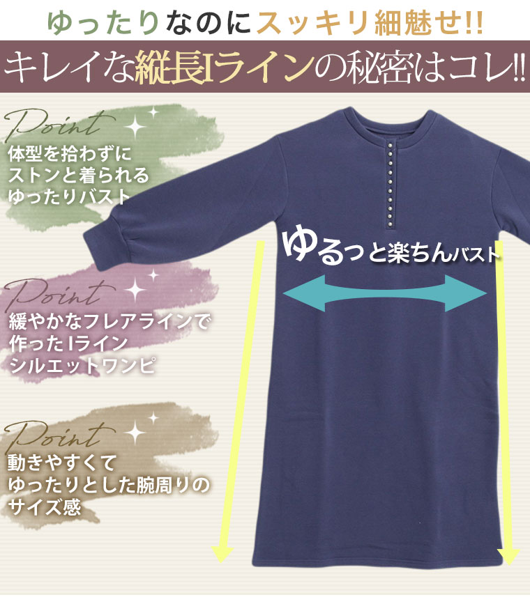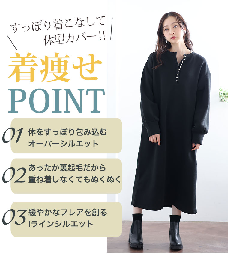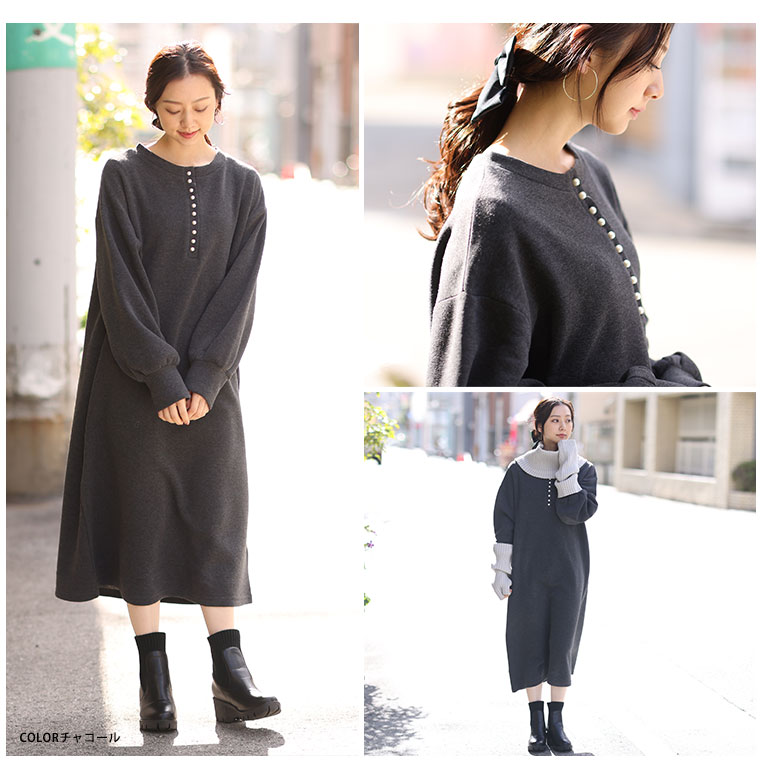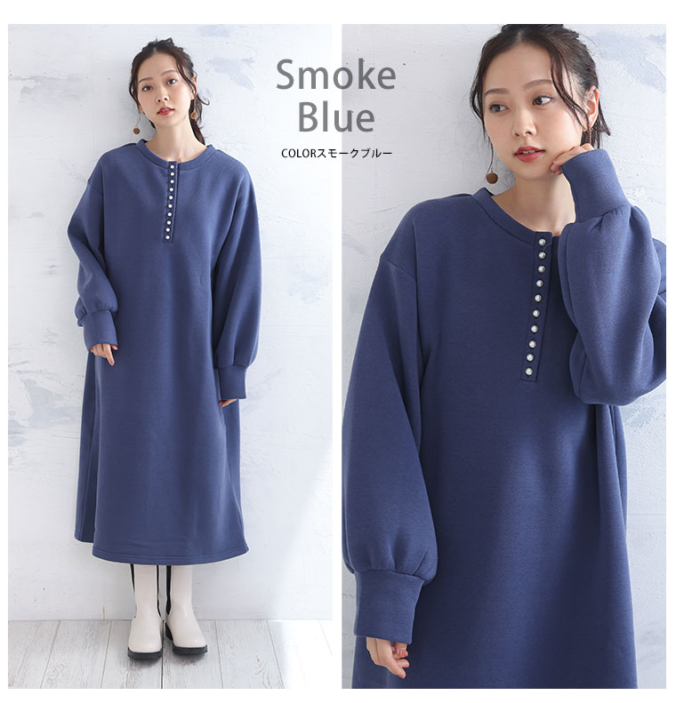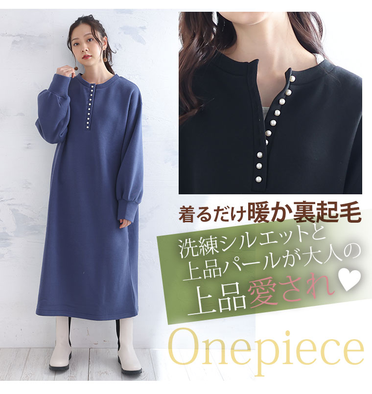 着るだけ暖かオシャレ!裏起毛パールボタンAラインワンピース