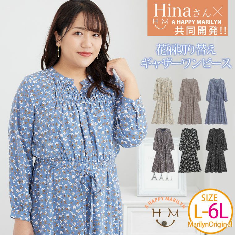 SNSで大人気!Hinaさんコラボ 花柄切替 ギャザーワンピース