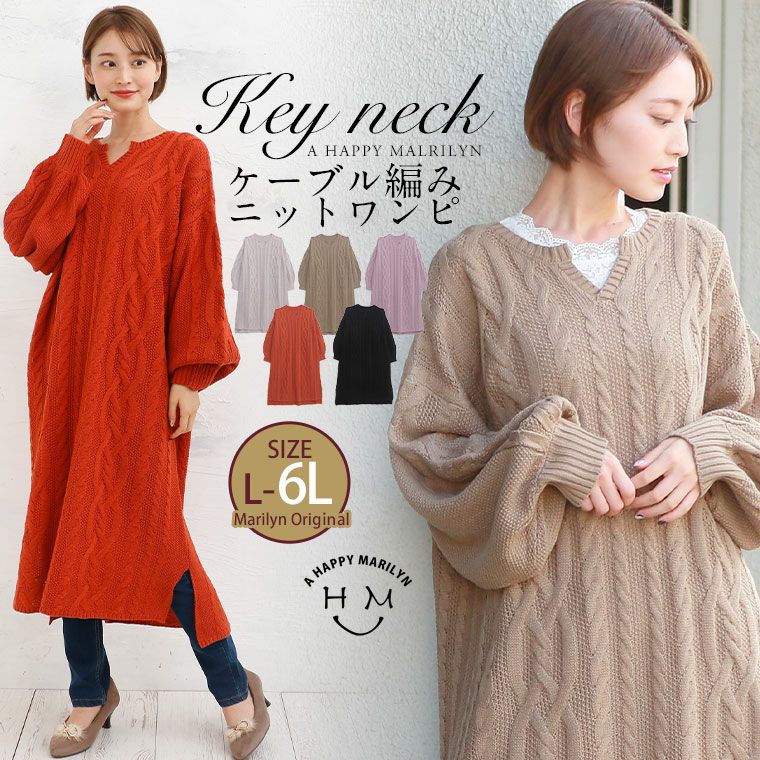 スッキリ魅せが叶う ポワン袖ケーブル編みキーネックワンピ