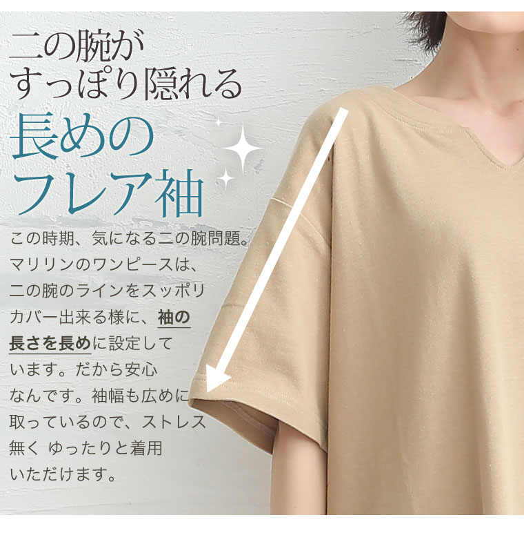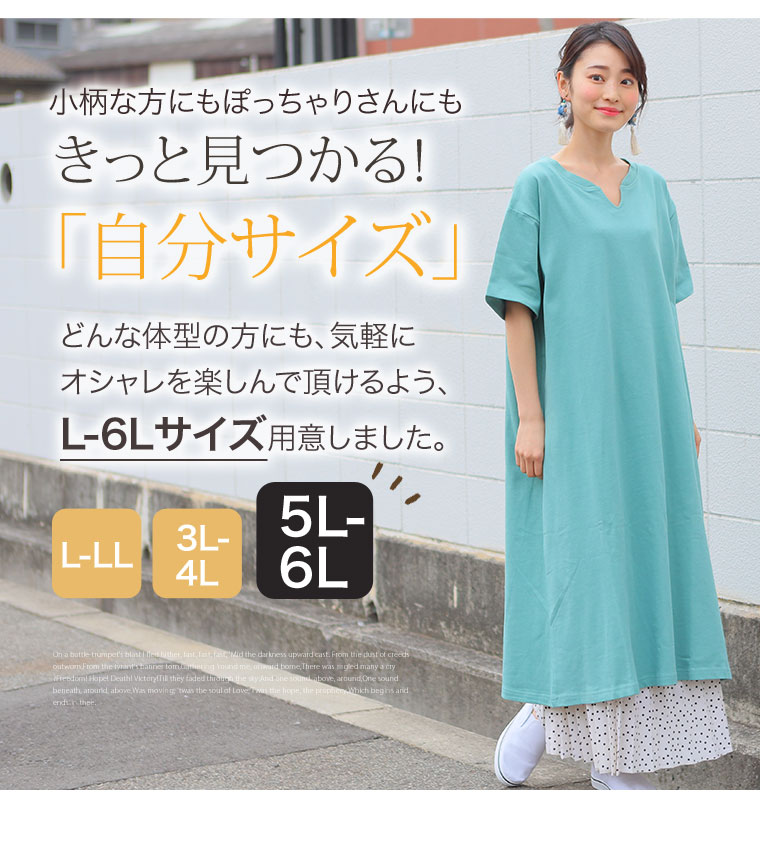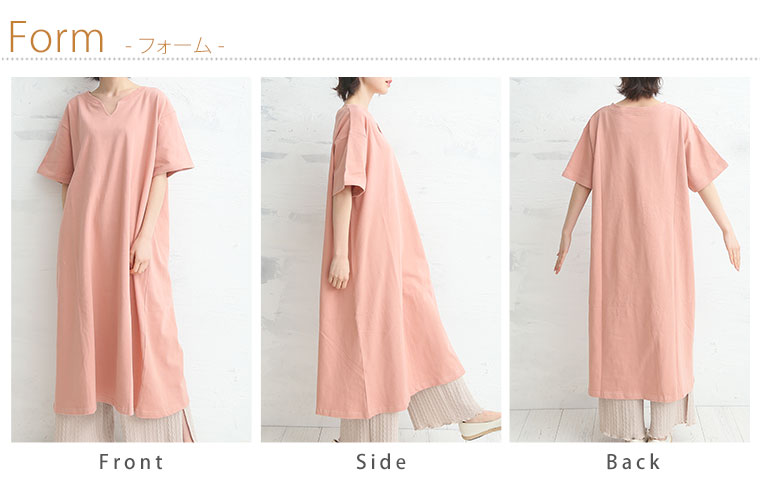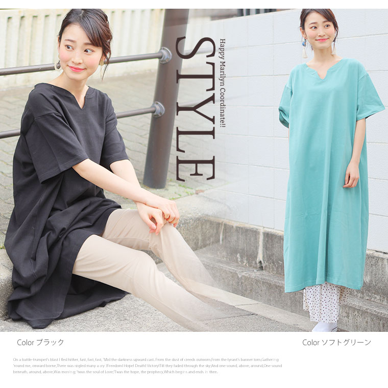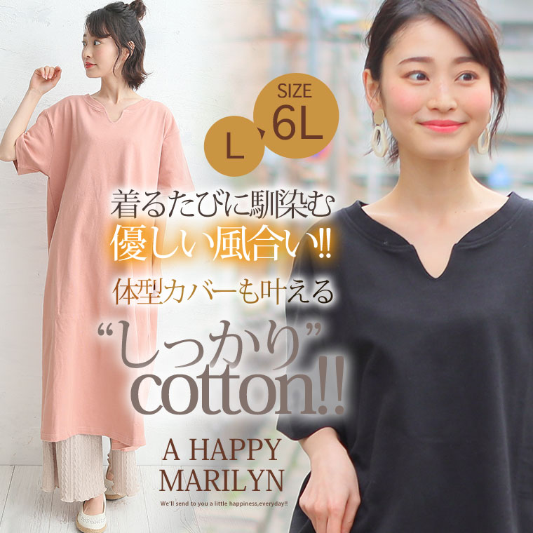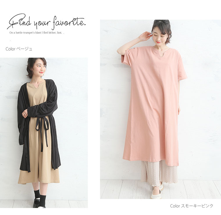 ゆったりサイズですっぽり着こなす綿100%のキーネックワンピース