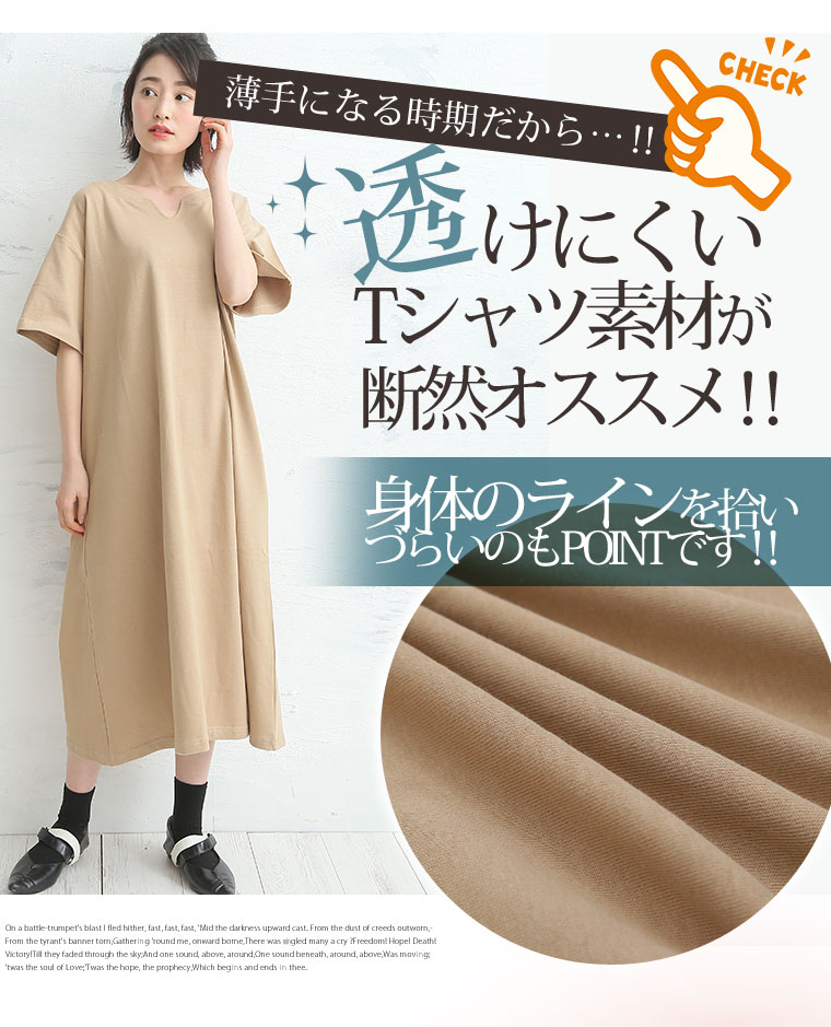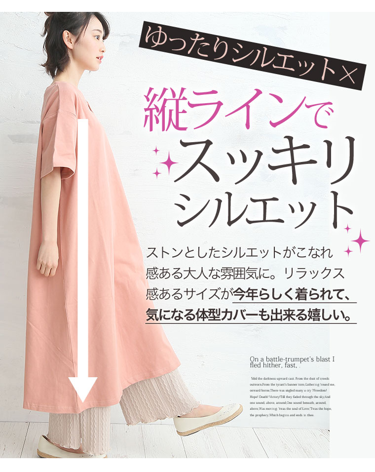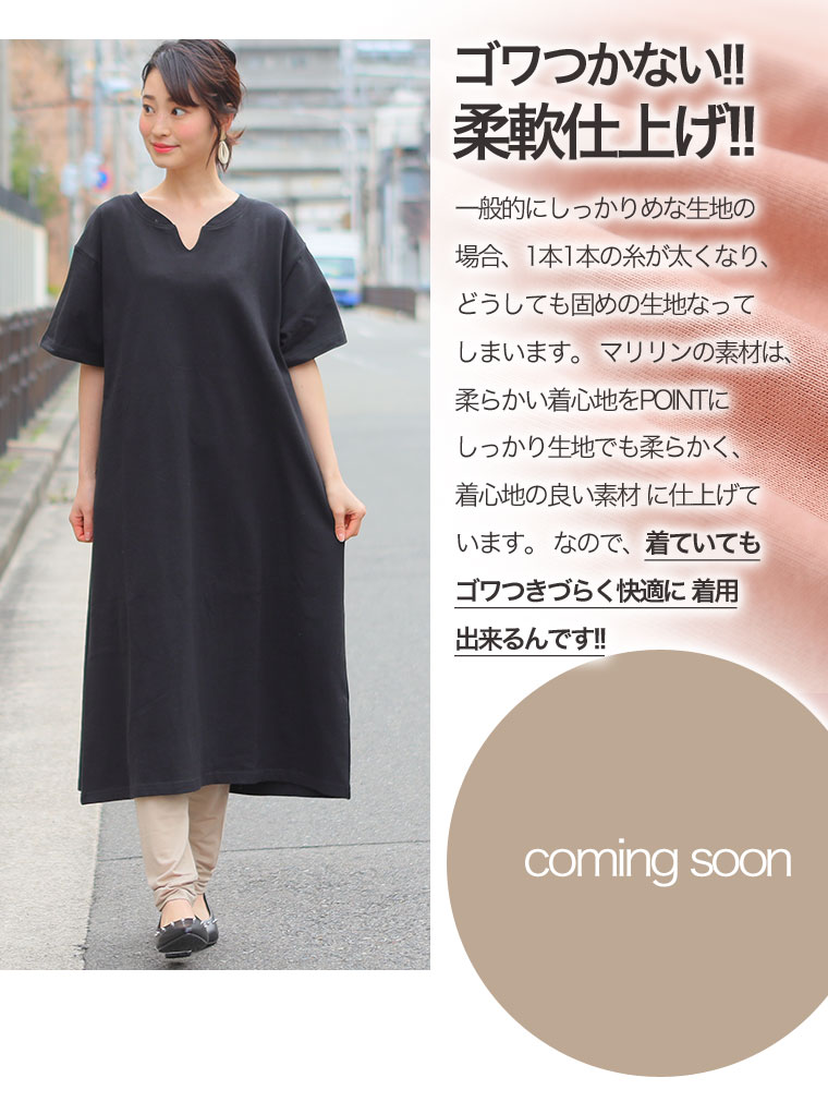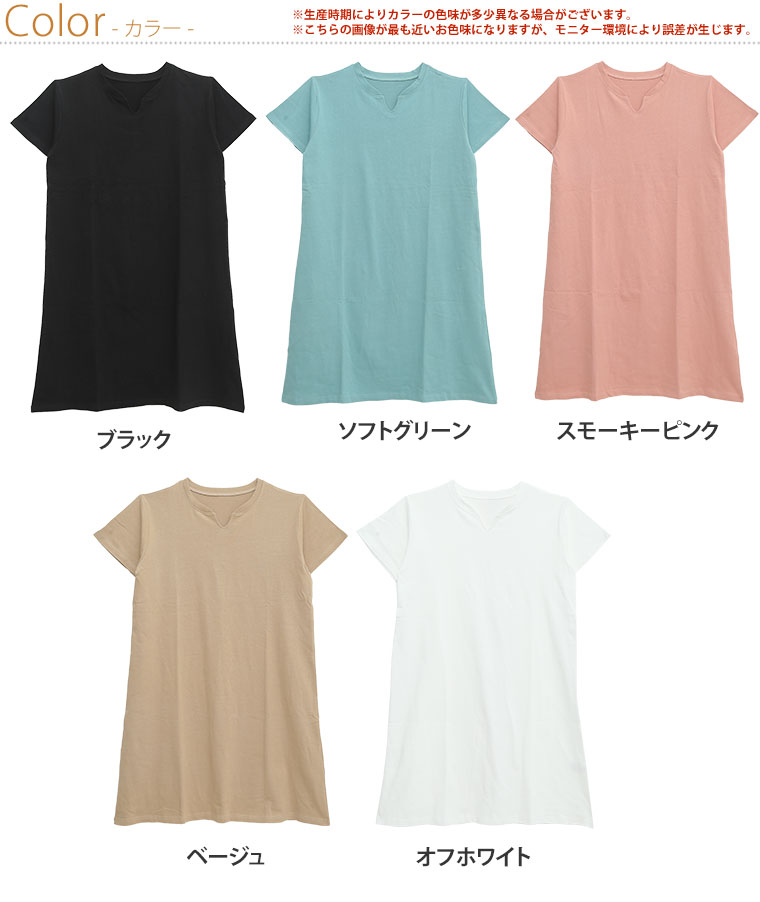 ゆったりサイズですっぽり着こなす綿100%のキーネックワンピース