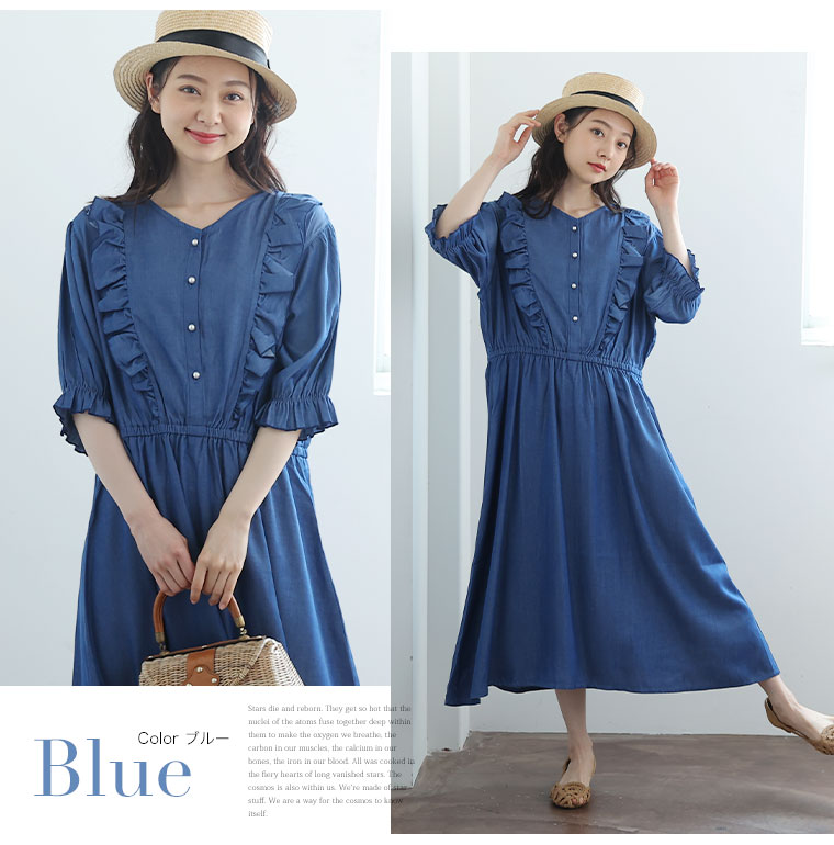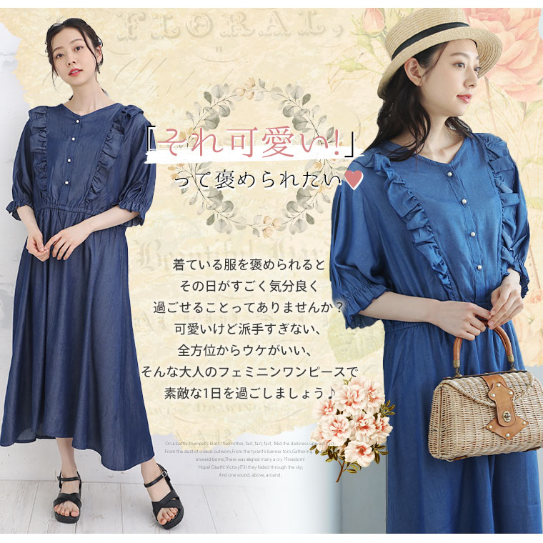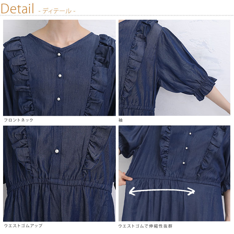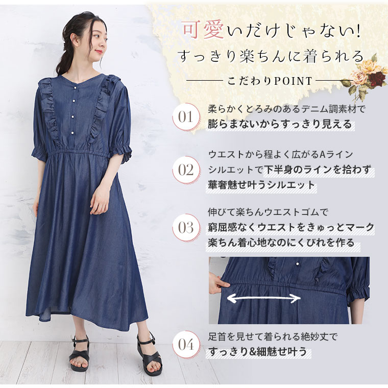 大きいサイズ フリルが甘かわいい やわとろ デニム調 ワンピース