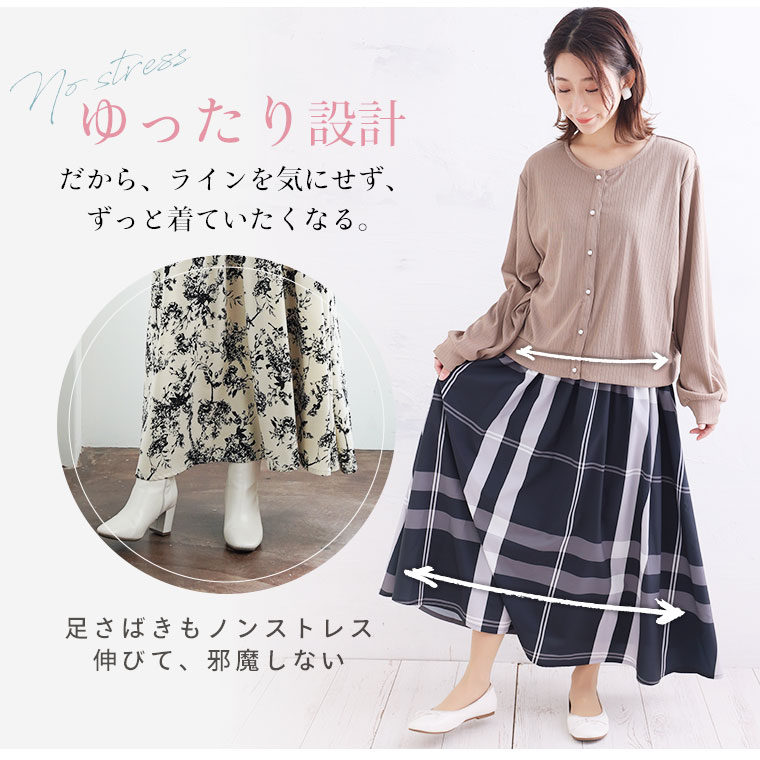身長:154 丈感:ちょうど 購入サイズ:ロング丈/3L-4L ベージュ×ピンクチュール 着用感:普通 ストレッチ感:よい カラーについて 思っていたよりもかわいいデザインで、これから着るのが楽しみです!