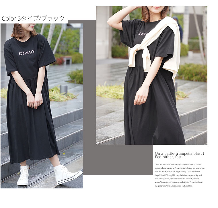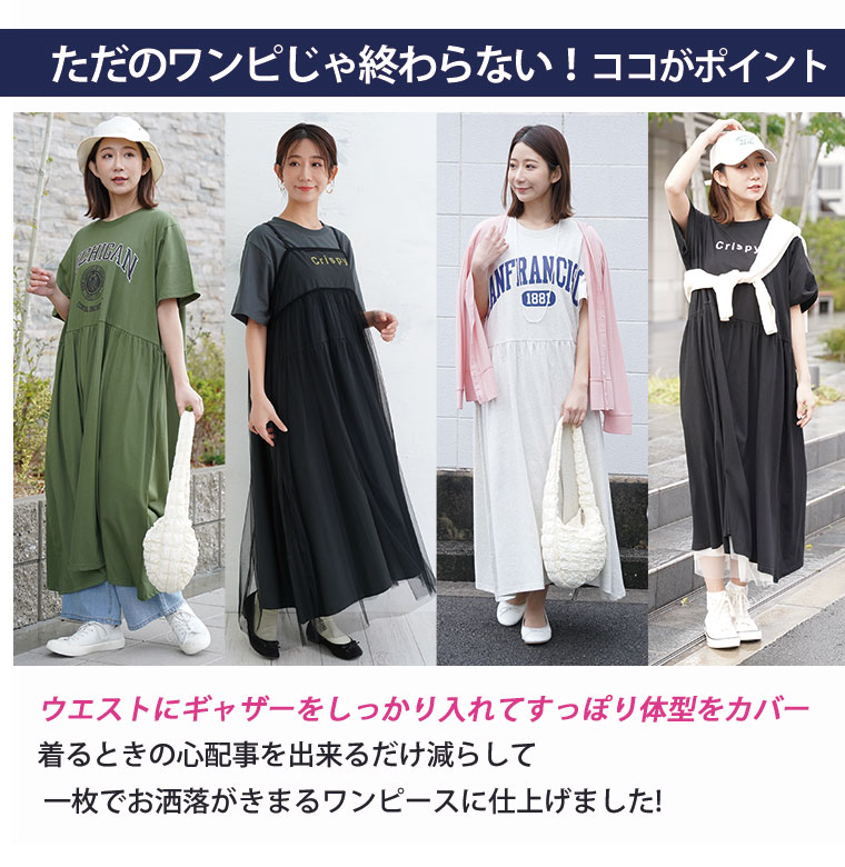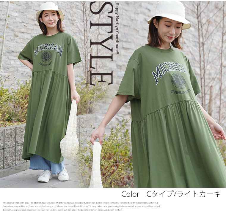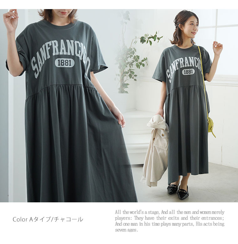 カジュアル可愛いロゴT シャツを ウエストギャザーをしっかり入れて ふんわりワンピースにしてみました!