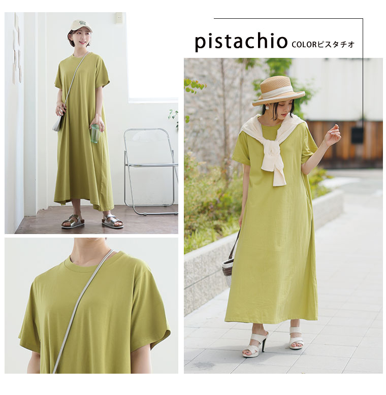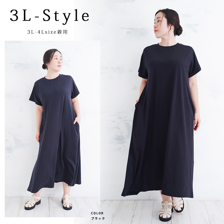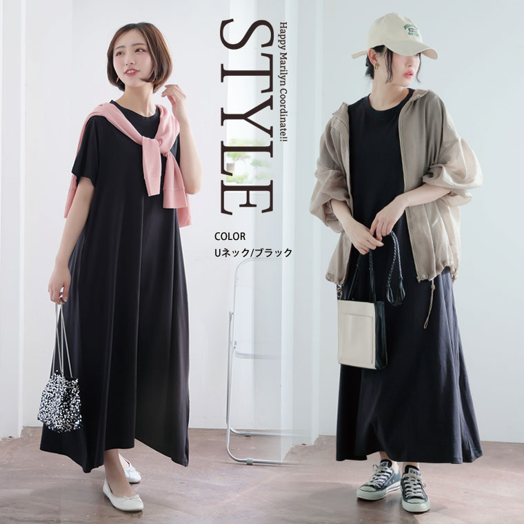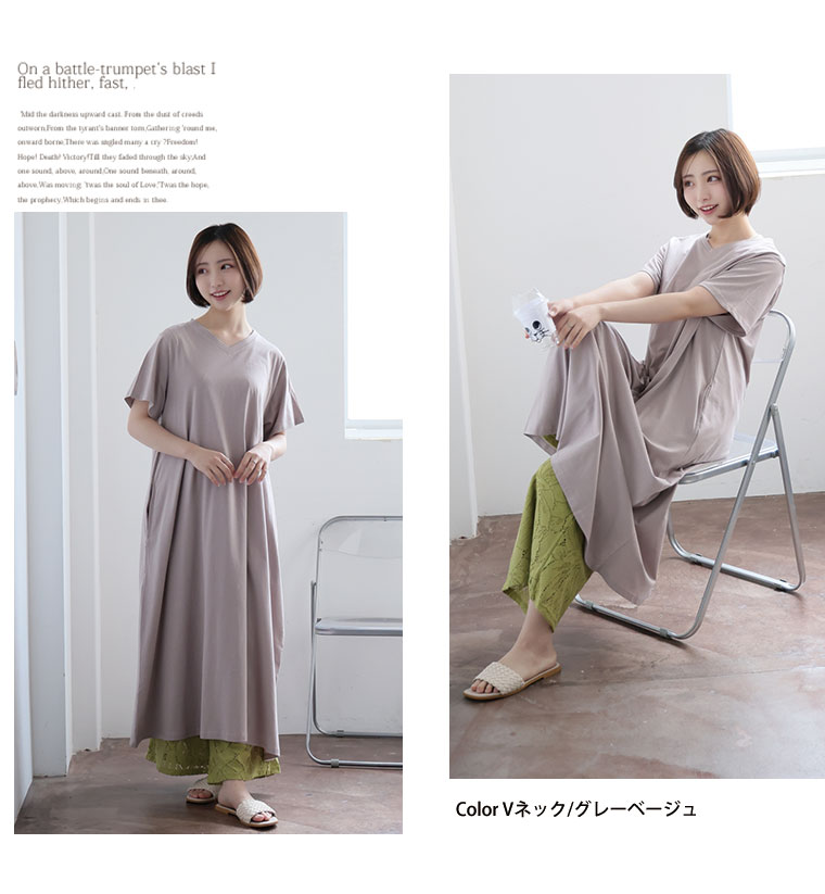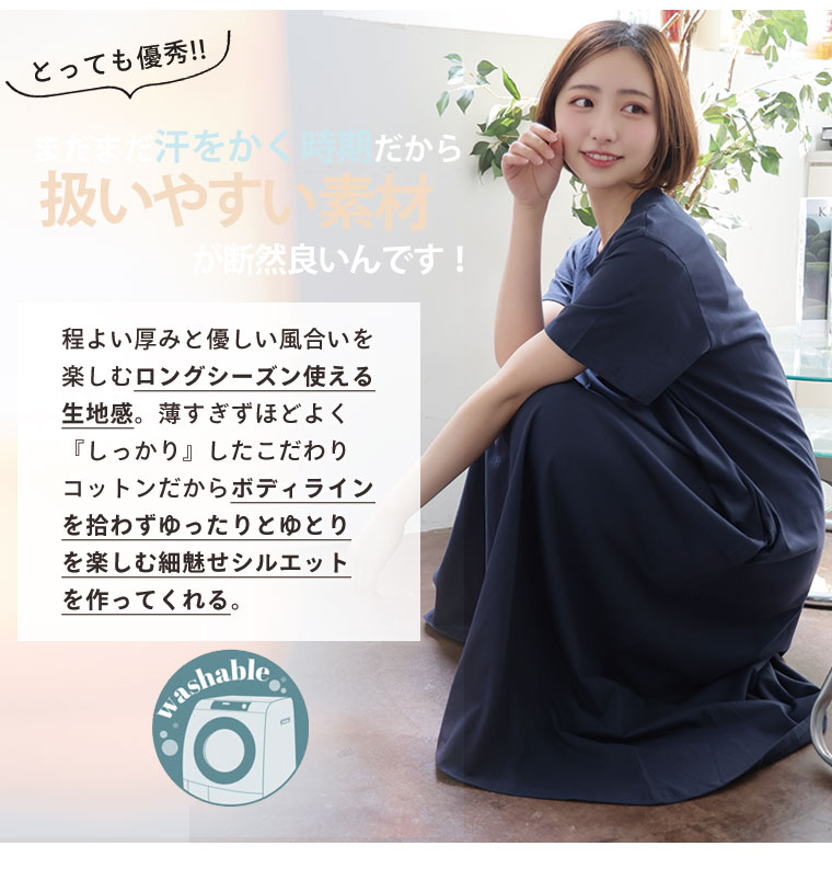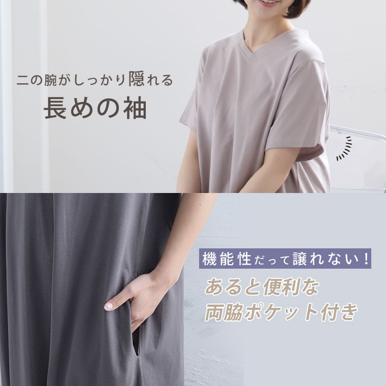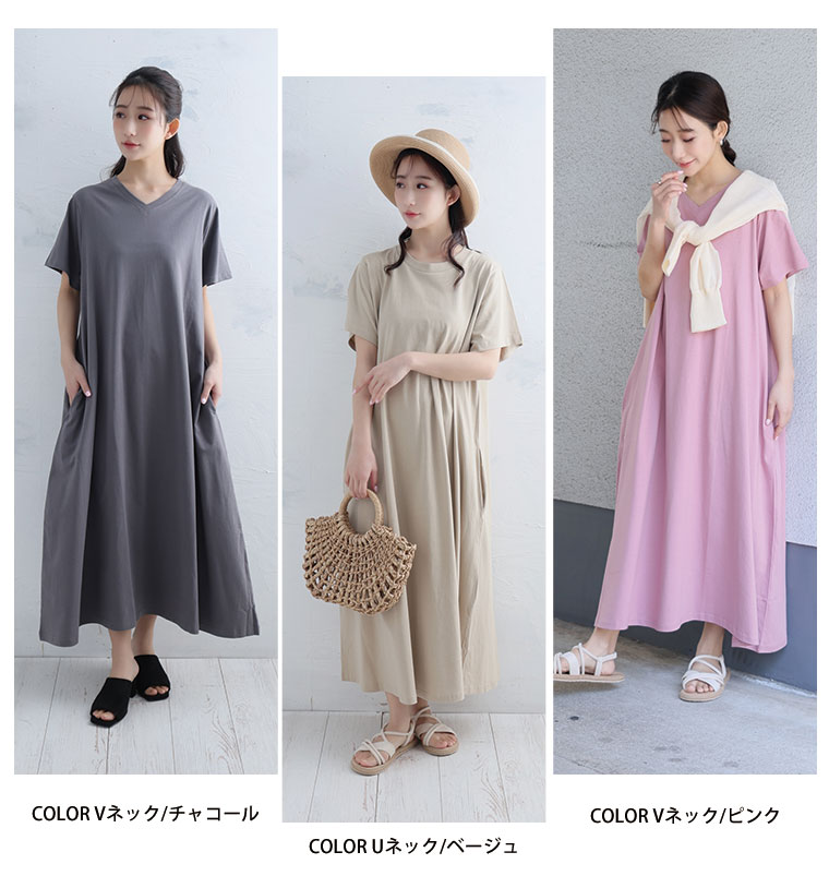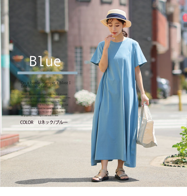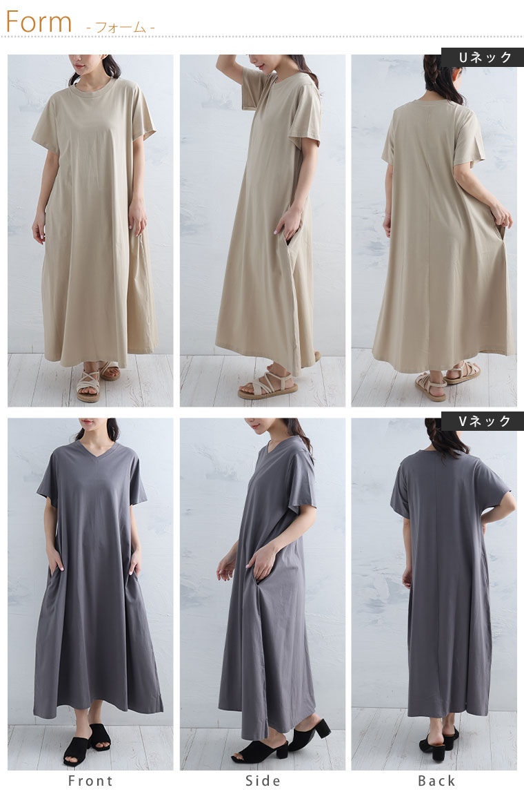 ■着用感:ゆったり、■着丈:足首、■バスト:ややゆったり、■腕回り:ややゆったり、■袖口:ややゆったり、■袖丈:半袖、■首回り:ちょうどいい、■ウエスト:-、■ヒップ:-、■太もも:- ●体型を拾わず身体のラインをきれいに隠してくれます!シンプルで王道なデザインなので幅広いシーンで活躍してくれそうです◎