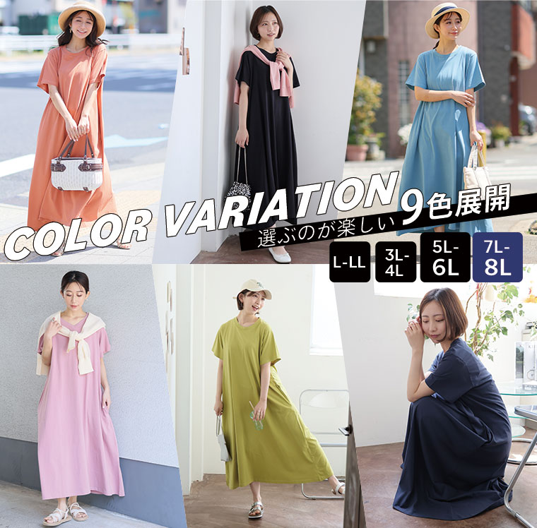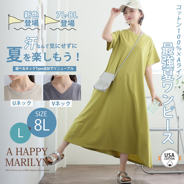ワンピ デザインワンピ LL 3L 4L 5L 6L 7L 8L 半袖 夏 夏物 夏服 夏用 ぽっちゃり ゆったり 綿 二の腕カバー お腹 お尻 新タイプ・新色・サイズ追加!! USAコットン ネック選べる Aラインワンピース
