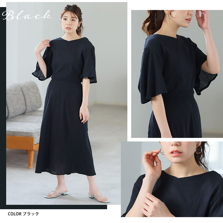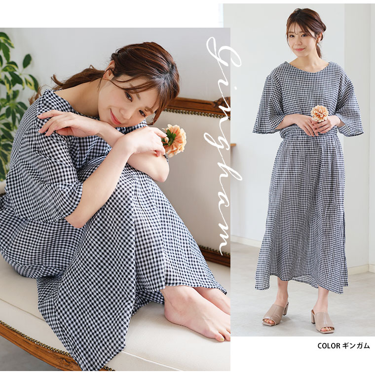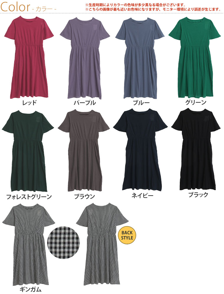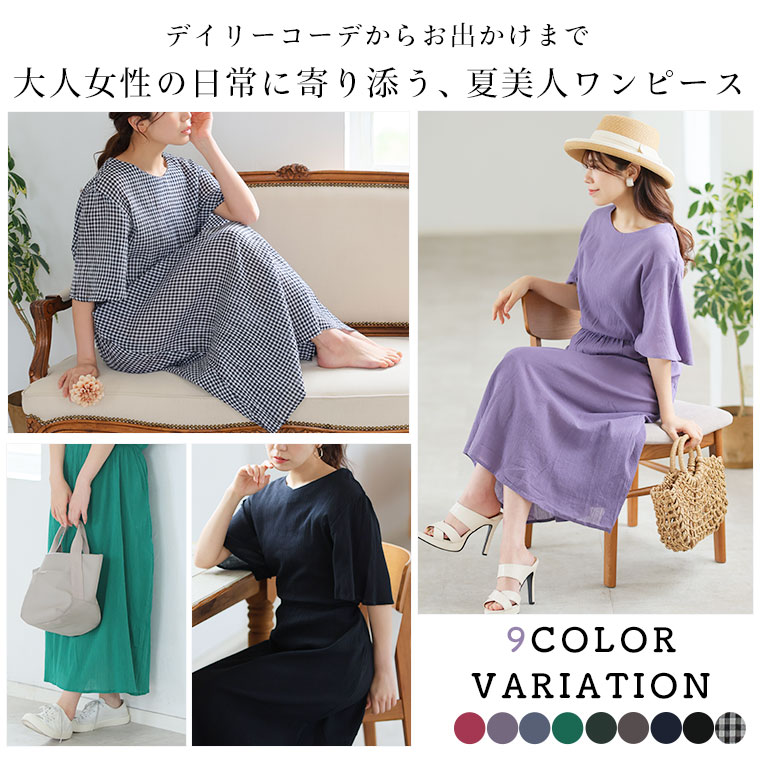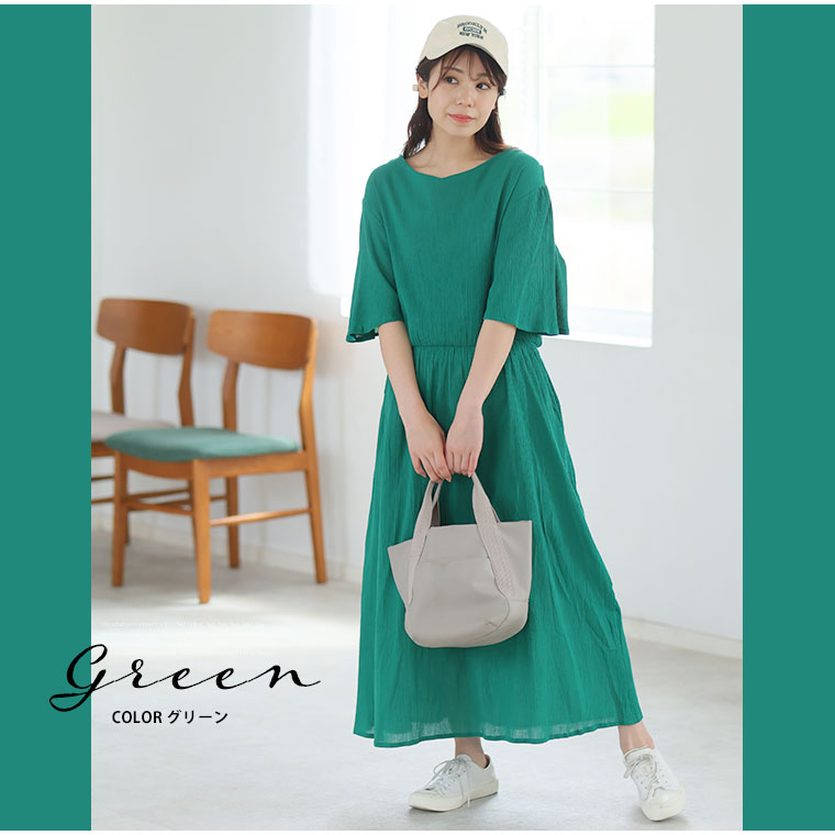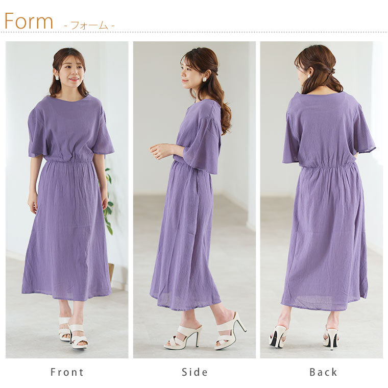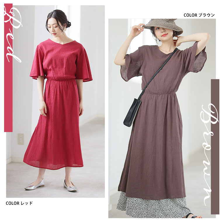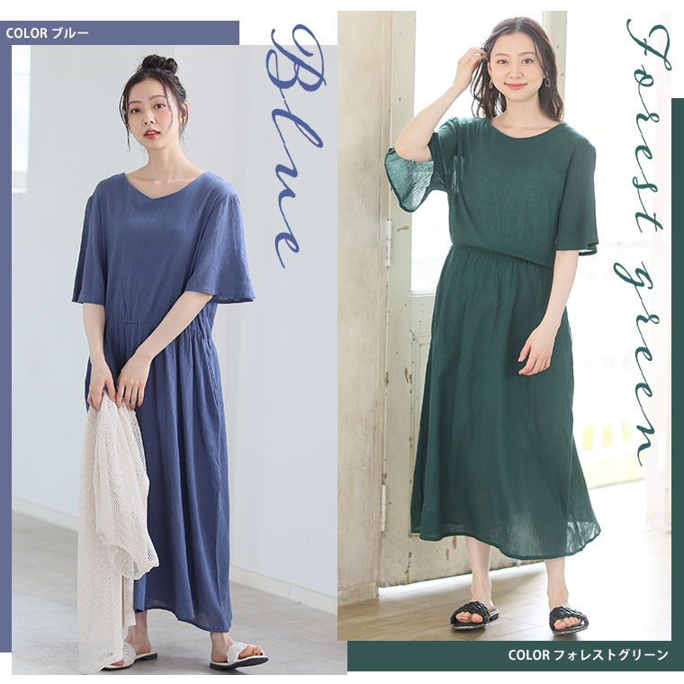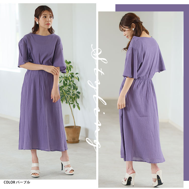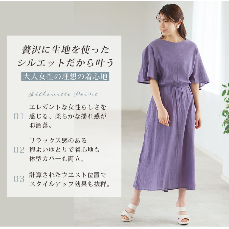 4. 大きいサイズ 【風通るプレミアム】綿 楊柳 フレア袖 ウエストゴム ワンピース