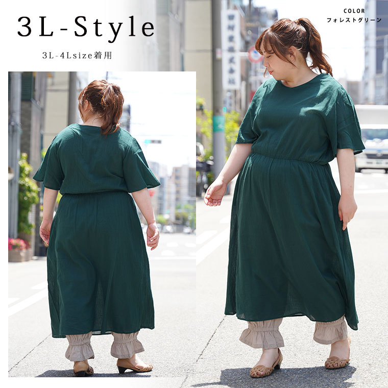 3. 大きいサイズ 【風通るプレミアム】綿 楊柳 フレア袖 ウエストゴム ワンピース
