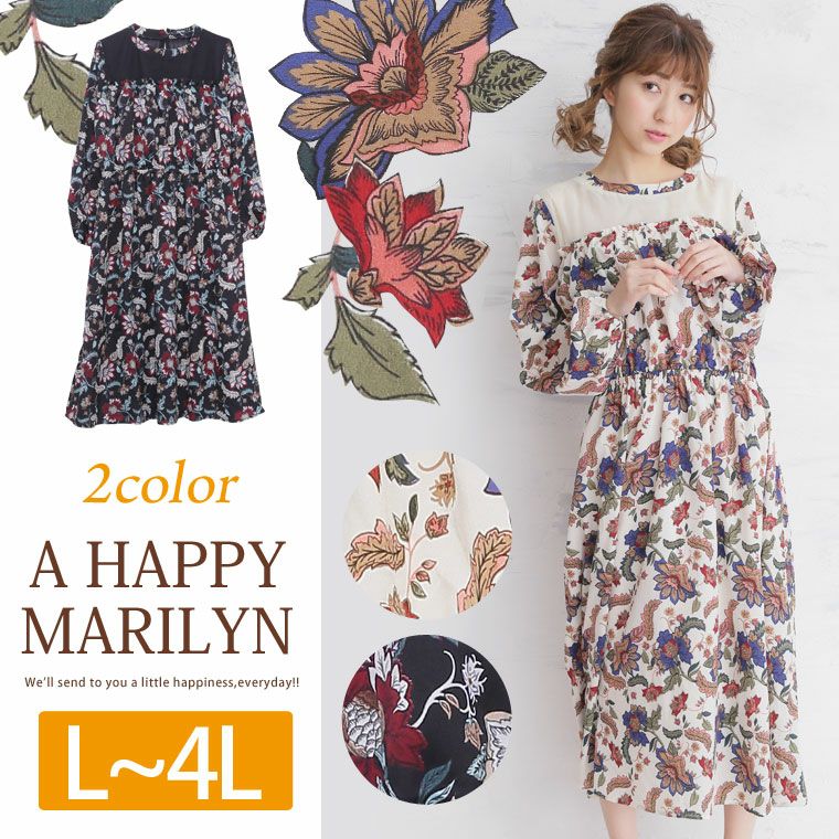 ワンピ ロングワンピース LL 3L 4L 春 春物 春服 大人 かわい おしゃれ カジュアル ぽちゃかわ 楽ちん レトロ花柄プリント × チュール スタンドカラー 長袖 ロング丈ワンピース | 大きいサイズの通販ならハッピーマリリン