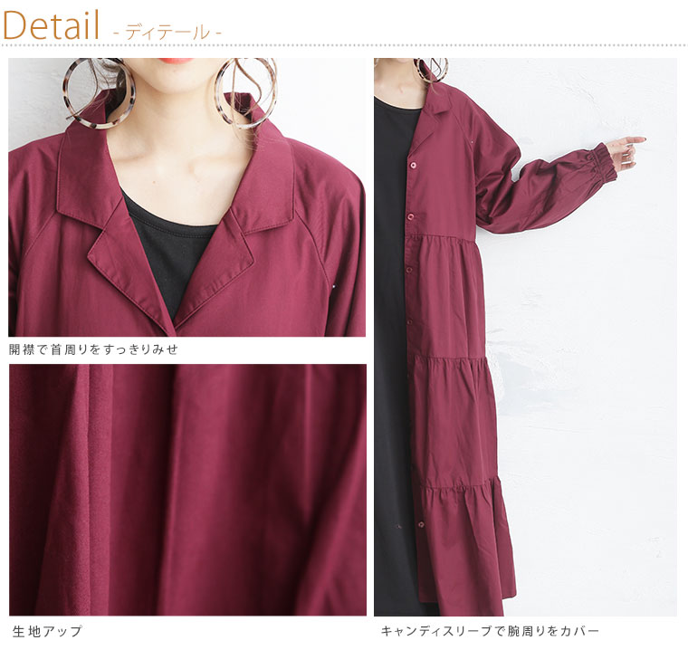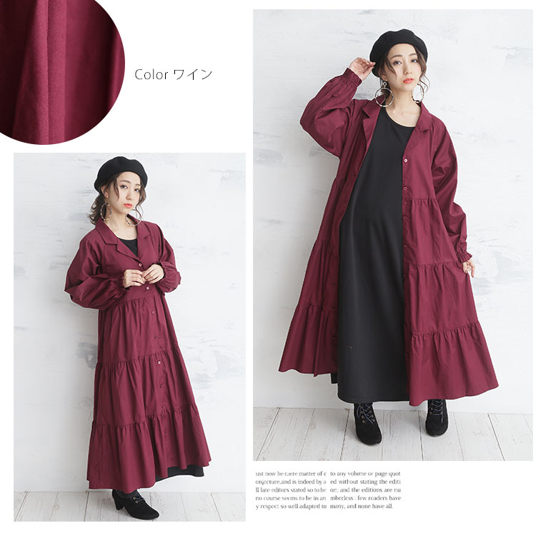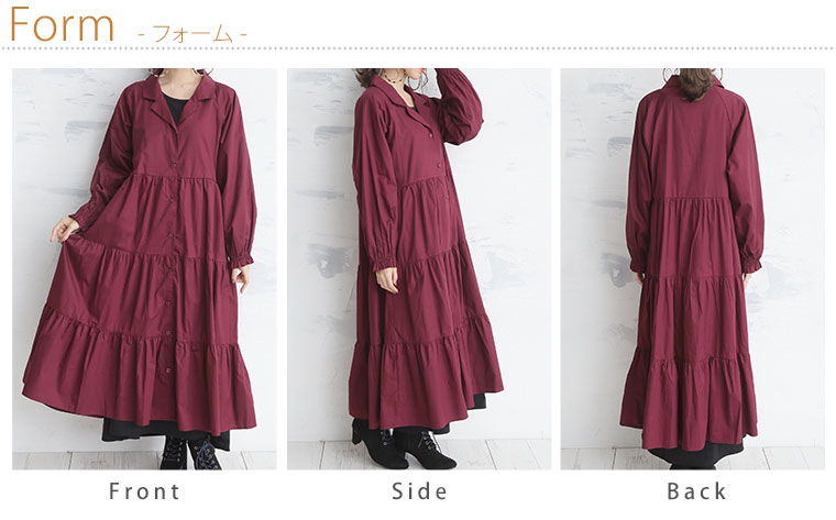 裾に広がるティアードでふんわりAラインシルエットに。前開きタイプなのでガウン風にも着られる。