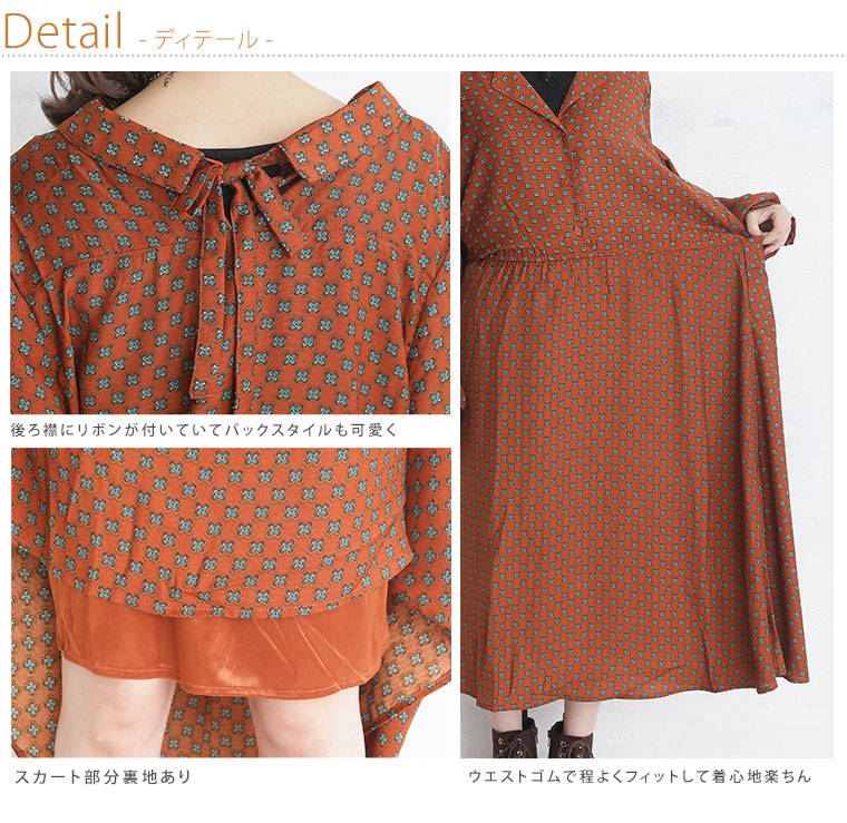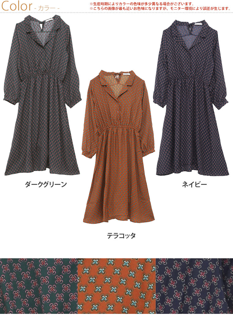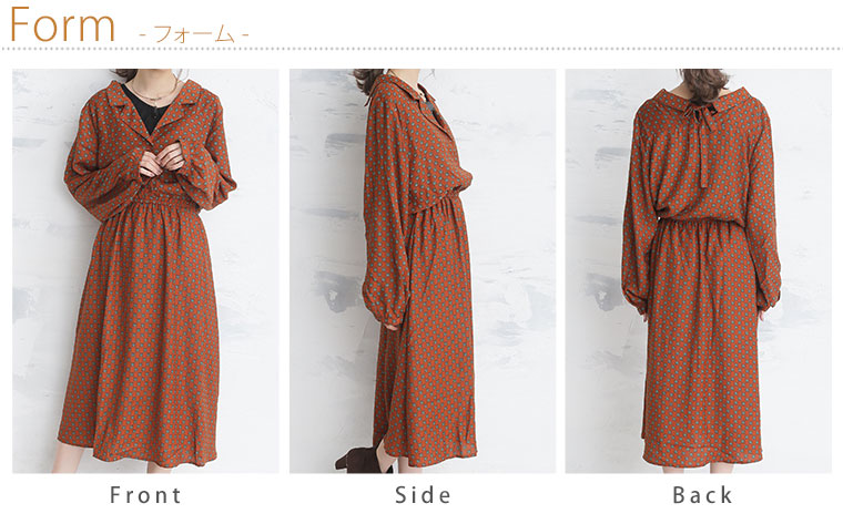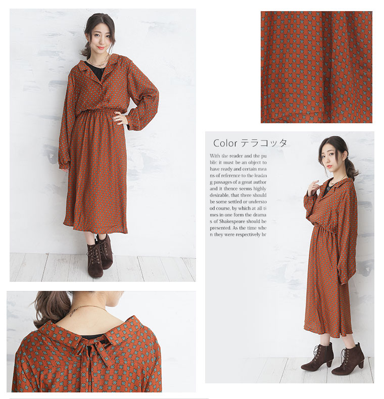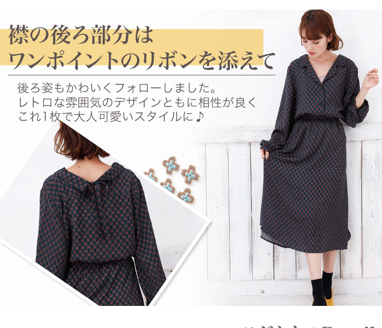 開襟で首周りをすっきり見せてくれる。レトロな小紋柄バックリボン長袖ワンピース
