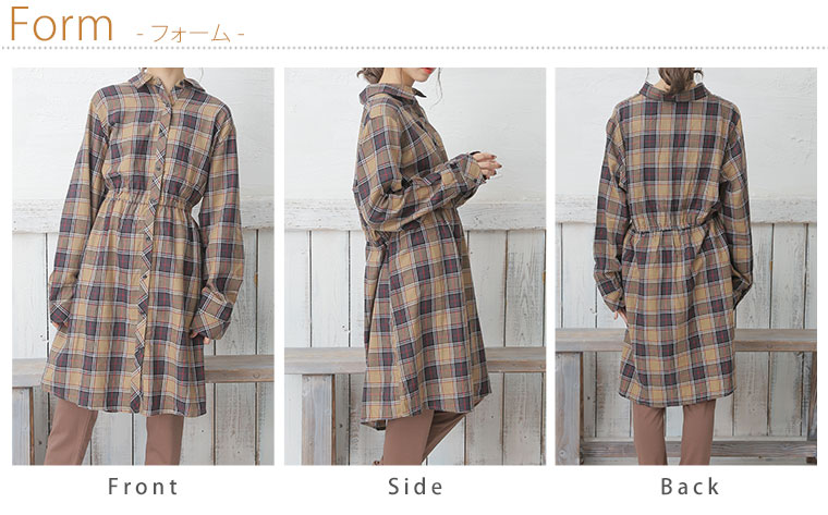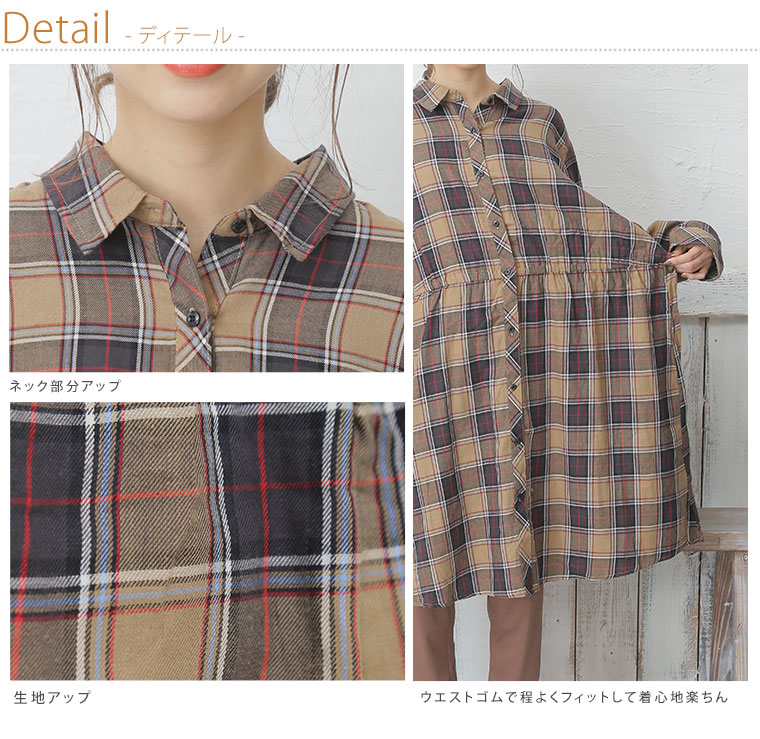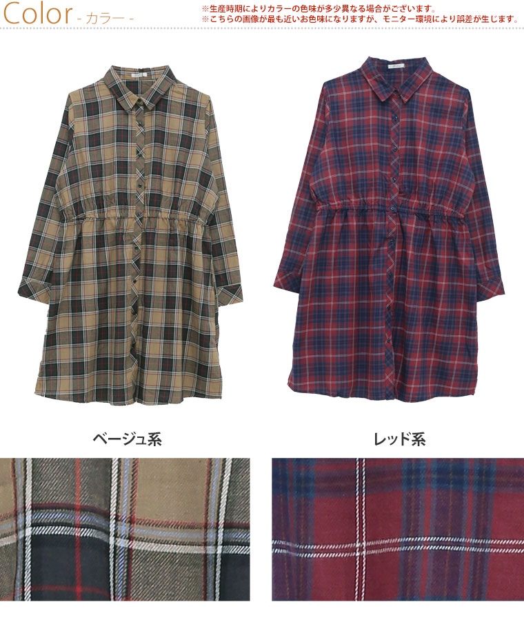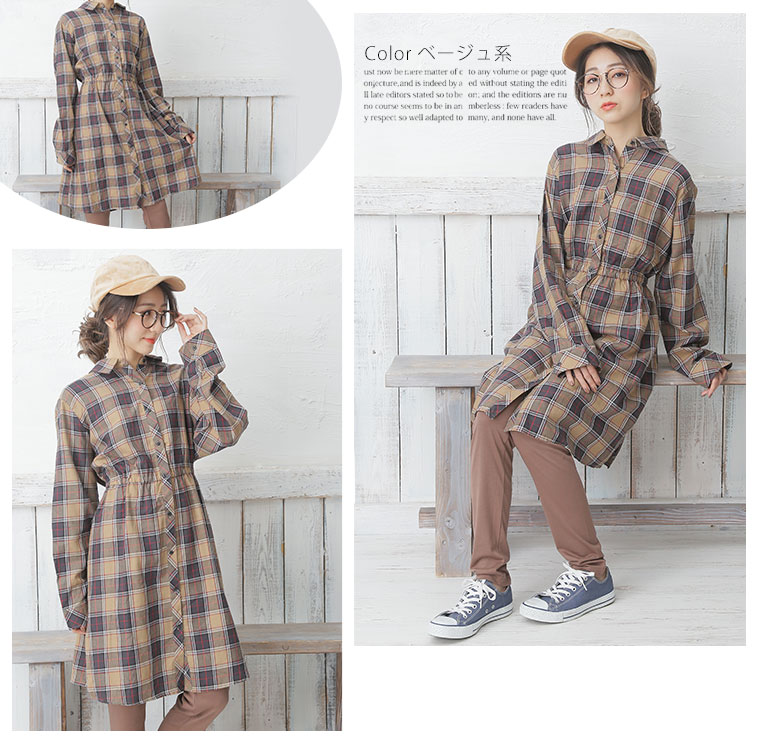 綿100%の素材で長いシーズン活躍する。ツイルチェック柄長袖シャツワンピ