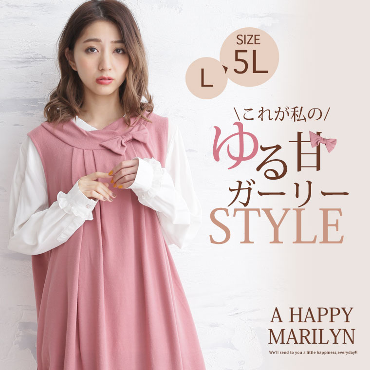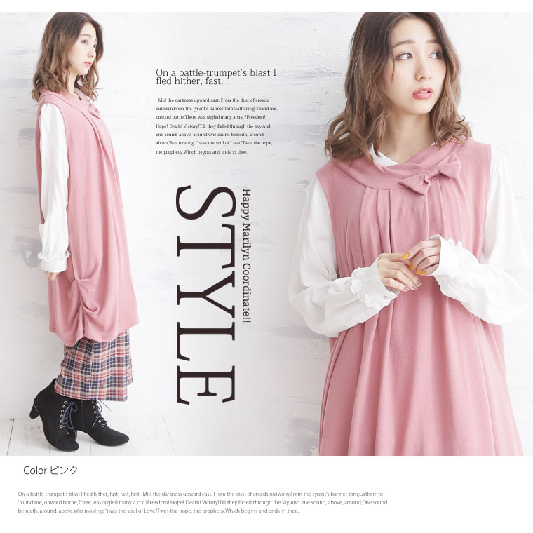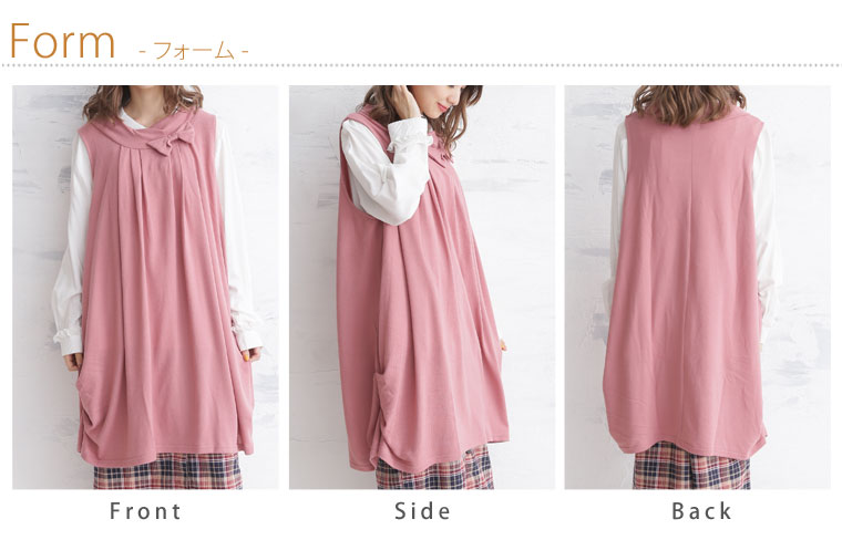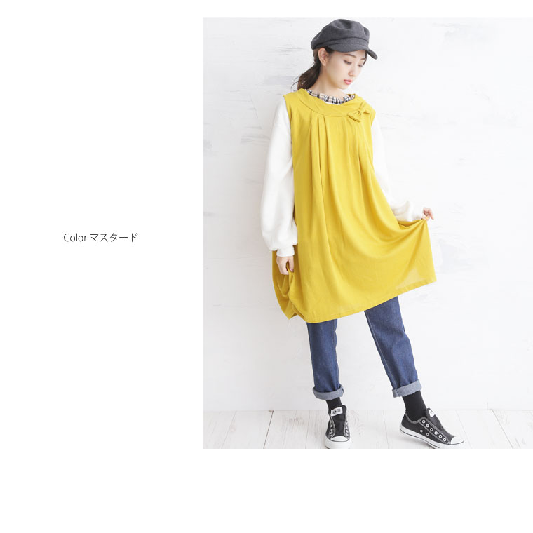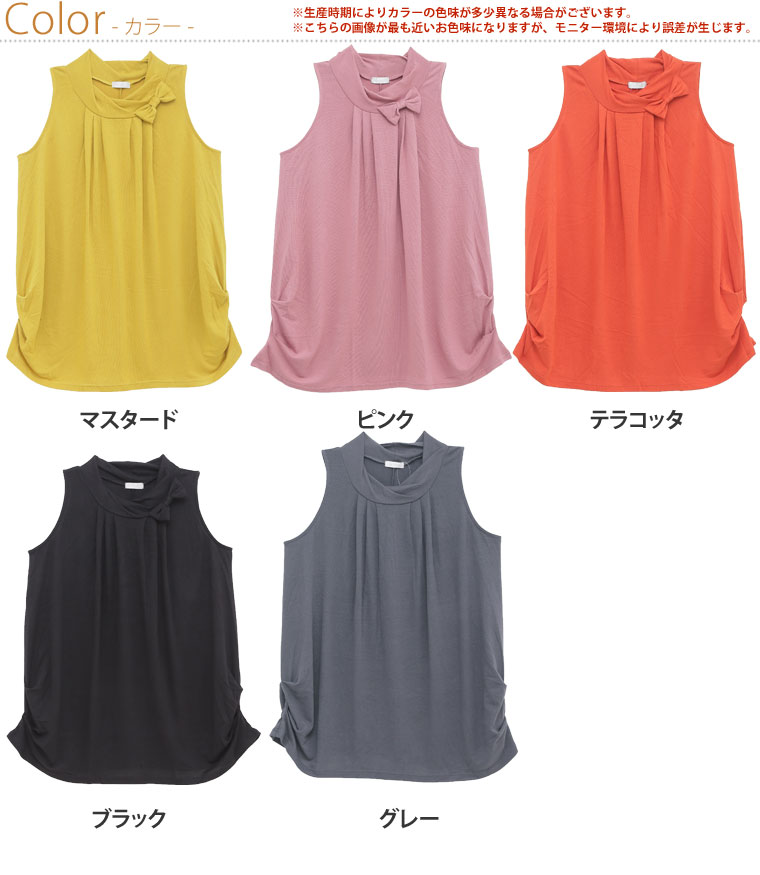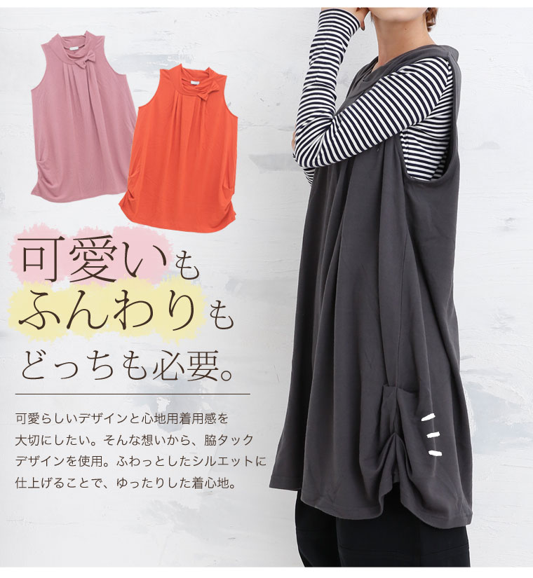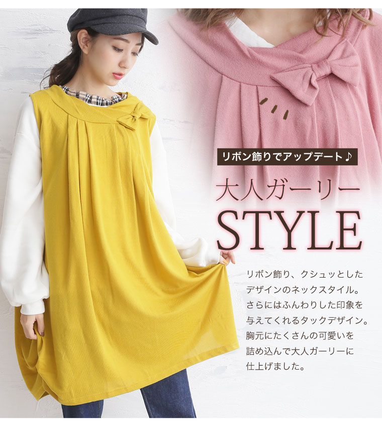 襟元リボンが可愛いアクセント♪脇タックノースリーブニットソーチュニック