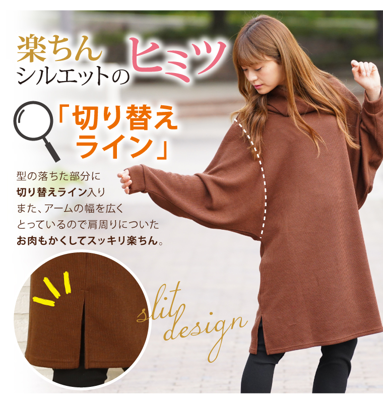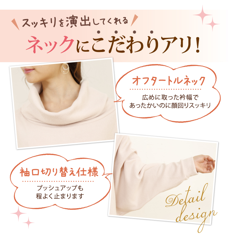 ドルマンシルエットでゆったり体型カバー♪顔周りを華やがせるオフタートルニット