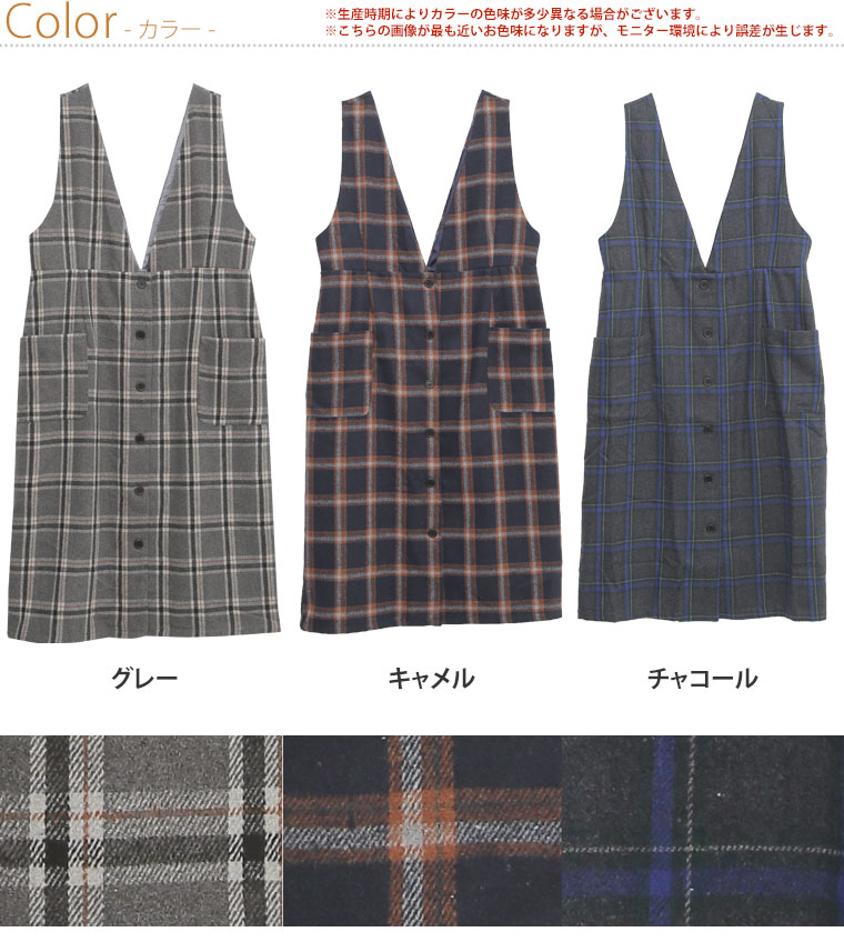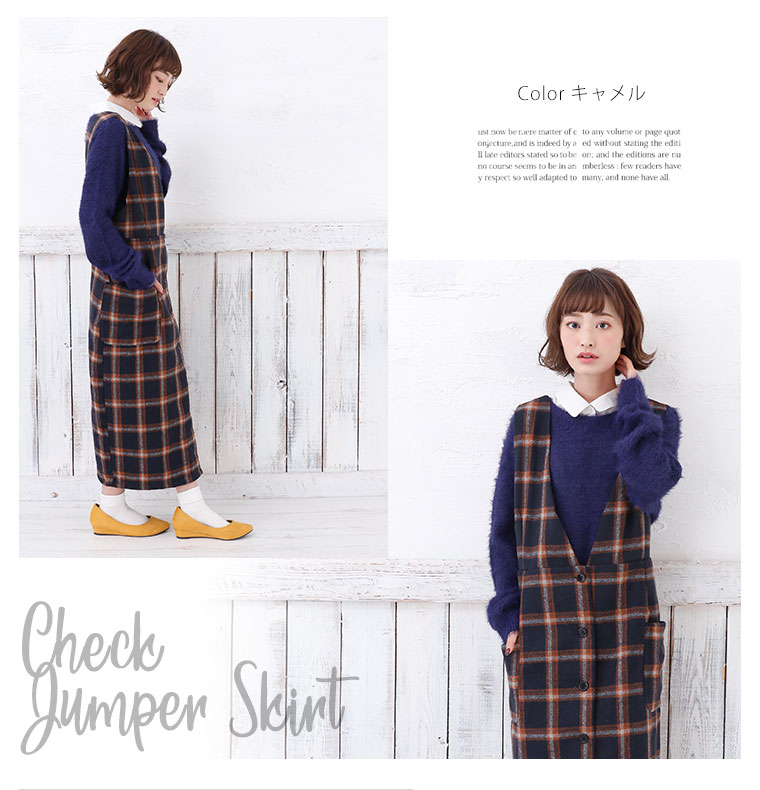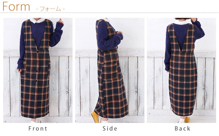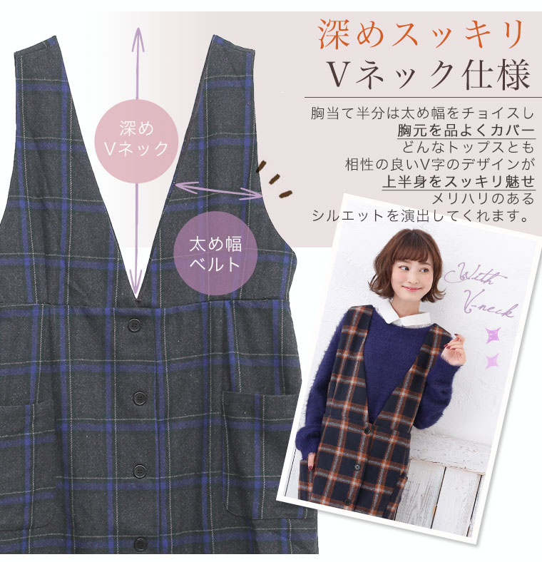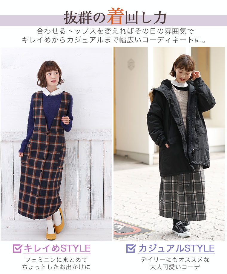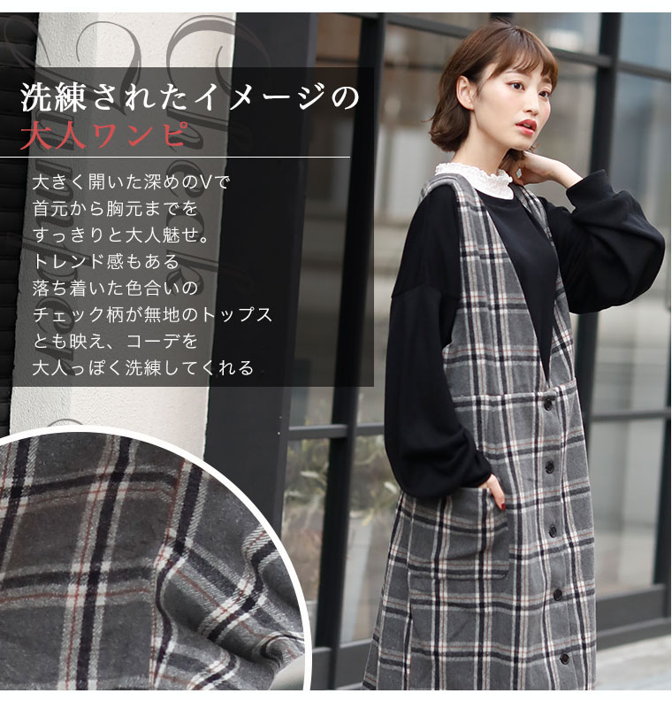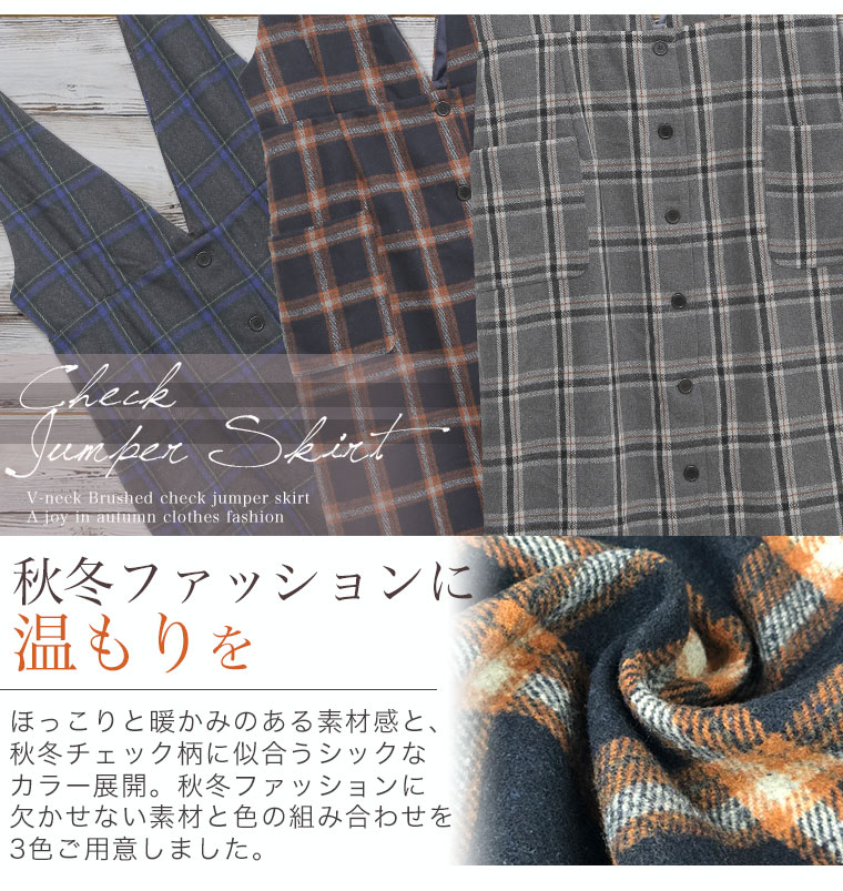 ナチュラルな雰囲気の起毛チェック生地でほっこり暖かい。Vネック膝下ジャンパースカート