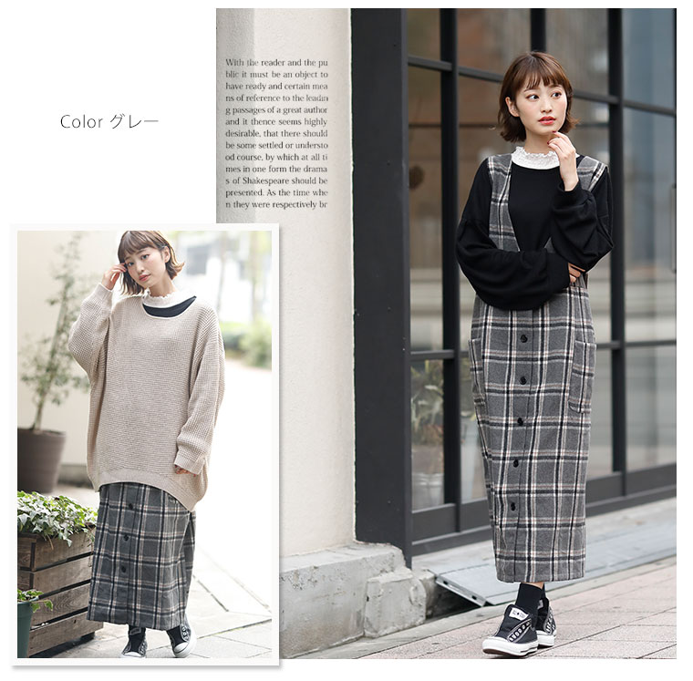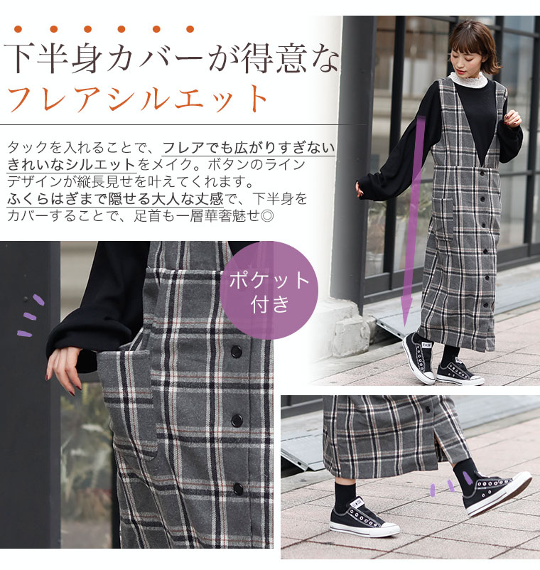 3. 大きいサイズ 起毛 チェック ロング丈 ジャンパースカート