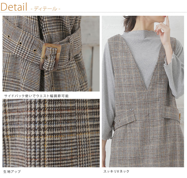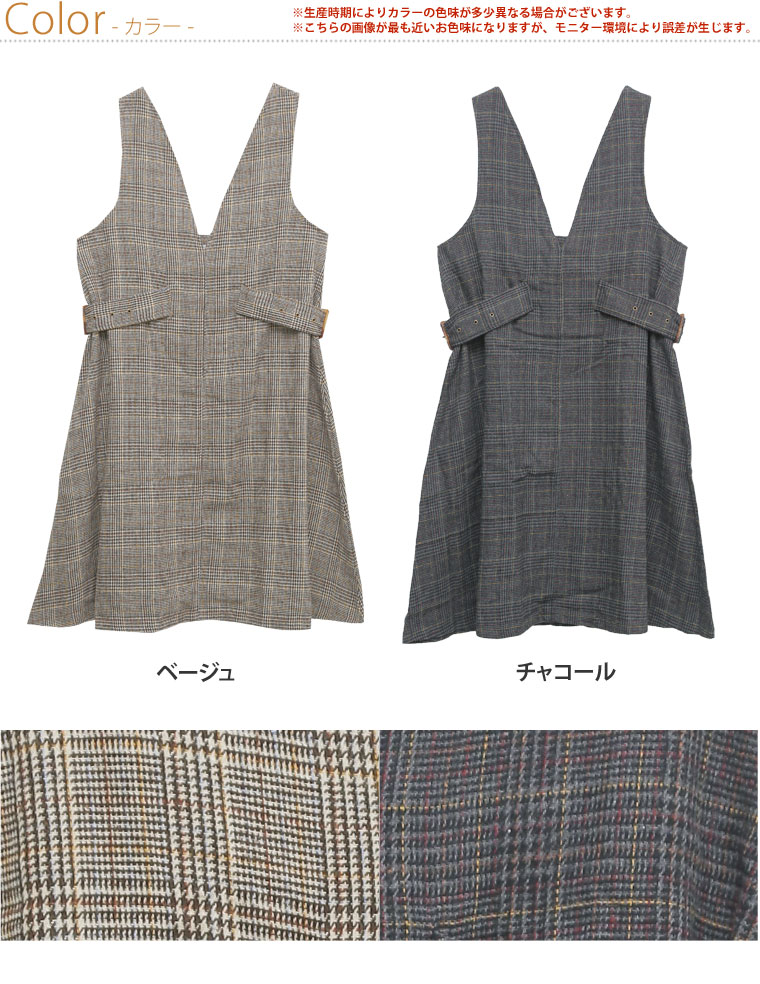 Vネックでスッキリ着痩せ♪グレンチェックのバックルワンピース