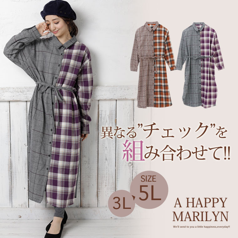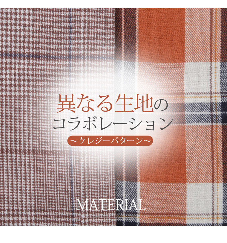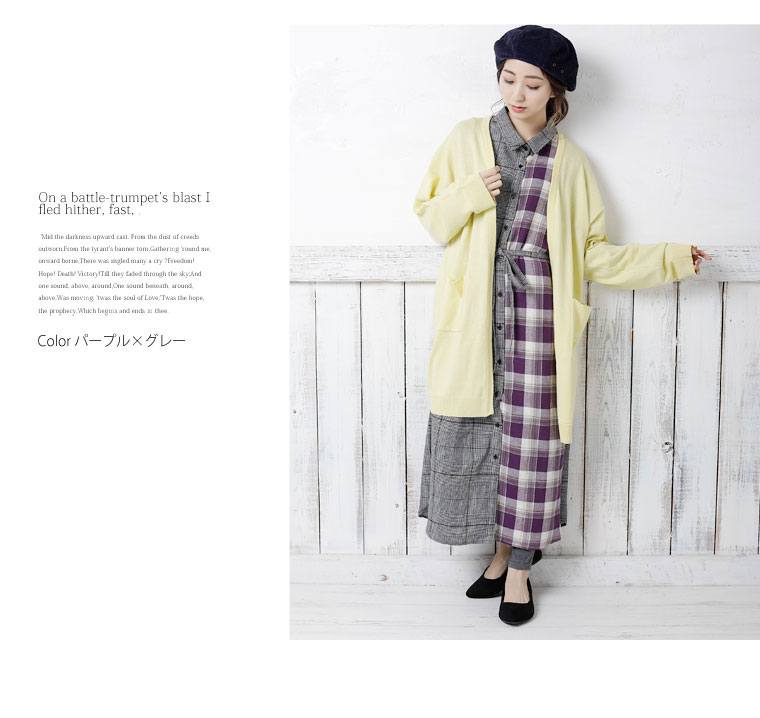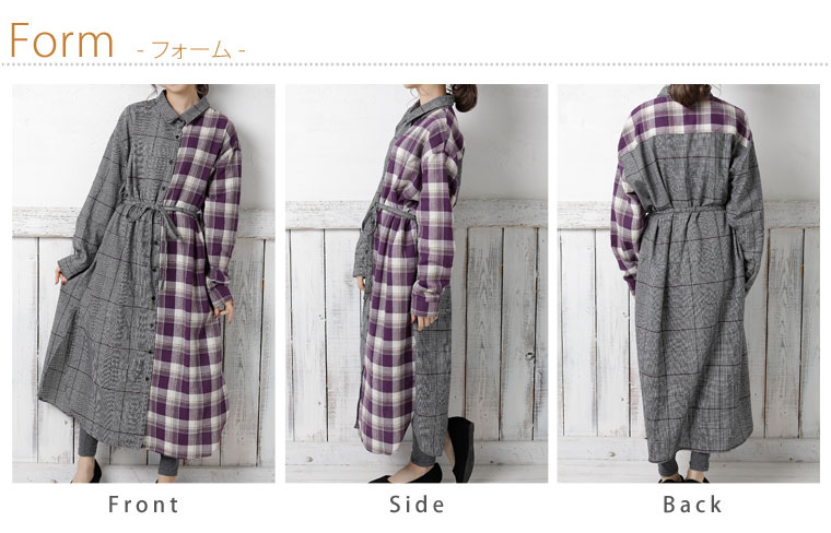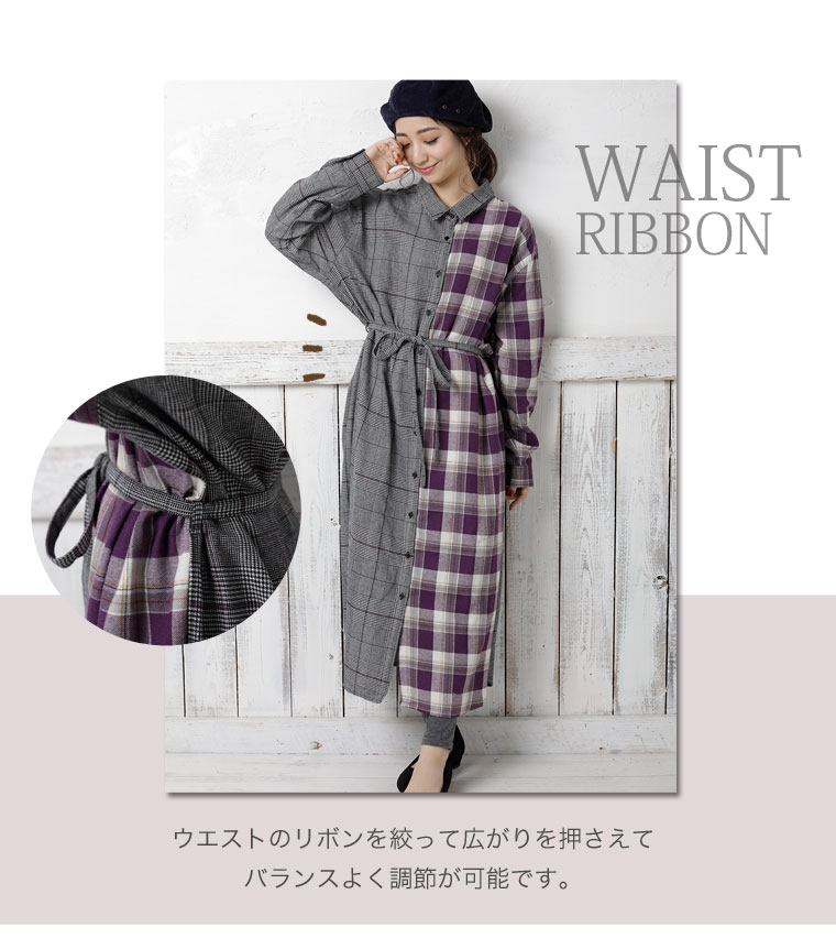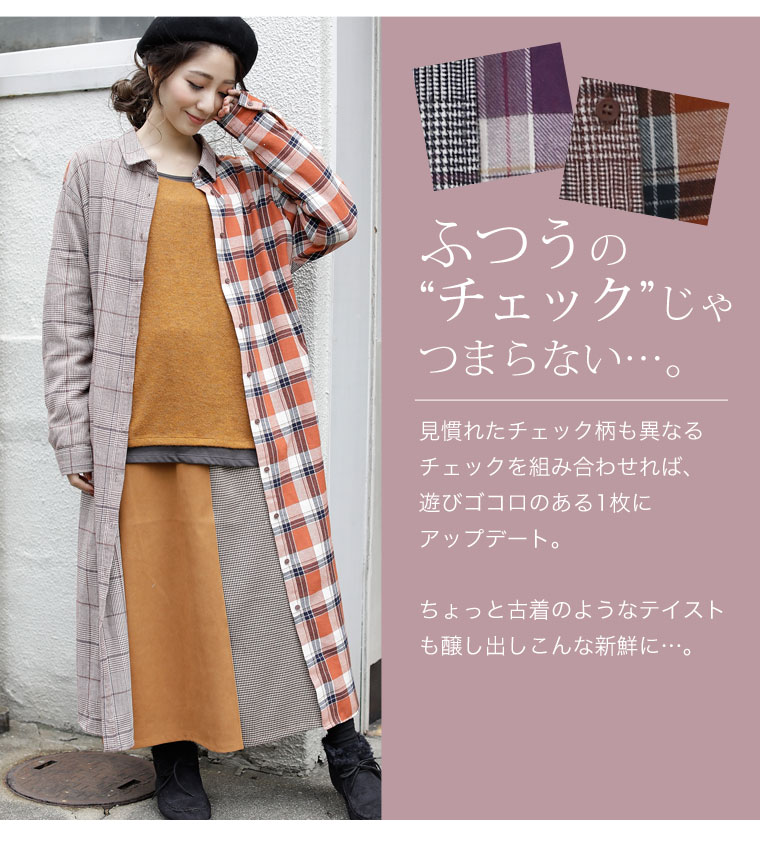 異なるチェックを組み合わせたほっこりデザイン。チェック柄ロングシャツワンピース