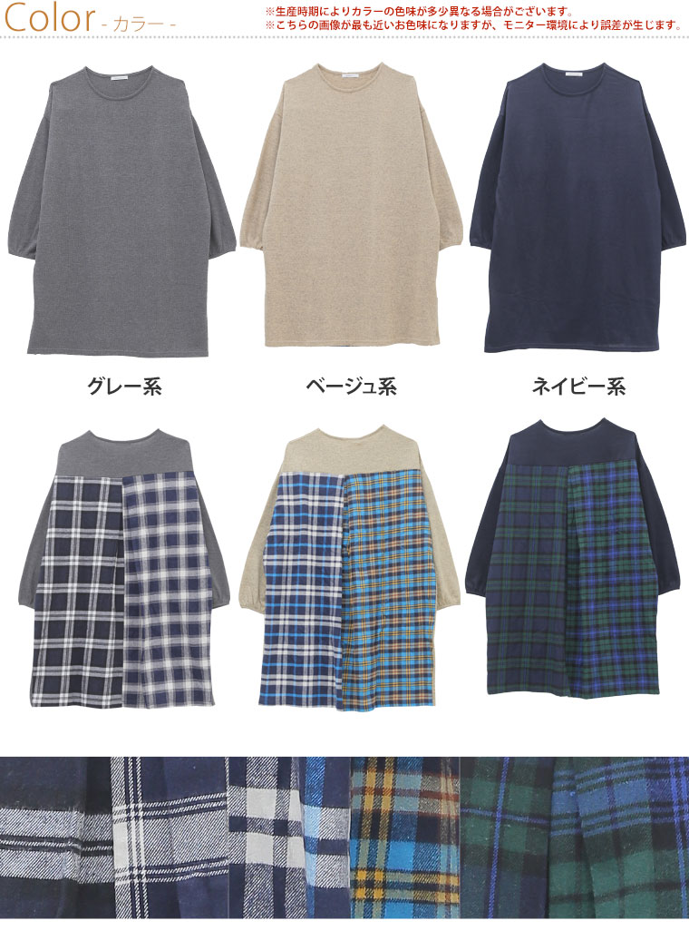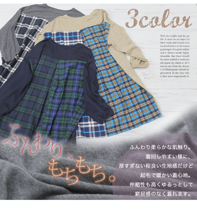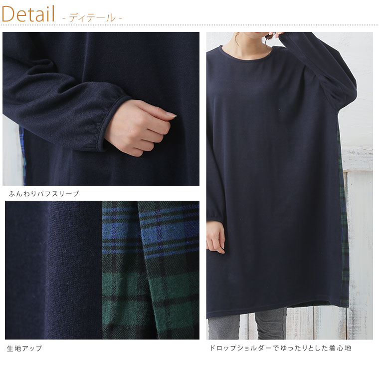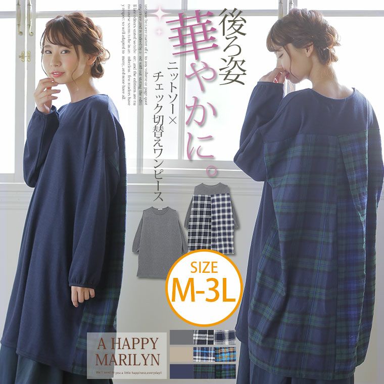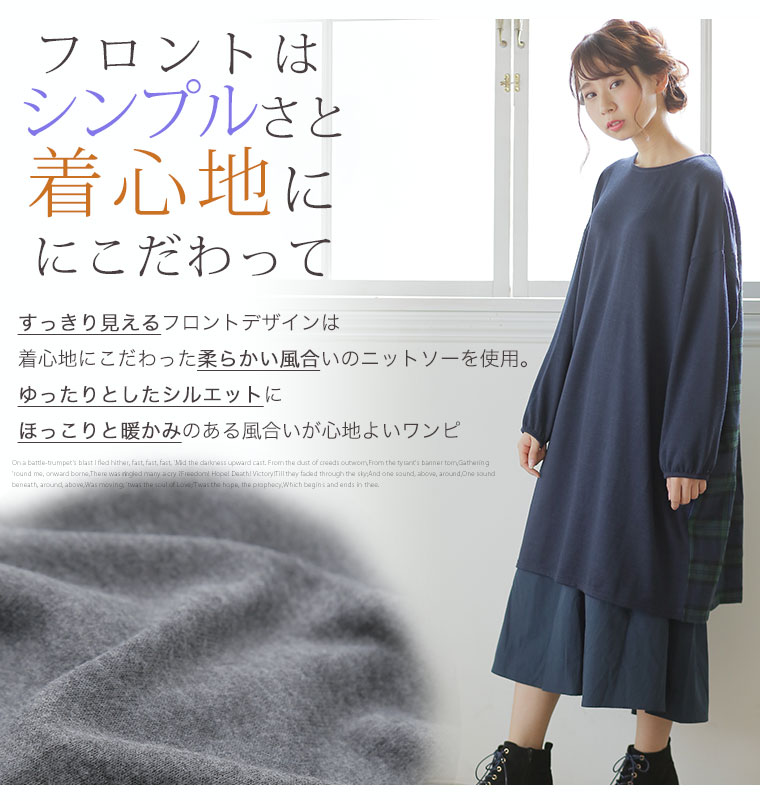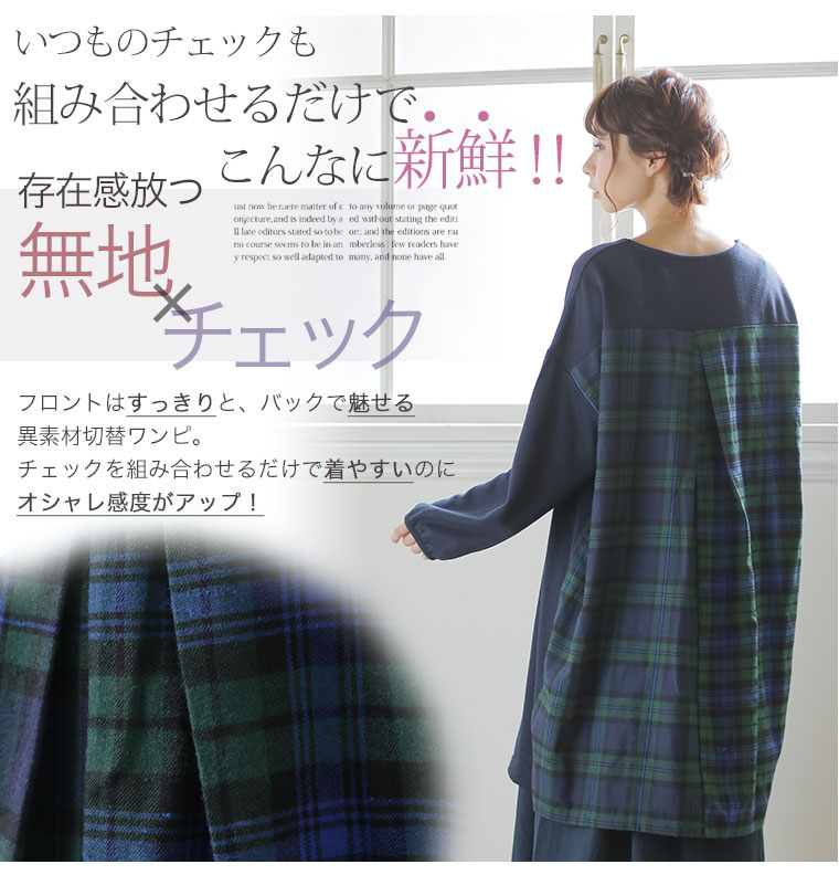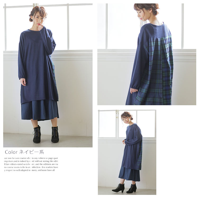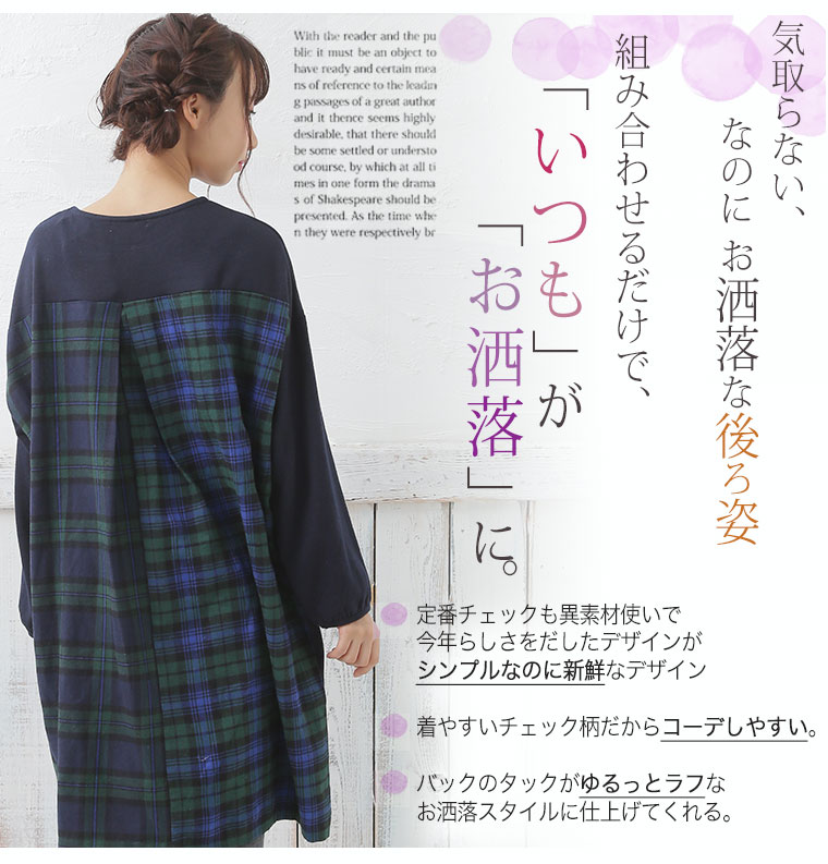 チェック生地切替えで後ろ姿も華やかに。ニットソー膝丈ワンピース