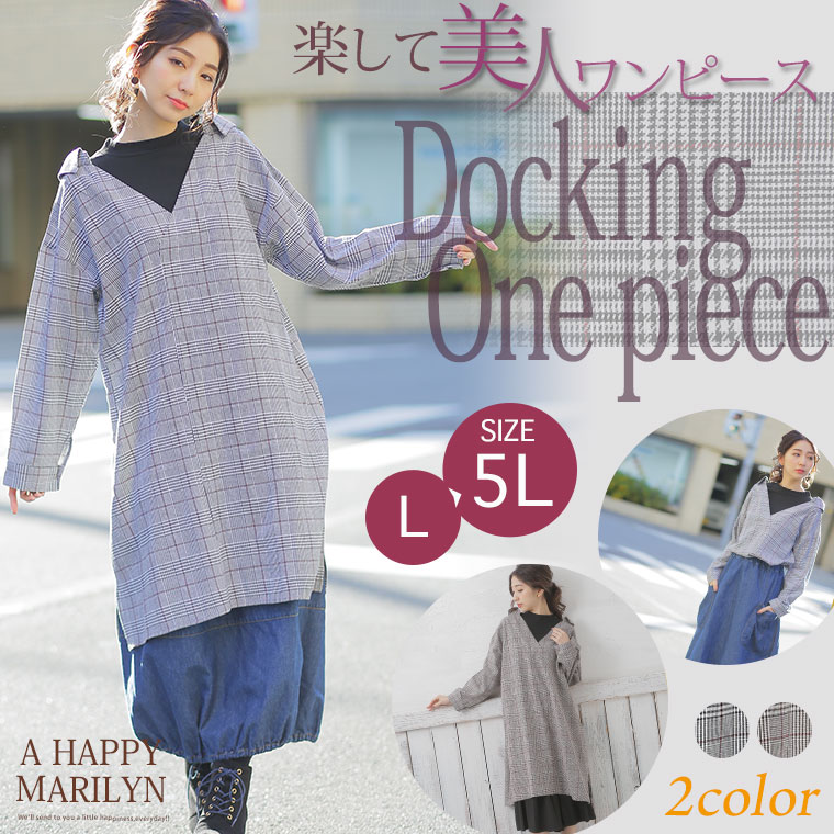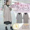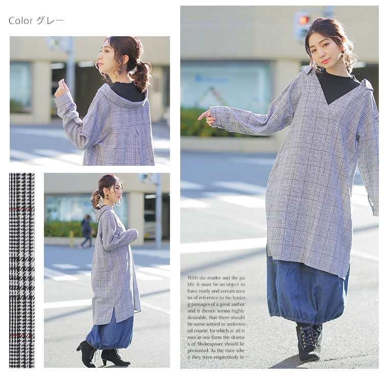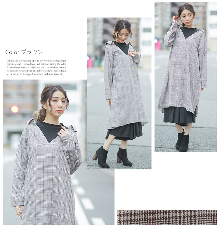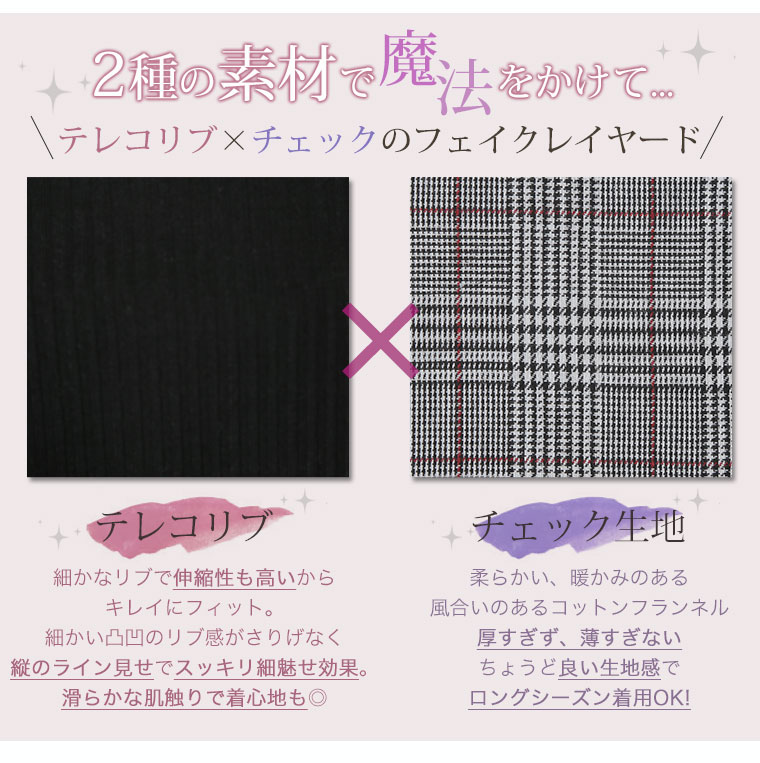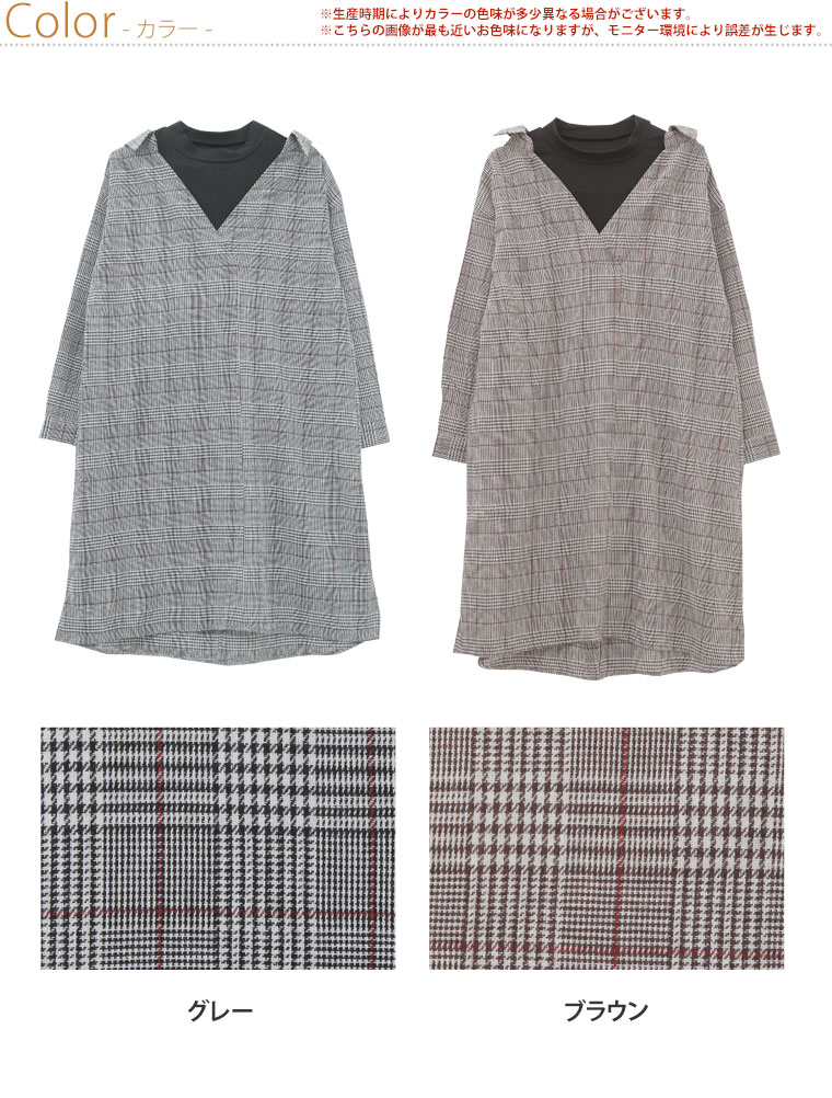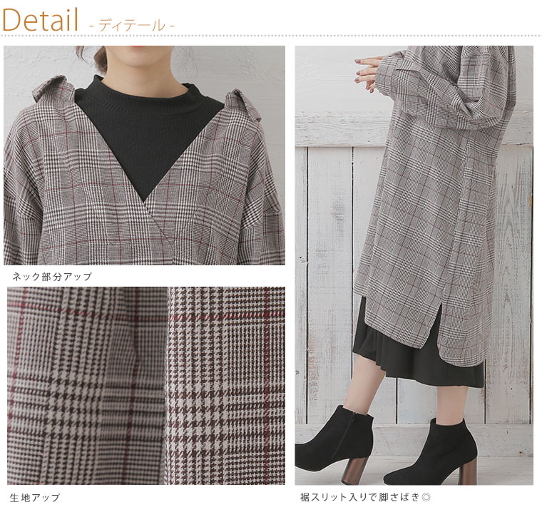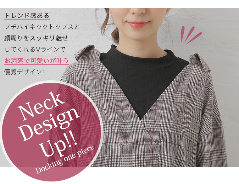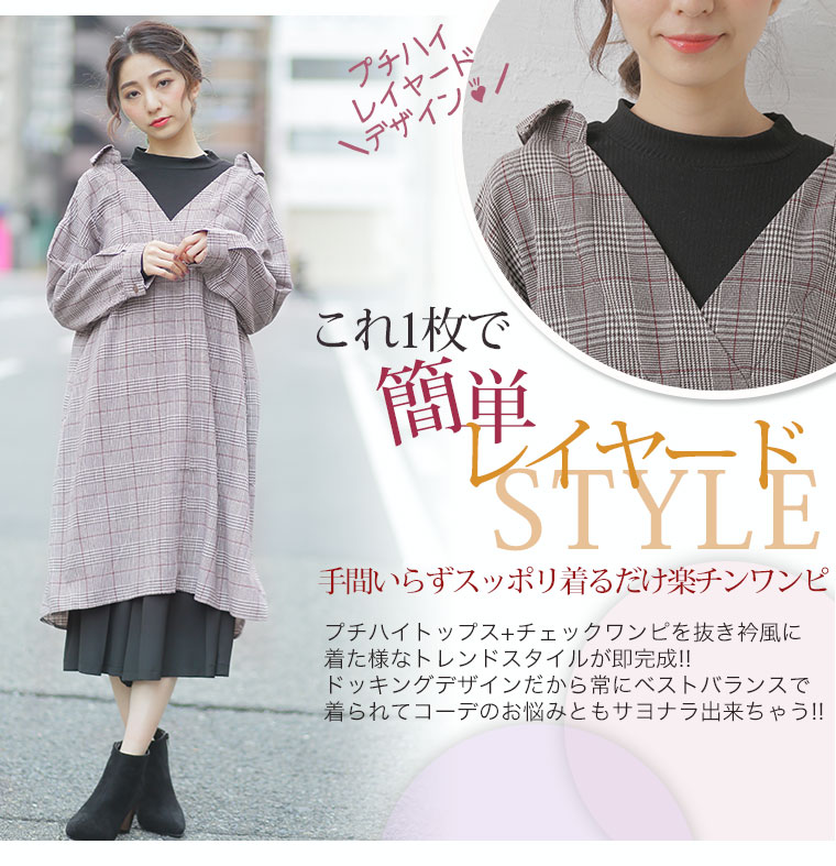 タートルネックトップスフェイクレイヤードチェックシャツ風ワンピース