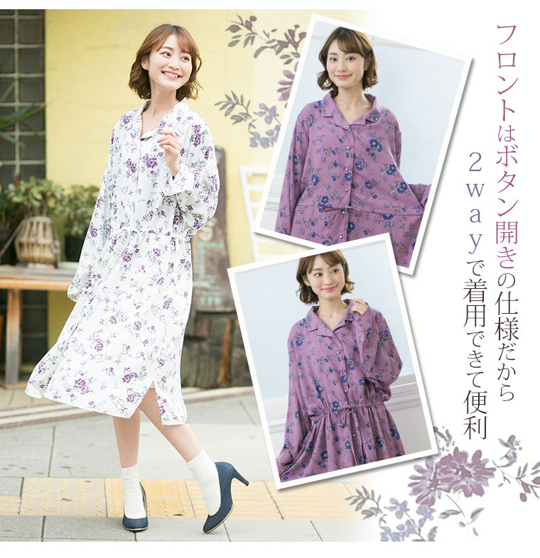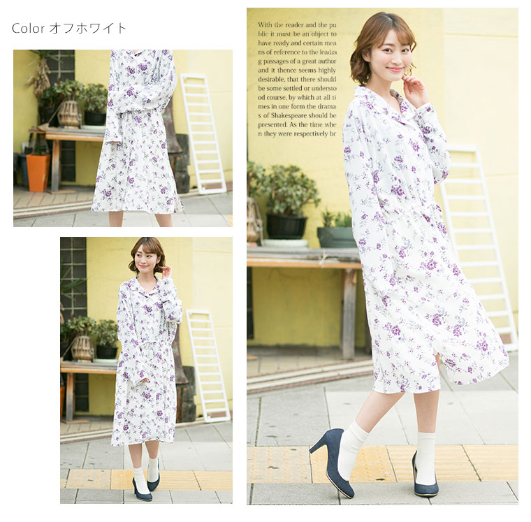 前開きタイプなのでガウン風にも着られる。ウエスト紐で腰周りブラウジングできる