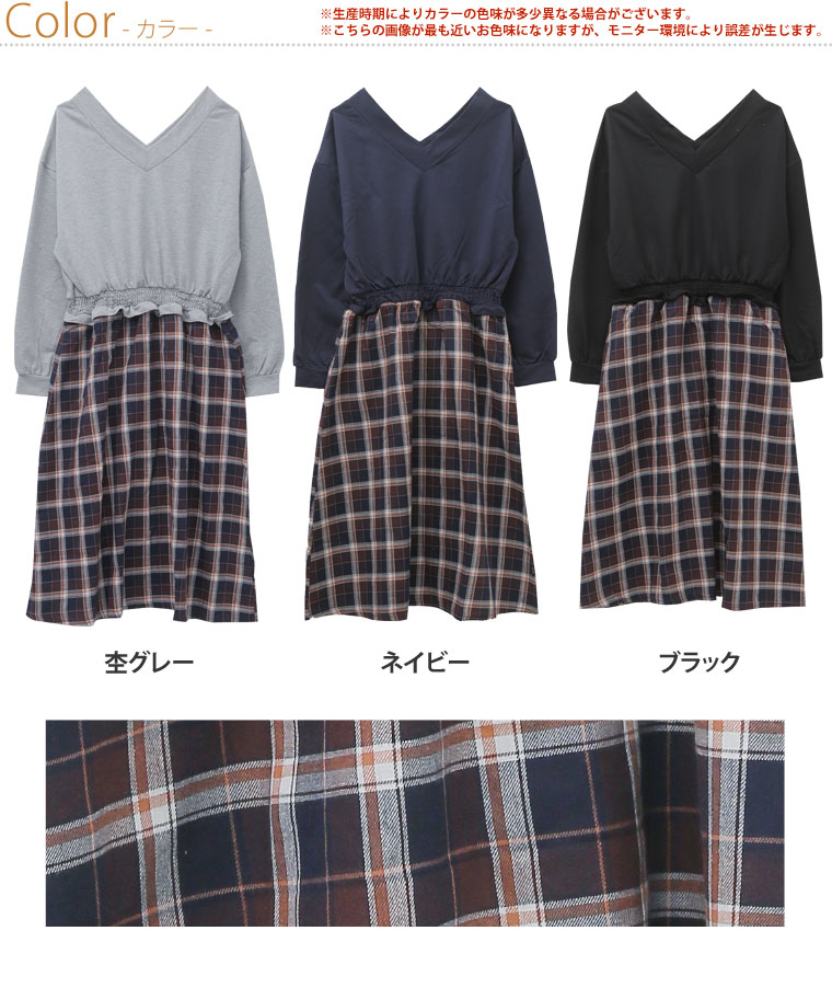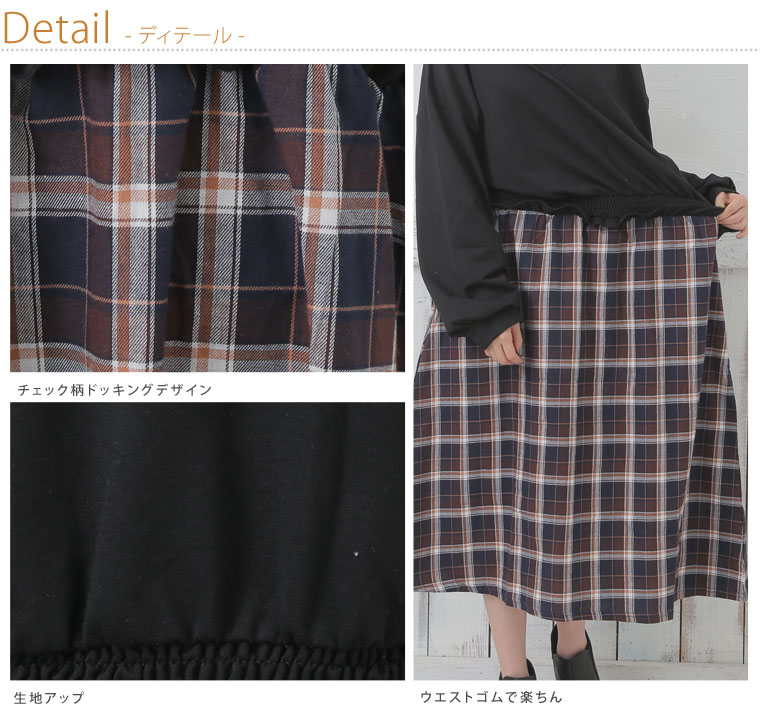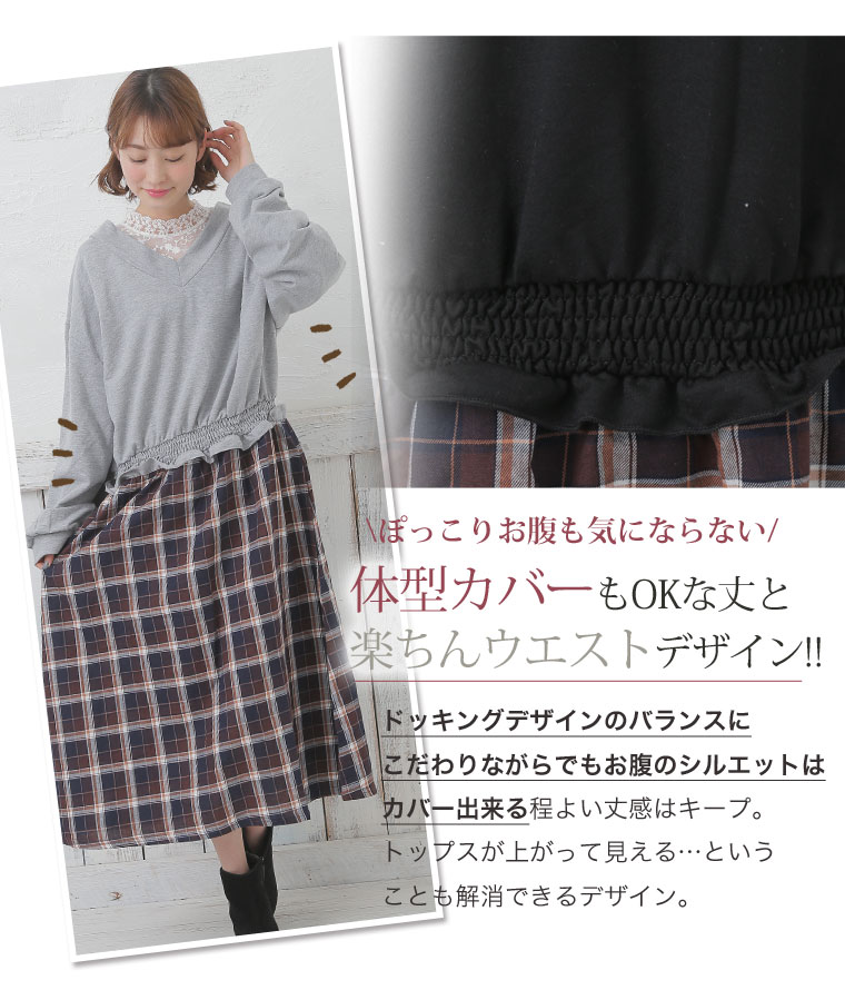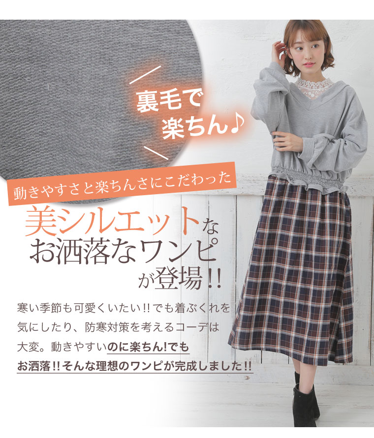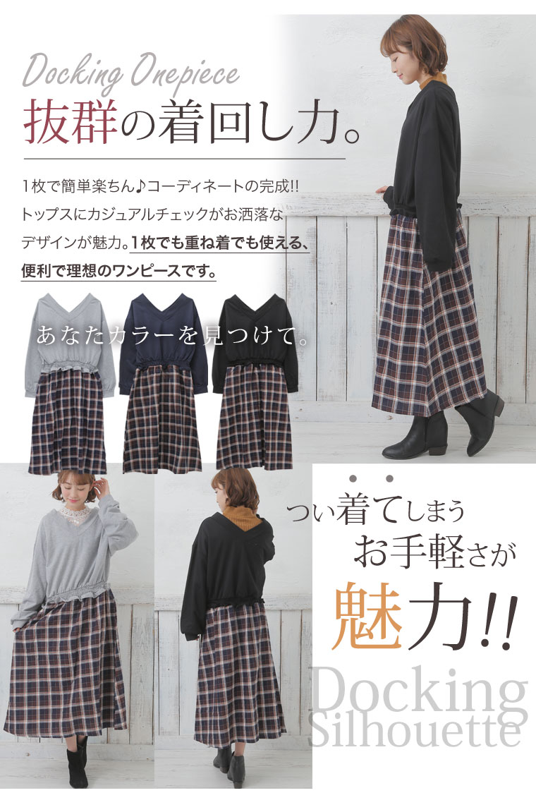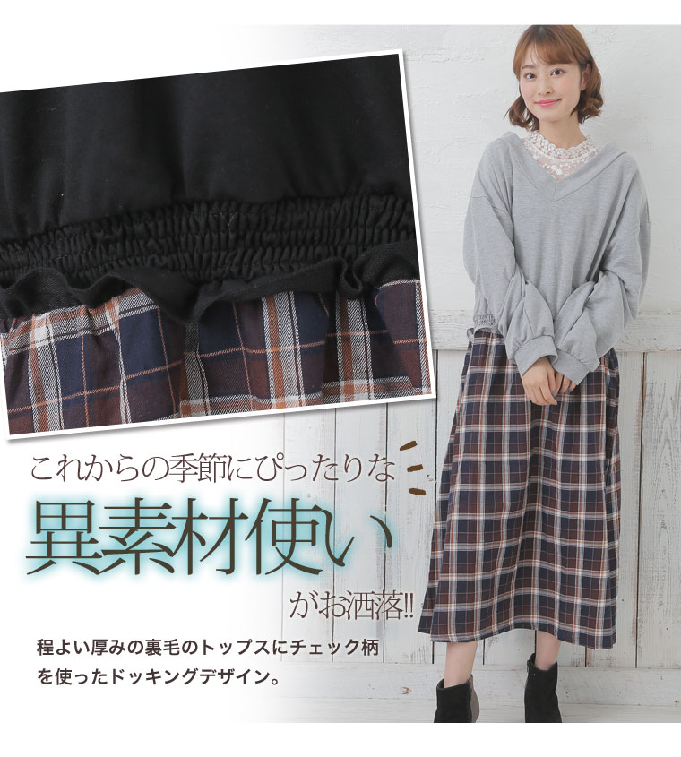 ミニ裏毛でゆったり着こなす。チェック柄ドッキングワンピース