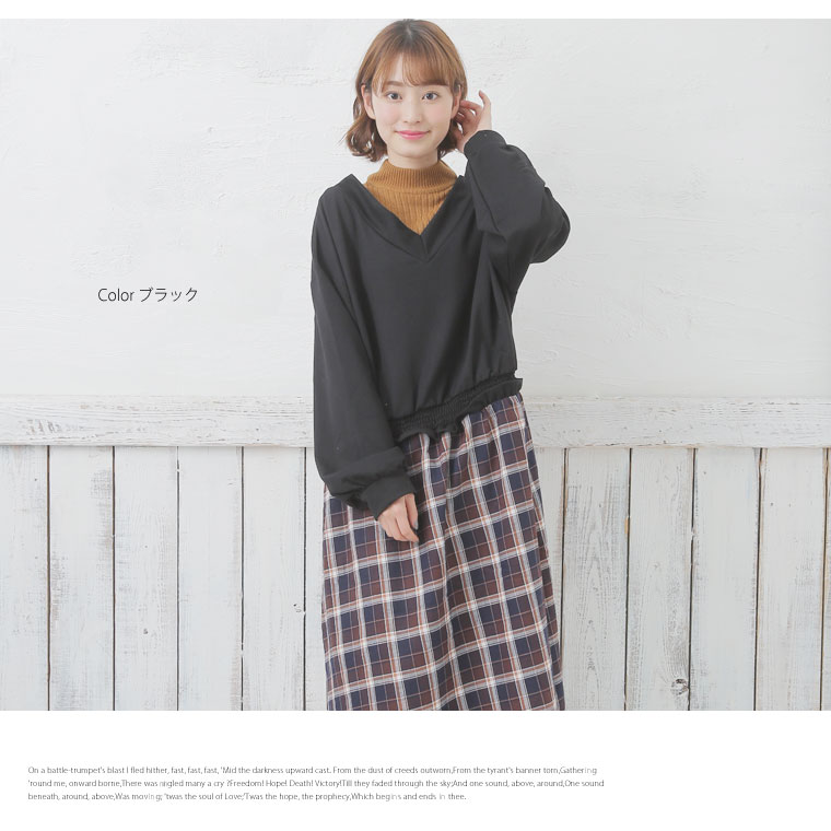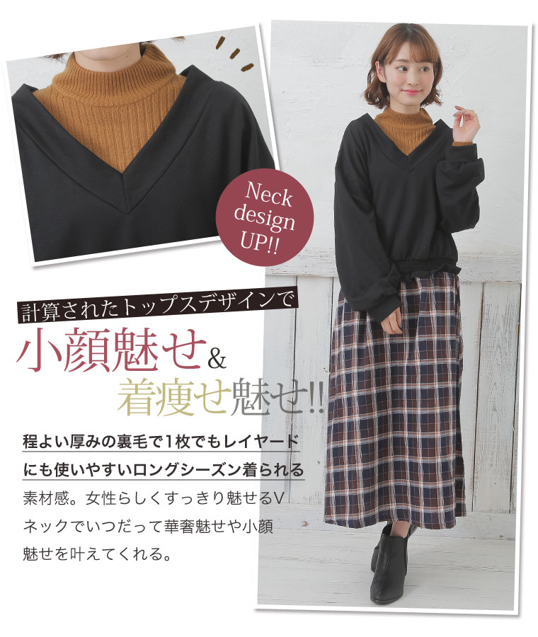 すっぽり着られるシンプルなデザイン。前後Vネックでデコルテラインきれい魅せ