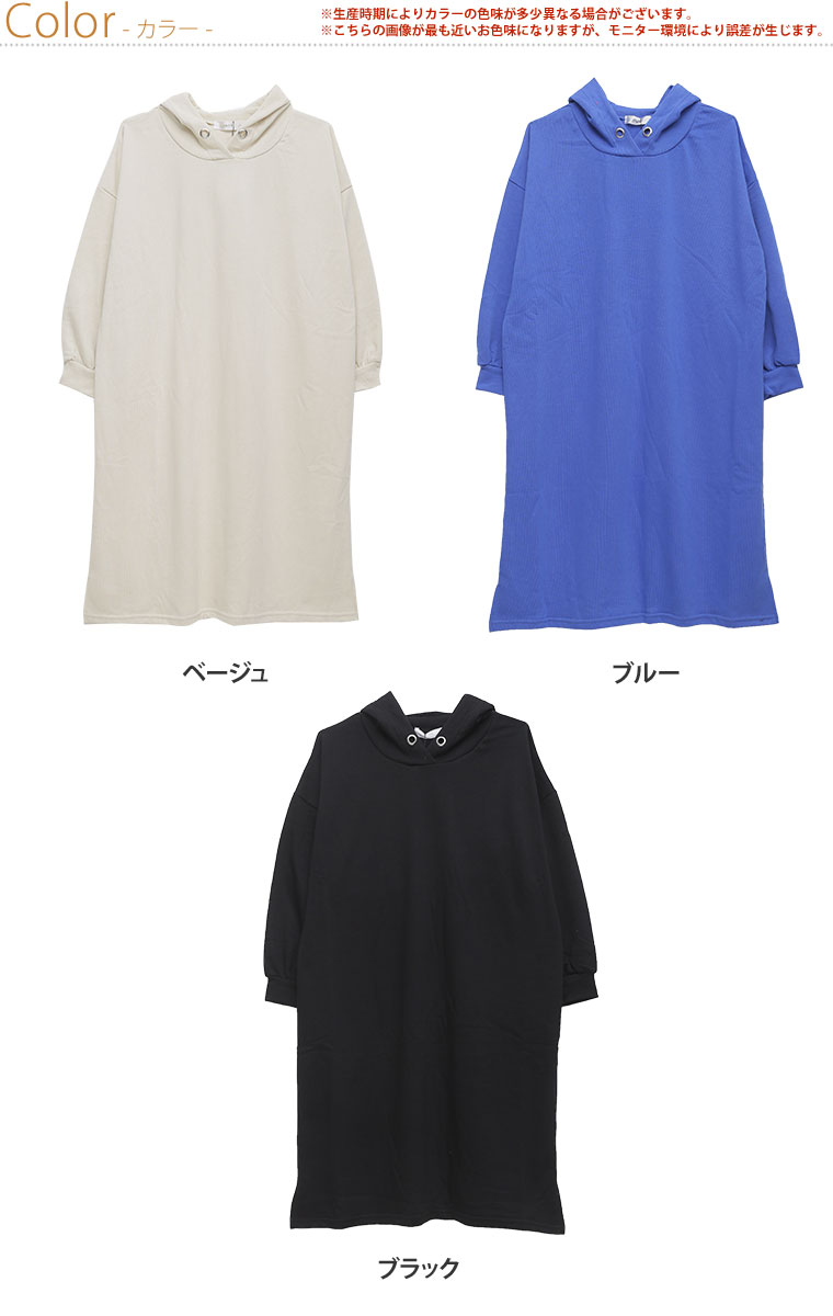3. 大きいサイズ TC裏毛 裾スリット フーデッド 長袖 ロング丈 ワンピース