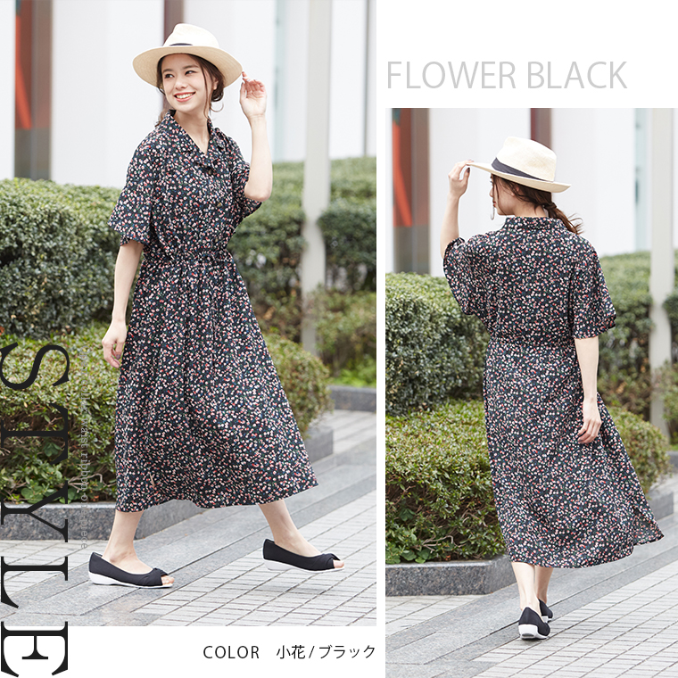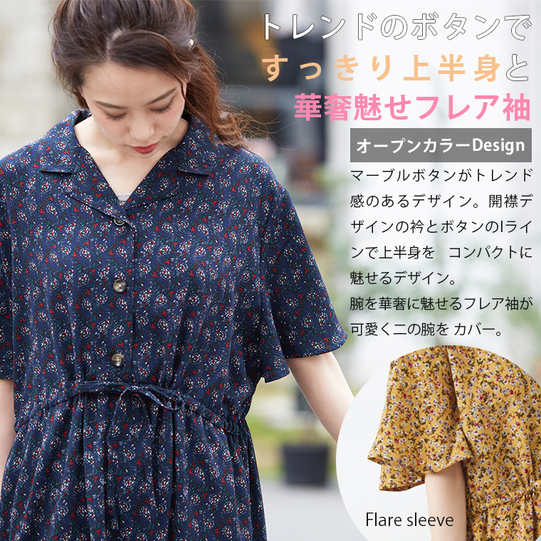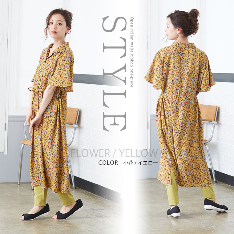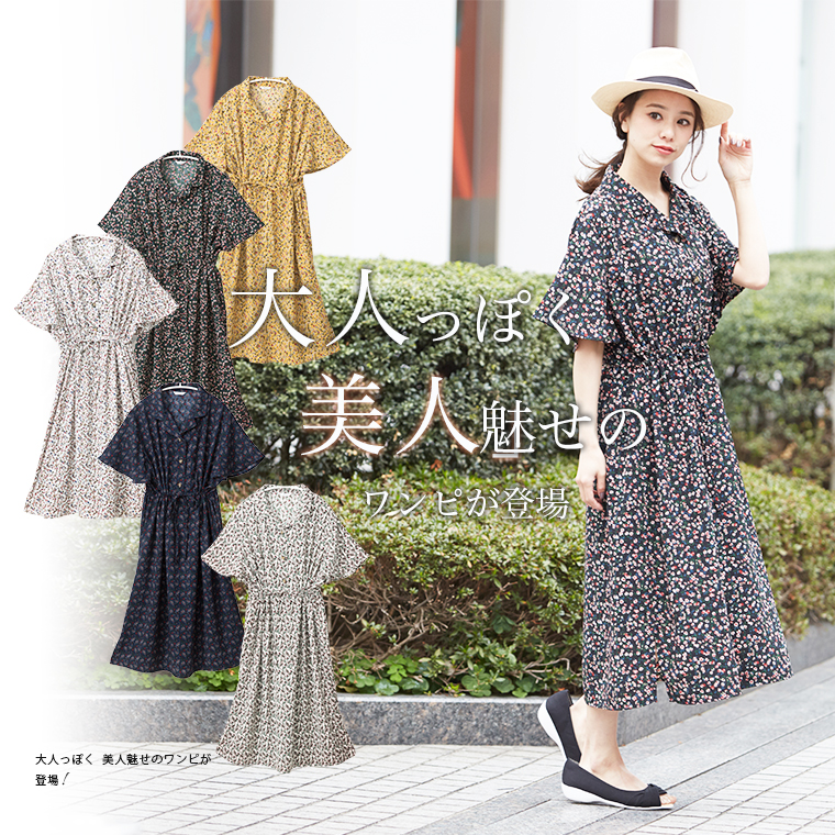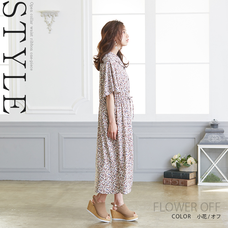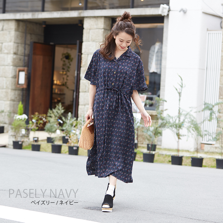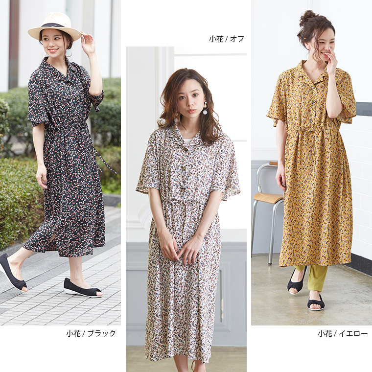 大人女子にぴったり!2柄から選べる開襟ウエストリボンワンピース
