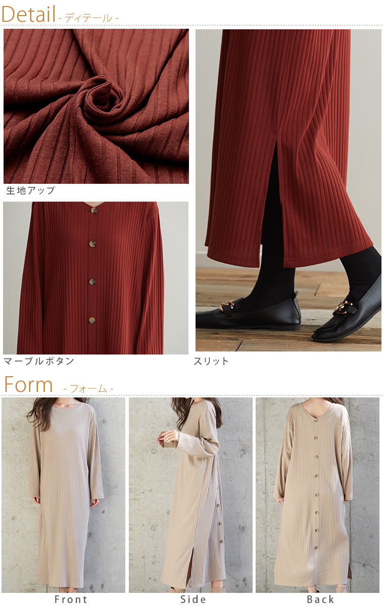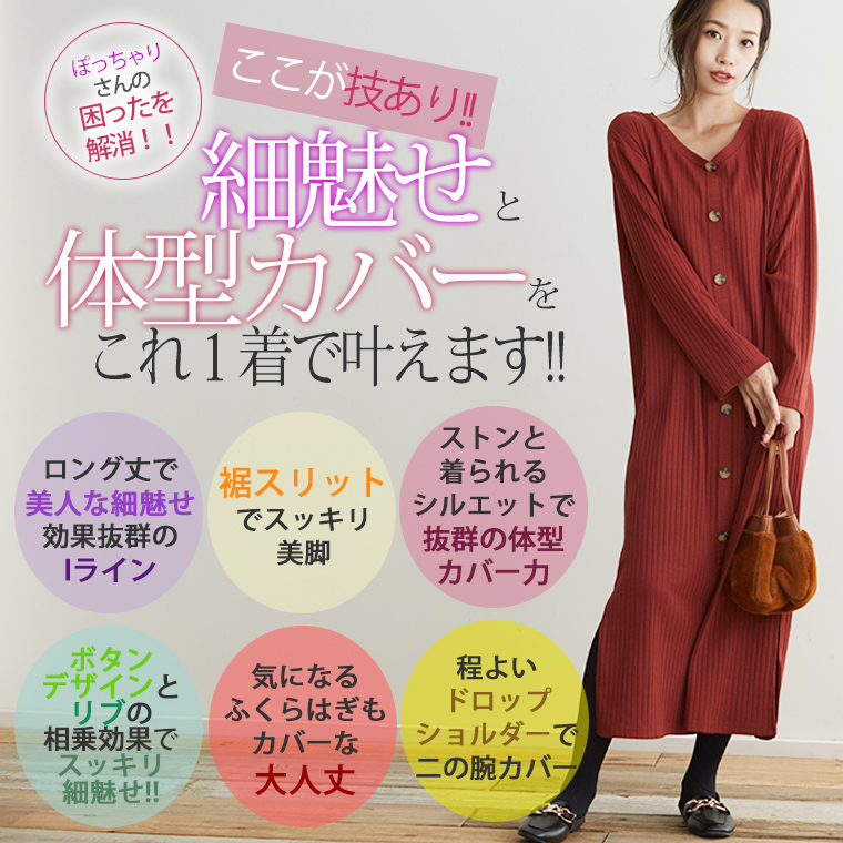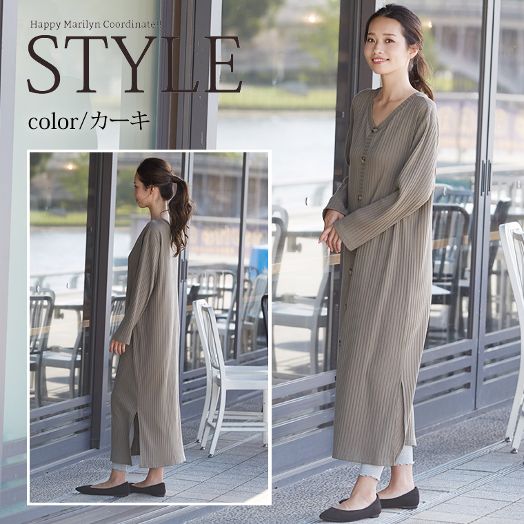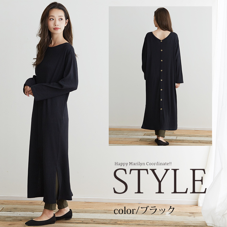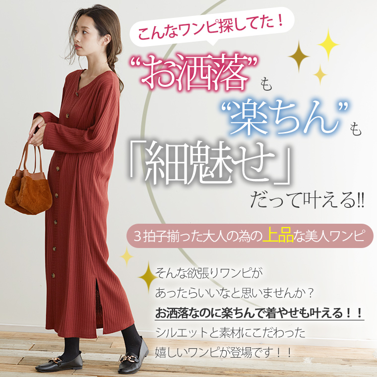 トレンドリブ×ボタンデザインでIラインの細魅せ効果を楽しむシンプルなのにお洒落な大人のワンピ