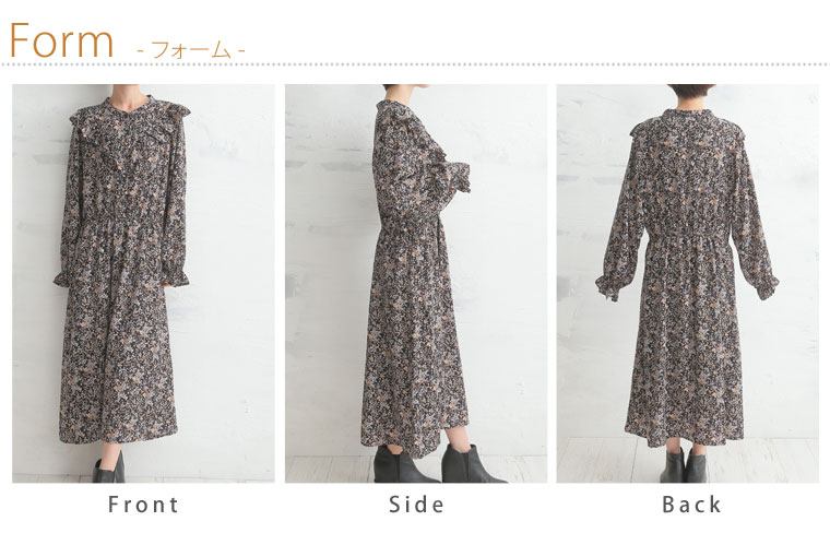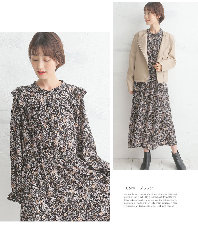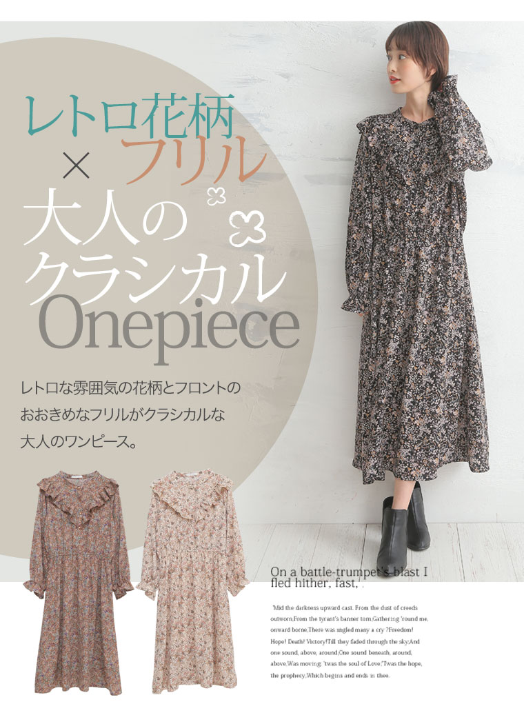 ちょっぴりレトロな花柄デザインで女性らしく着こなす。デシン花柄フリルワンピース