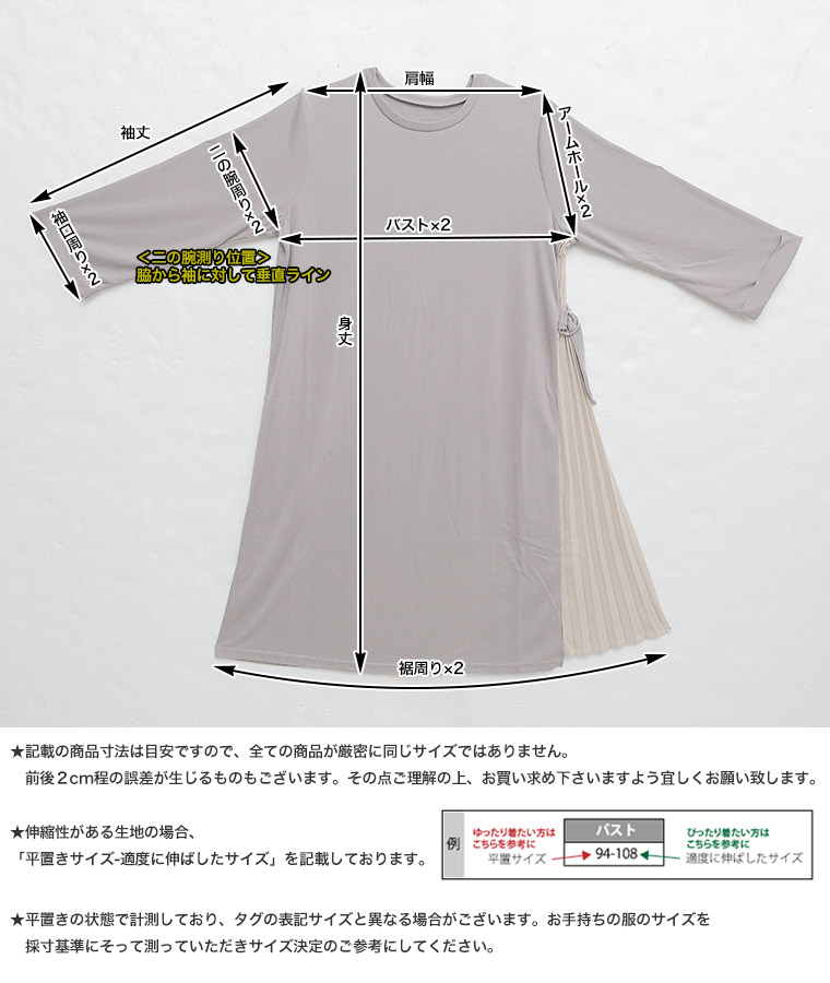 丈は膝下9cm、袖は手首のグリグリ下4cmの位置にきました。ゆったりと着用できました。サイドのプリーツ部分が透け感があるのでペチコートやボトムで調節した方がよさそうです。