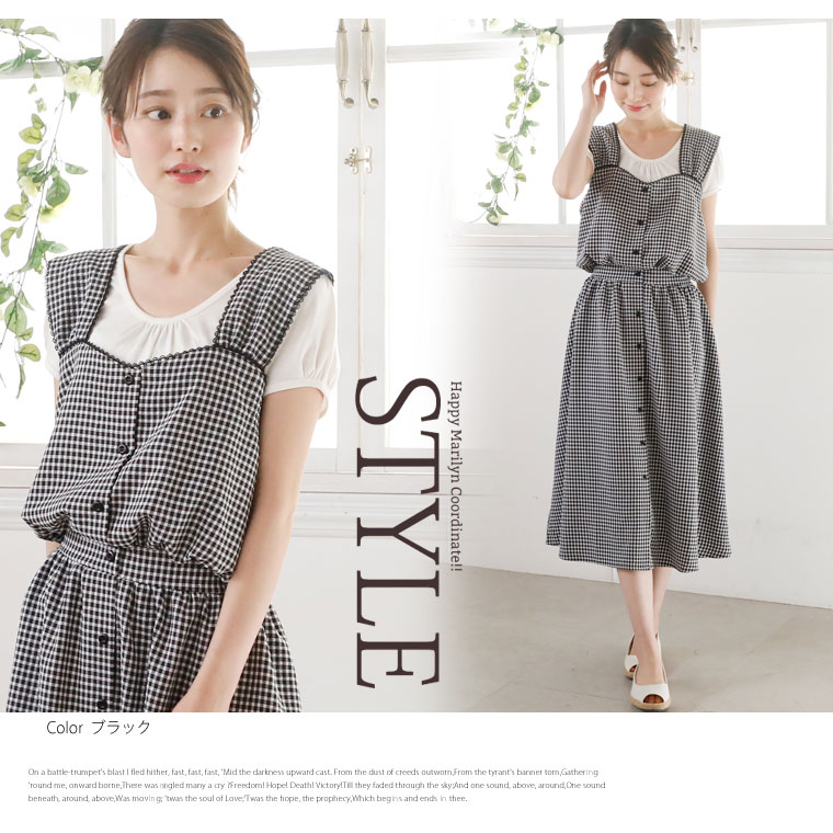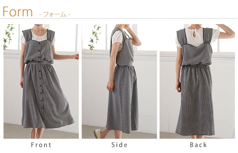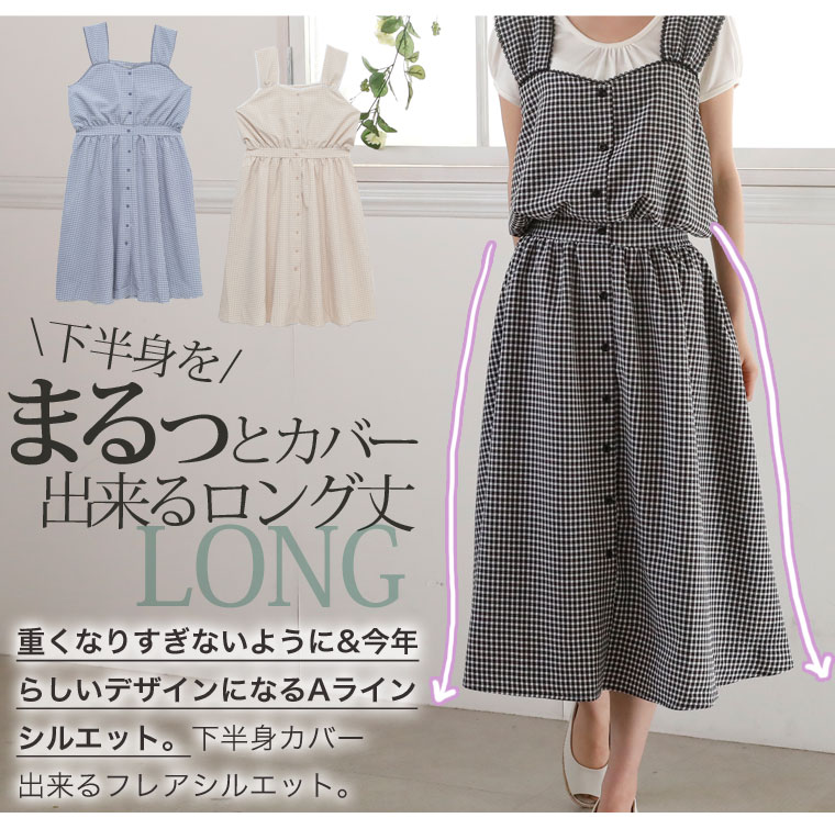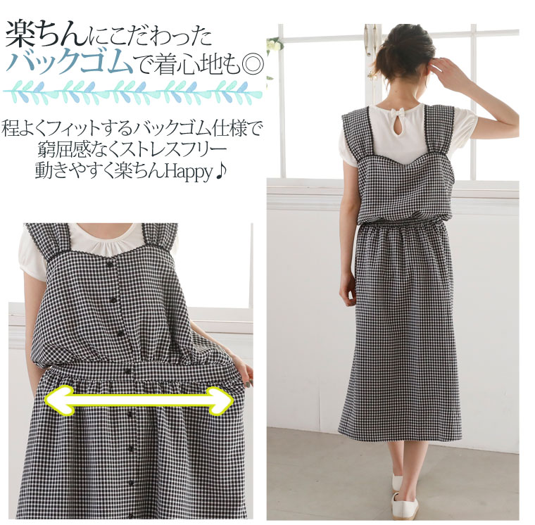 ゆったり楽ちんなサッカーギンガムチェックビスチェ風ロングワンピース
