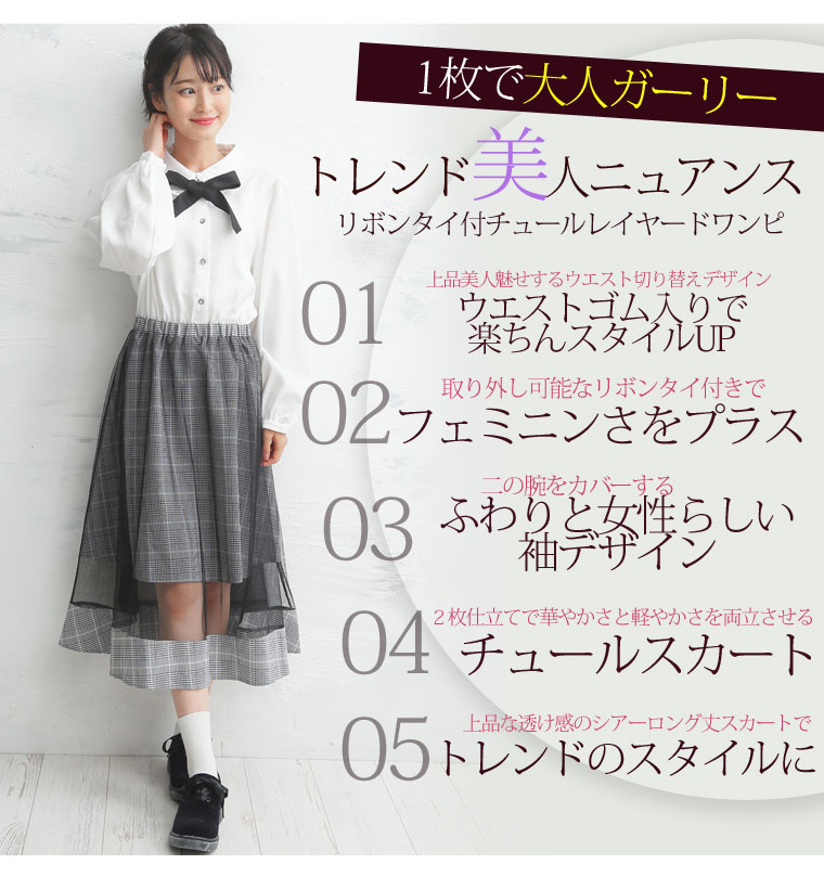 2way リボンタイ付きチュールレイヤードデザイン フリル襟ドッキングワンピ