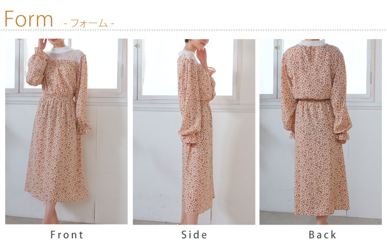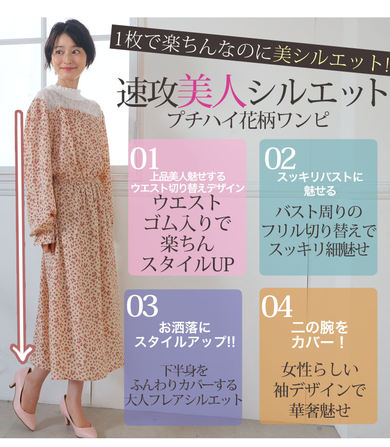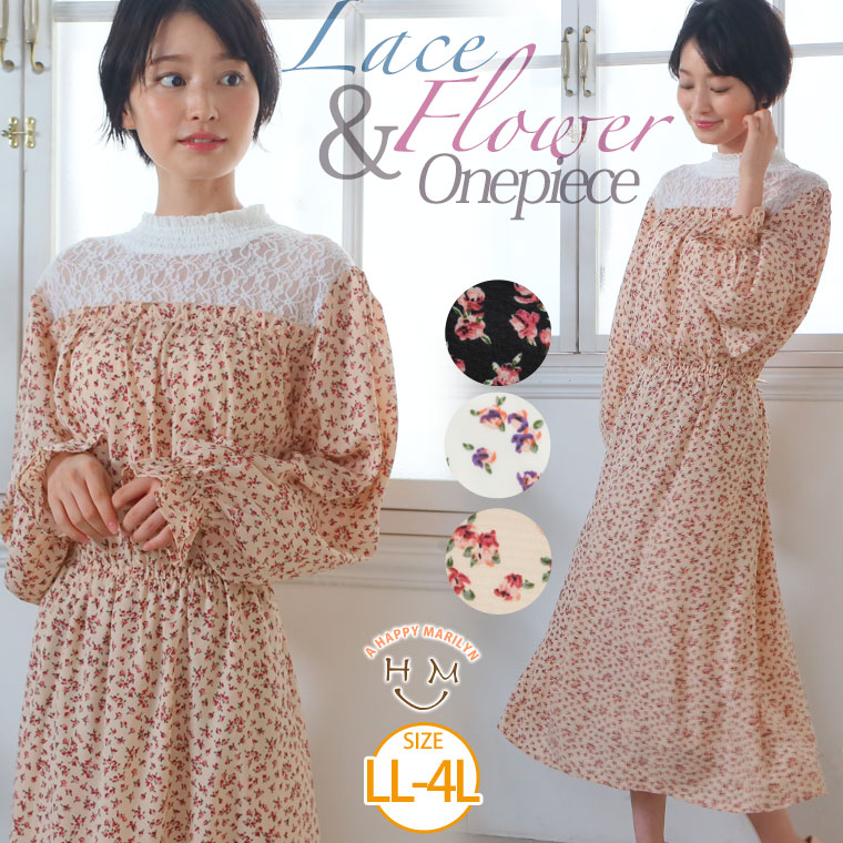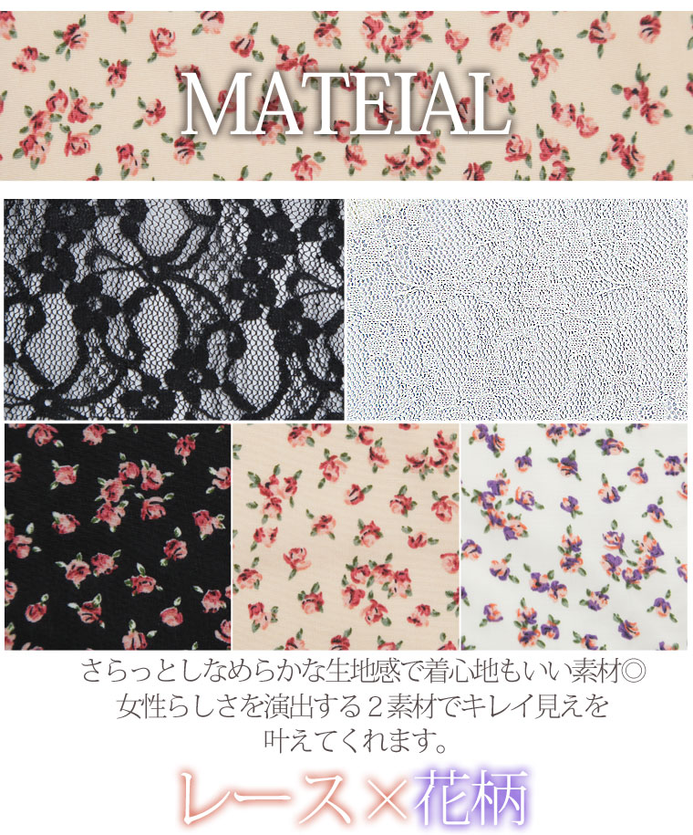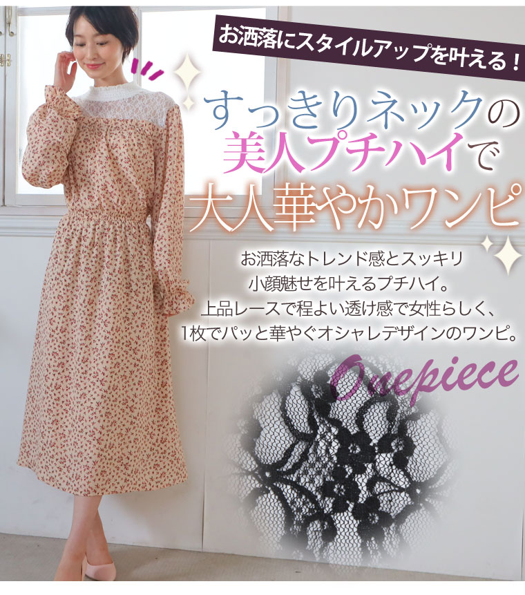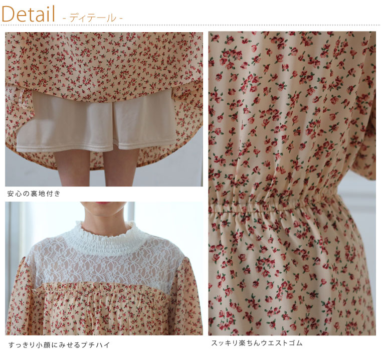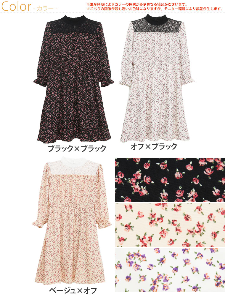 レース切替 デシン花柄プリント レイヤード風プチハイワンピース