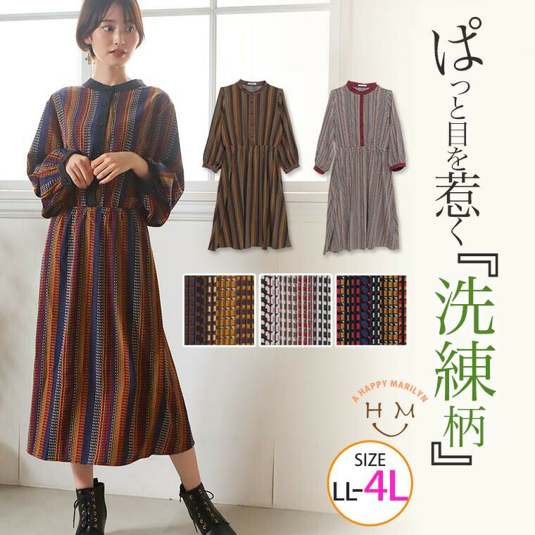 LL 3L 4L 秋 秋物 秋服 冬 冬物 冬服 ぽっちゃり ゆったり ジオメトリック柄 プリント 配色 バンドカラー ロングワンピース スタンドカラー | 大きいサイズの通販ならハッピーマリリン