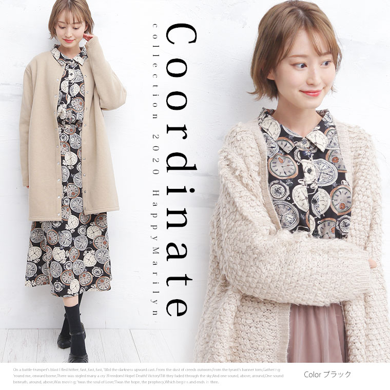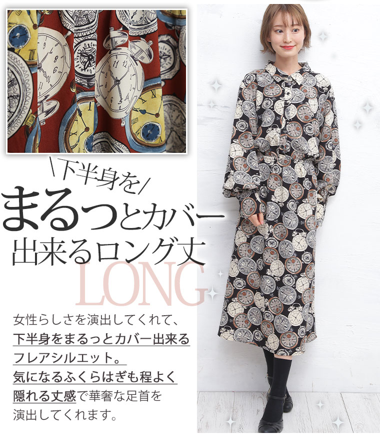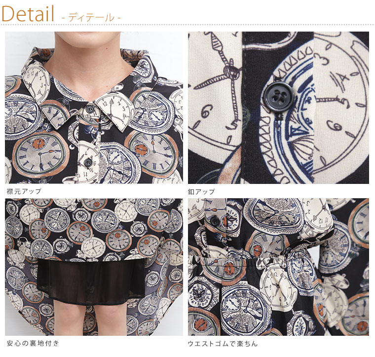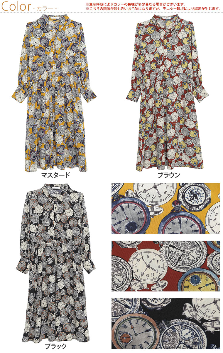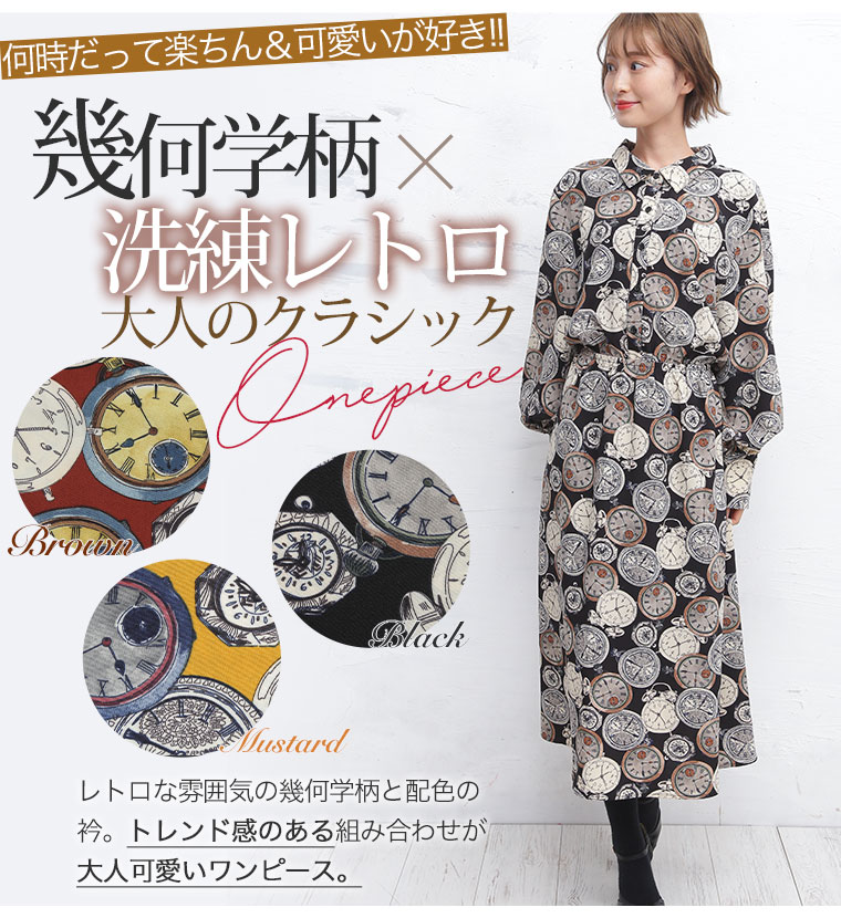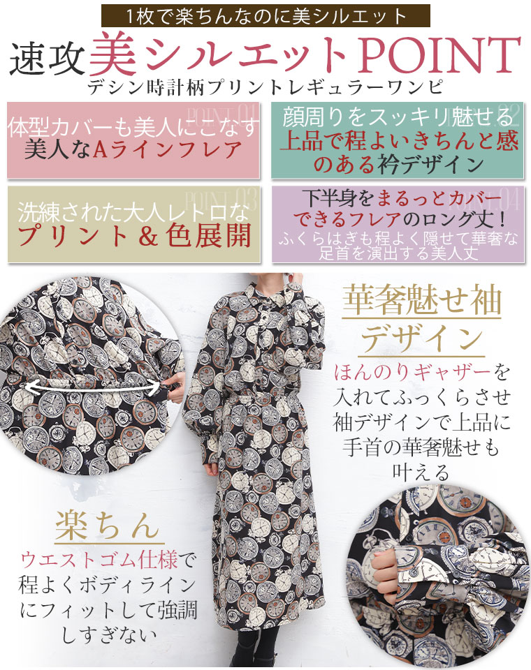 洗練されたレトロ風 デシン時計柄プリントワンピース