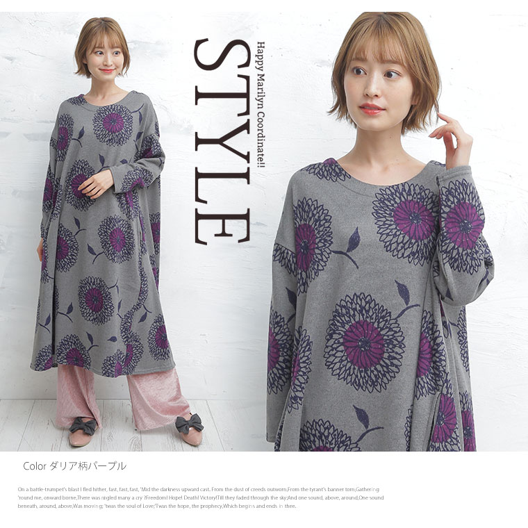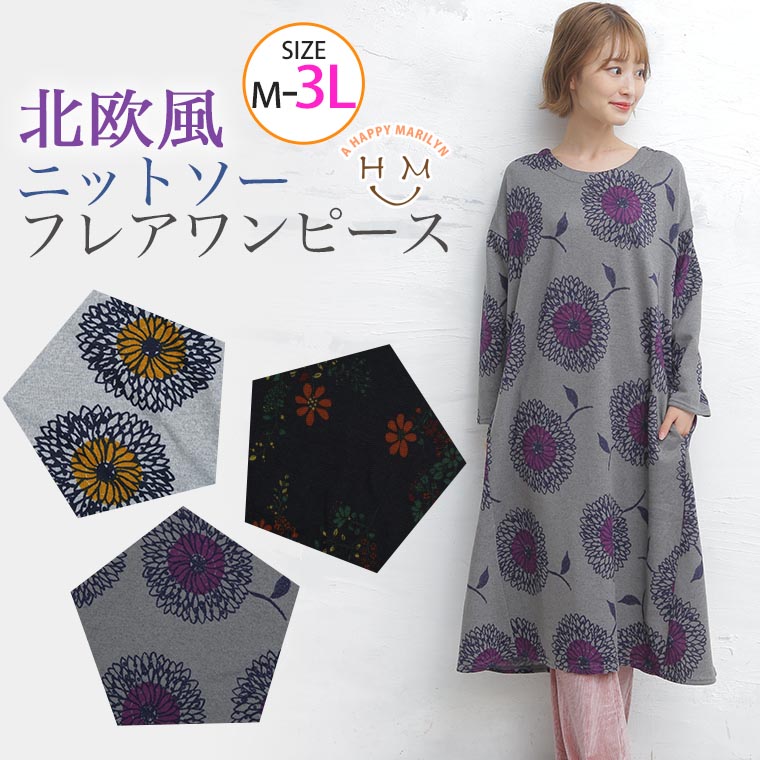 ワンピース ワンピ デザインワンピ LL 3L 冬 冬物 冬服 ぽっちゃり ゆったり お腹 太もも 胸周り お尻 腰周り 長袖 かわいい おしゃれ 北欧風 Aライン ニットソー フレア ワンピース