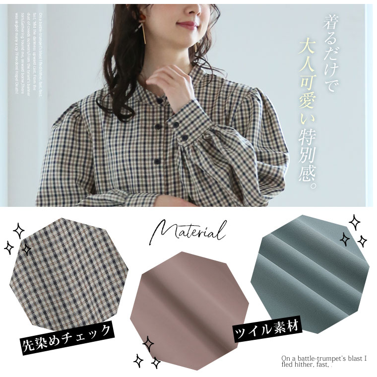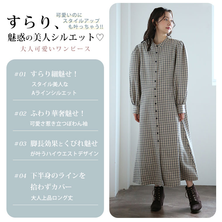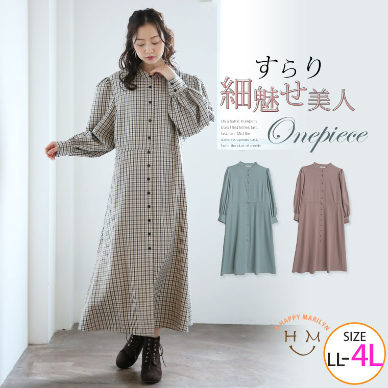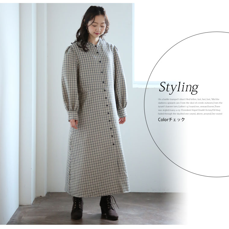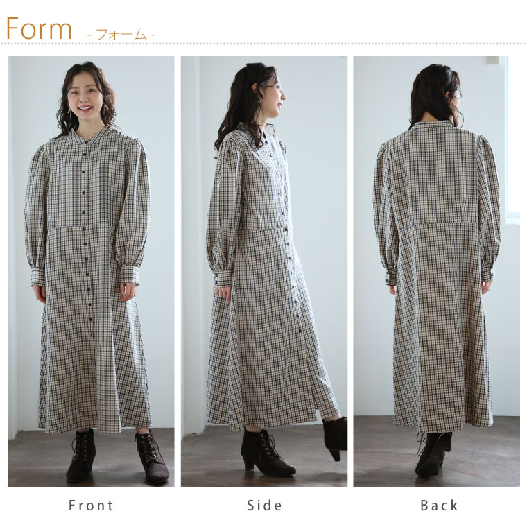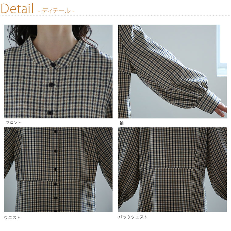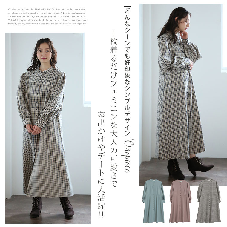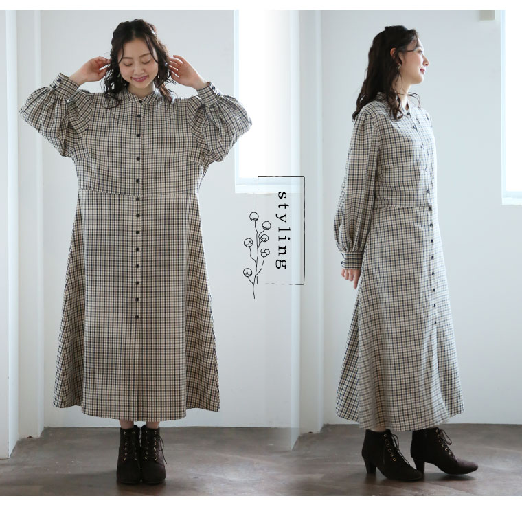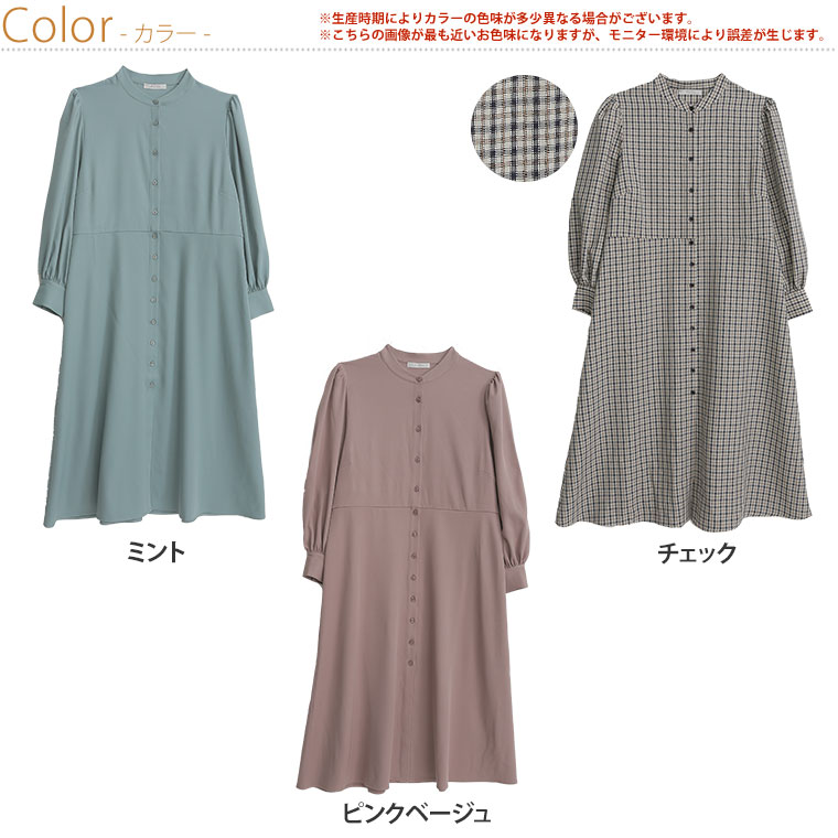 ぽわん袖とふんわりスカートがかわいい無地orチェックマオカラーワンピース