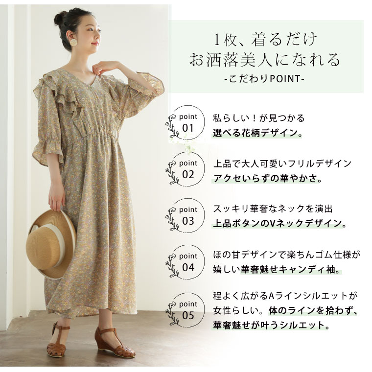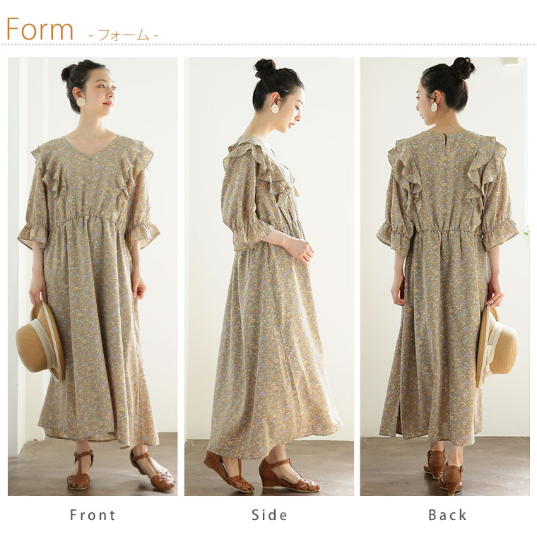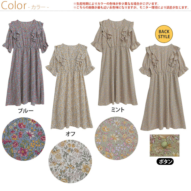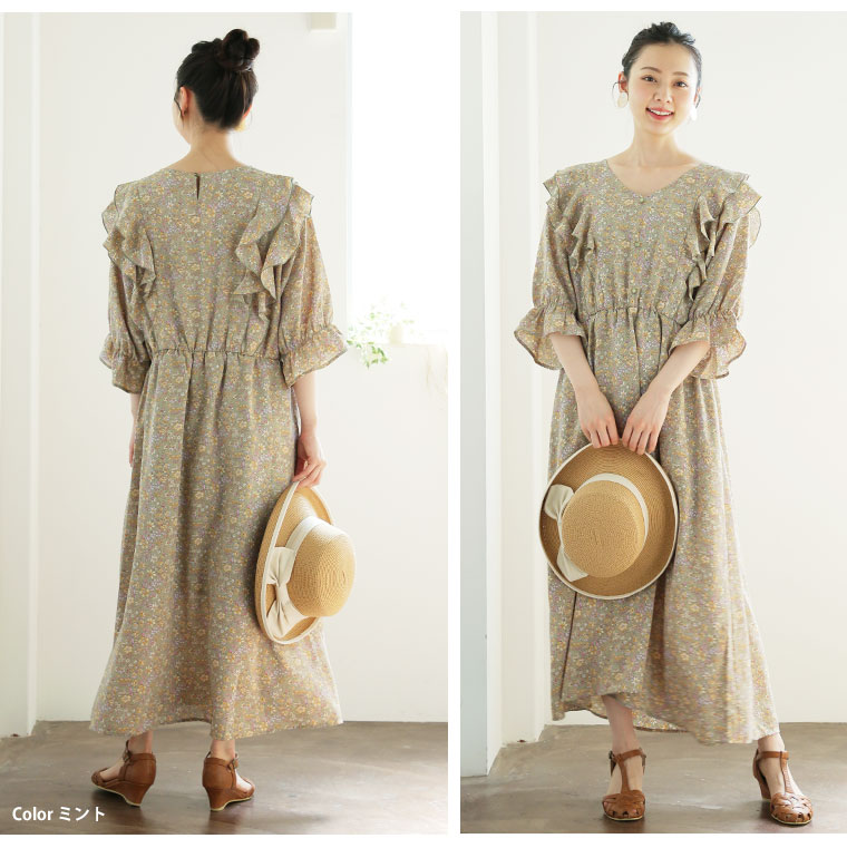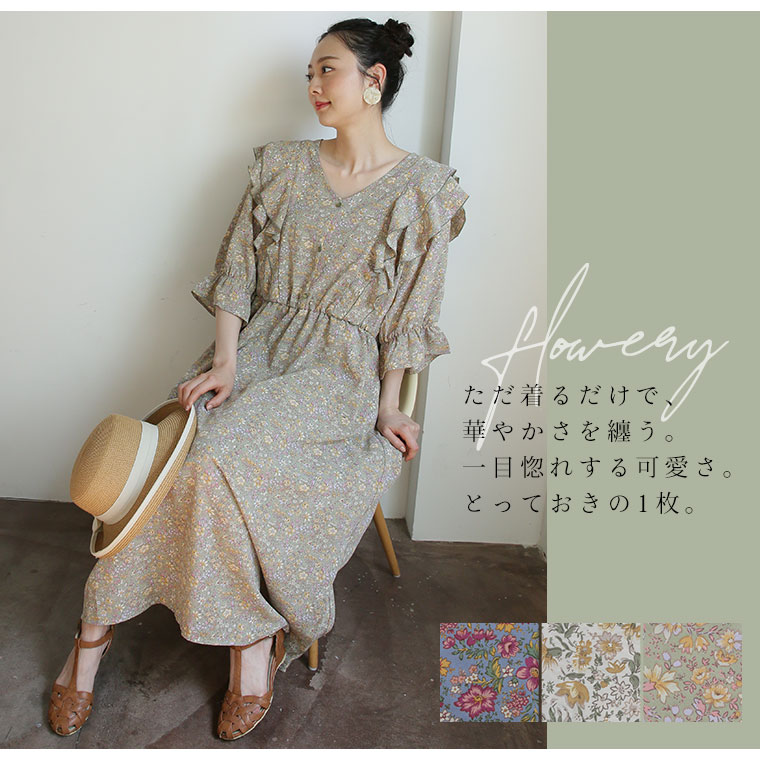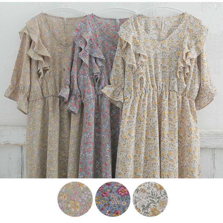 フリルと花柄でふわりとかわいいワンピース