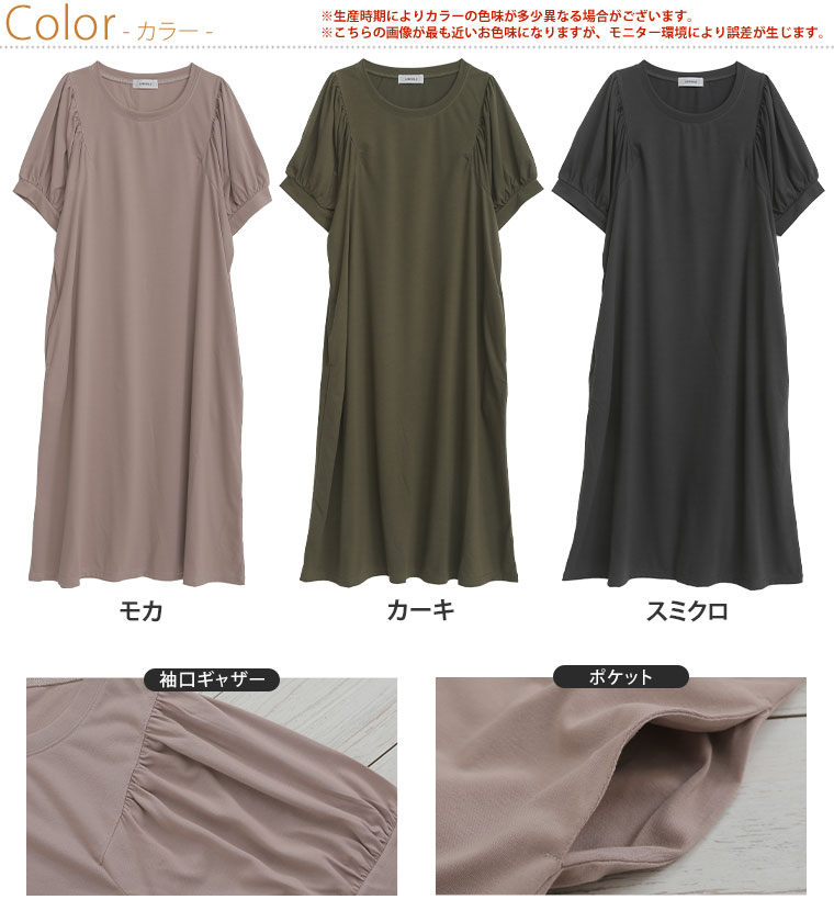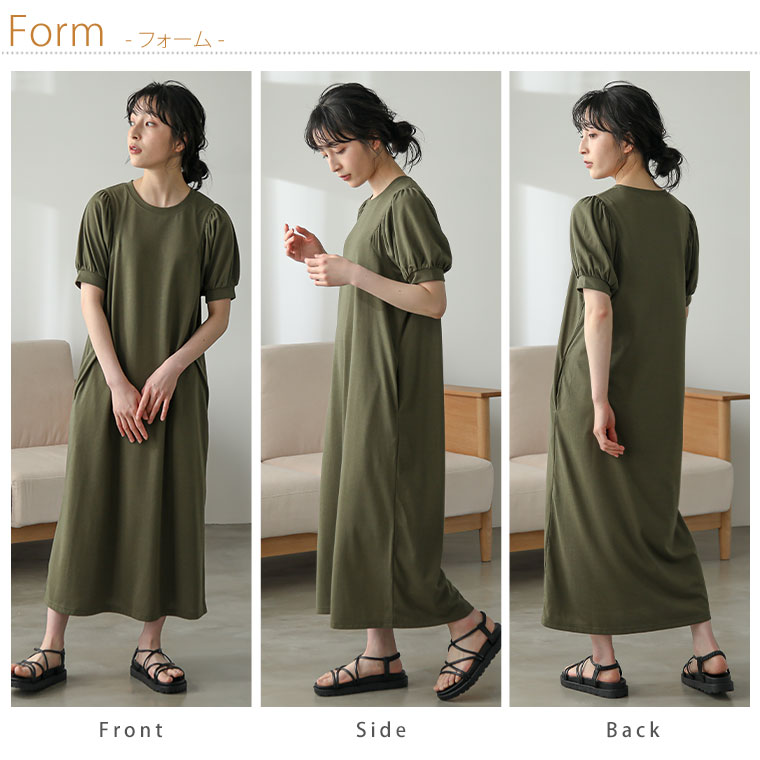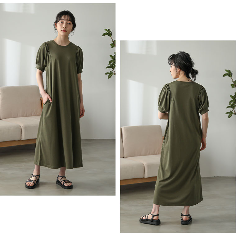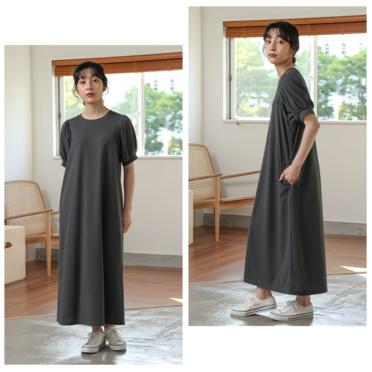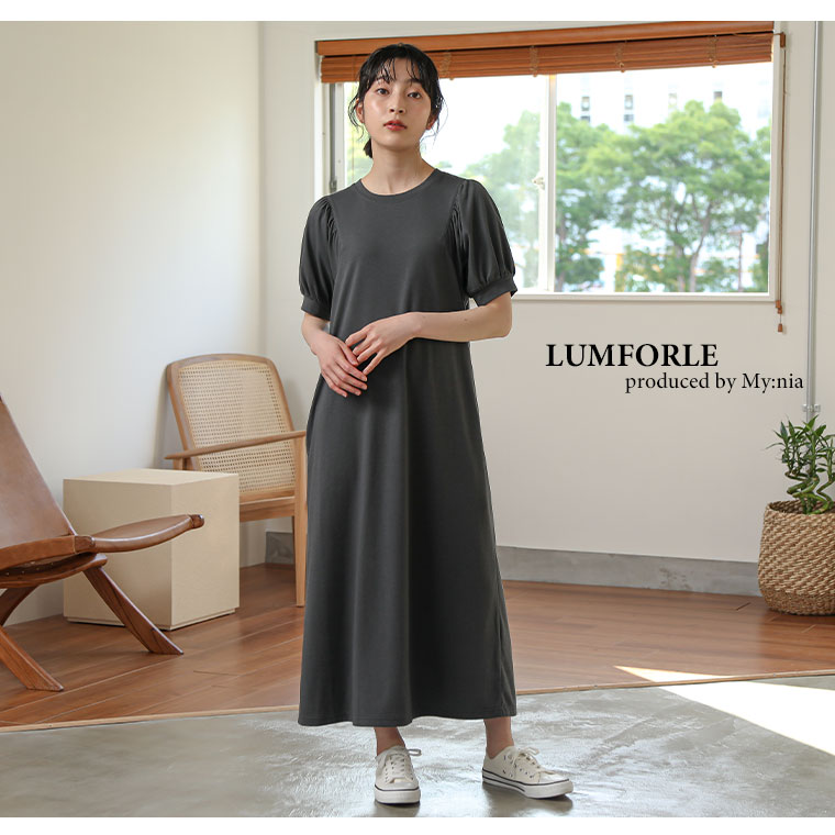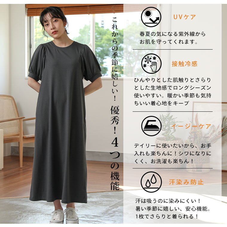 大きいサイズ 【LUMFORLE produced by My:nia】接触冷感 汗染み防止 UVケア 袖ギャザー 美人Aラインカットソーマキシワンピース