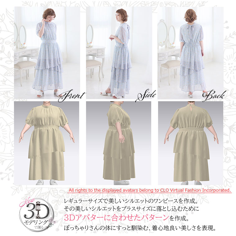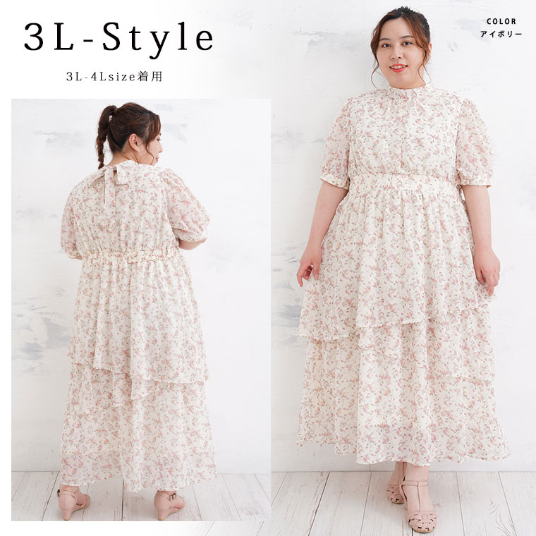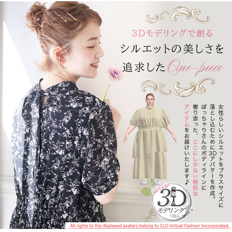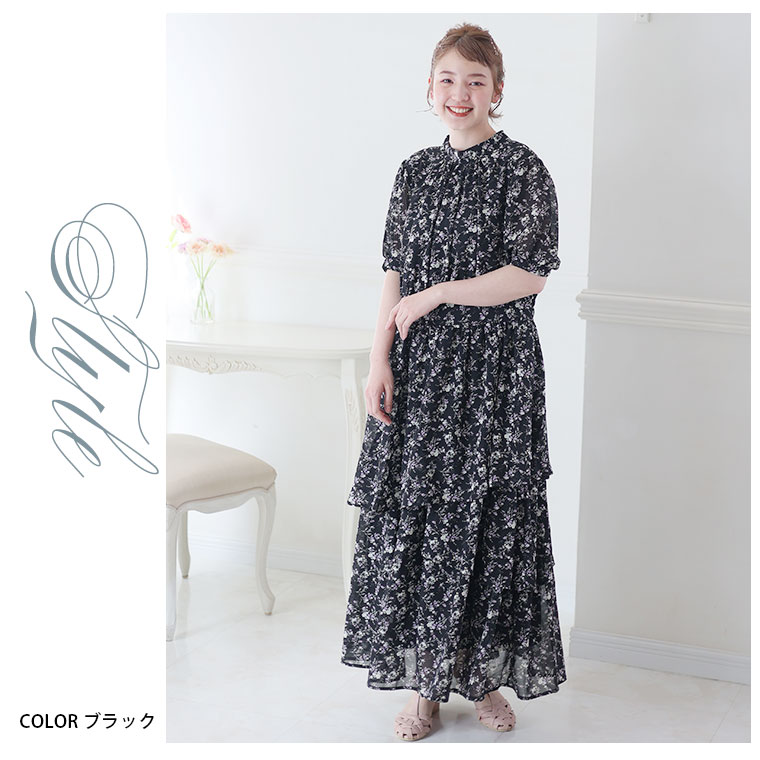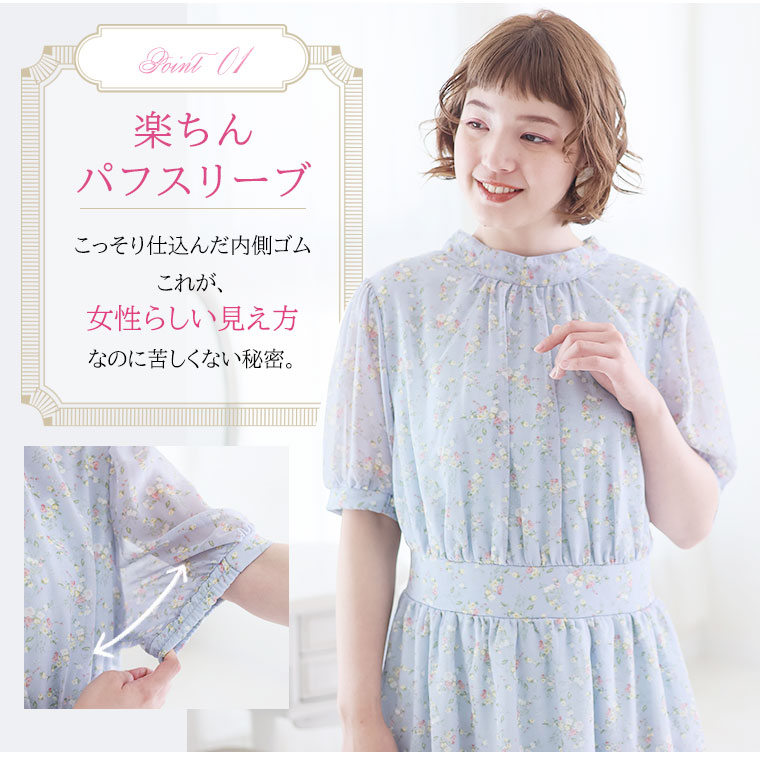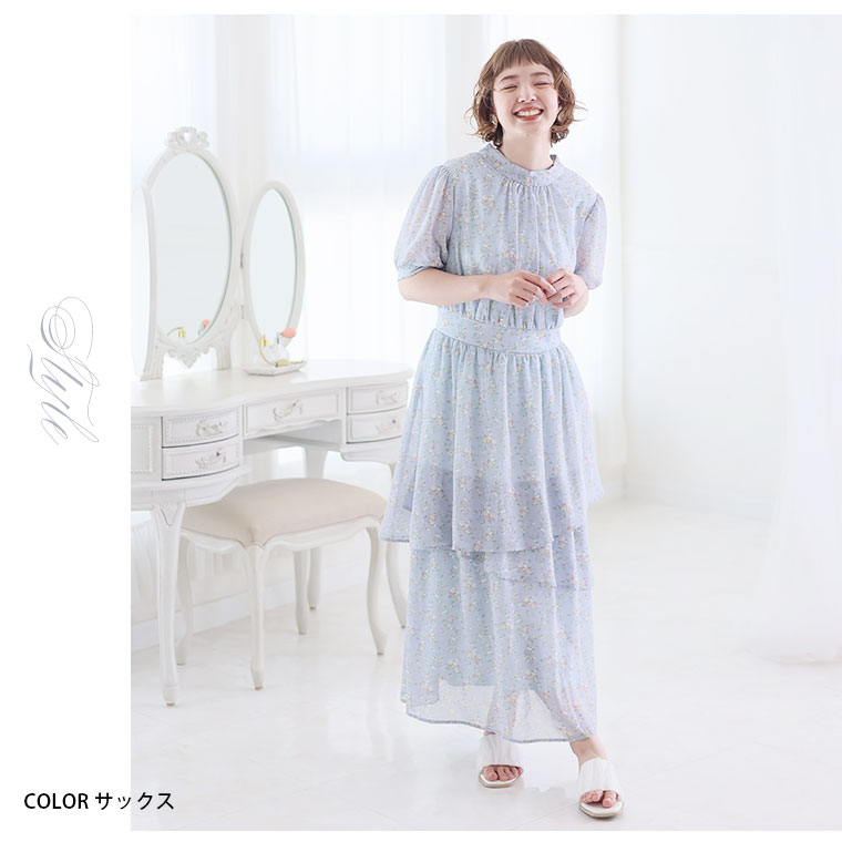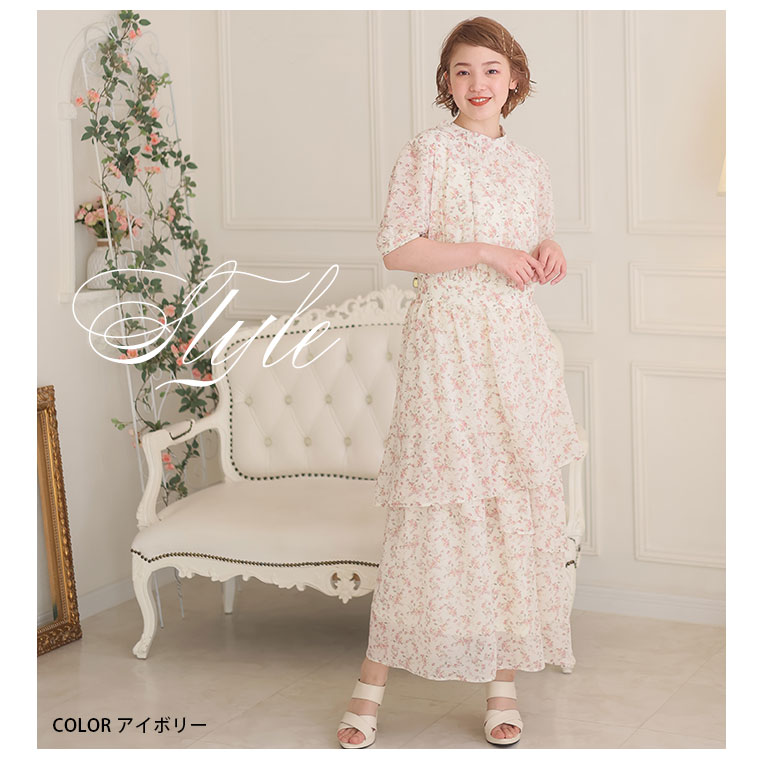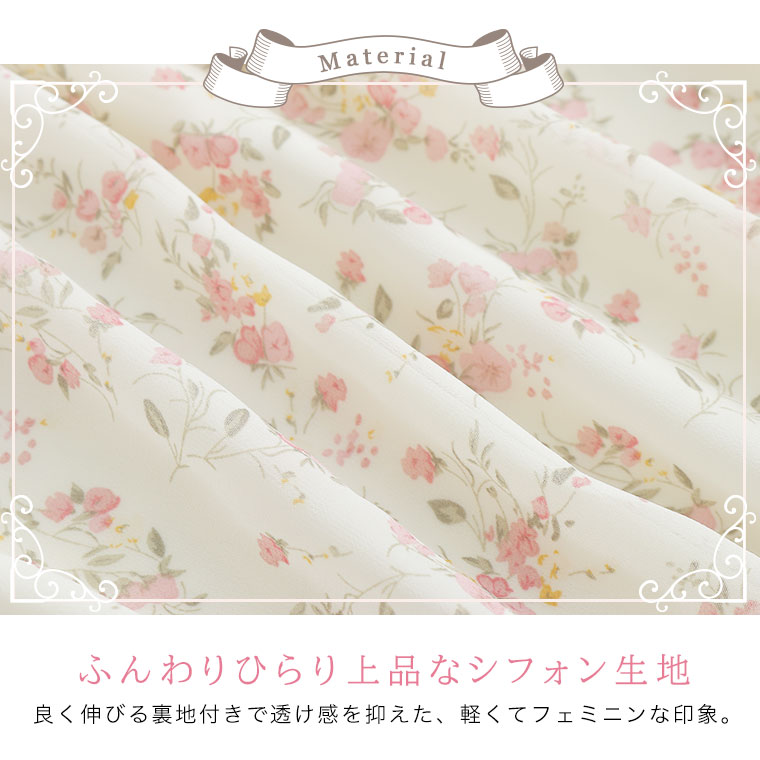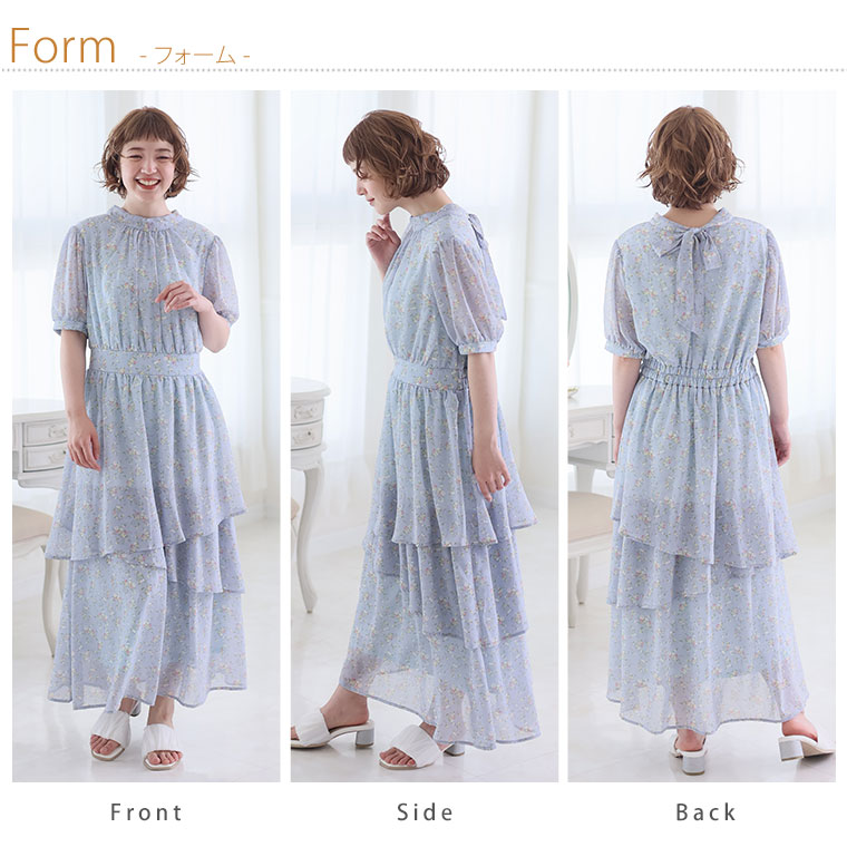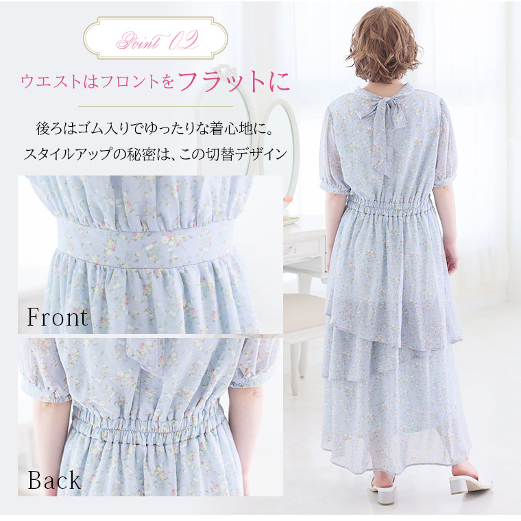 バックリボンと切り替えフリルで華やかにかわいい花柄ワンピース