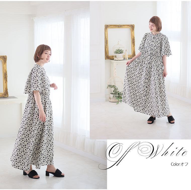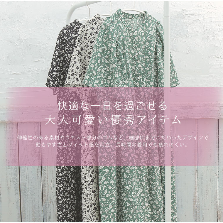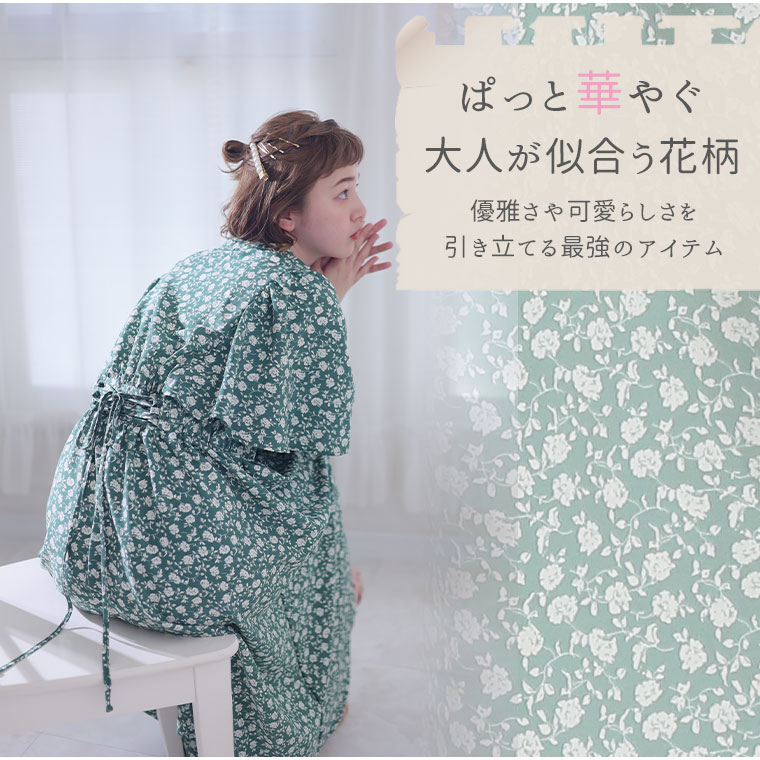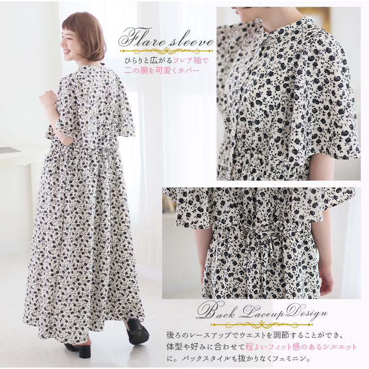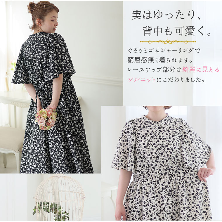 後ろ姿もかわいいバックレースアップの花柄ワンピース